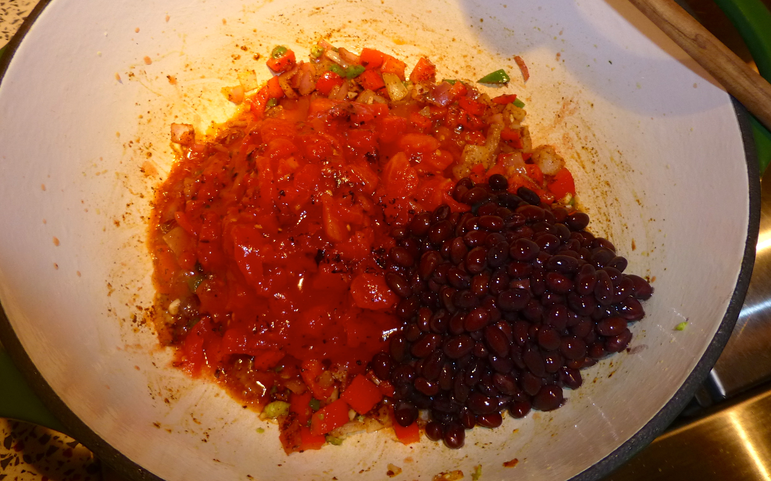 Once the veggies have cooked for a few minutes with the spices stirred in, I add a can each of fire-roasted diced tomatoes and drained black beans. After each addition, I give the goodies a big stir and let the flavors combine before adding the next item. How easy is this?