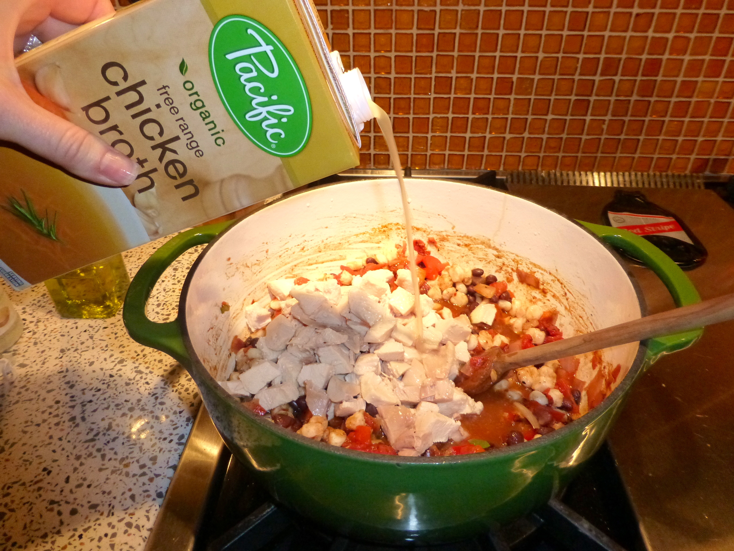 Guys, it’s CHICKEN TIME. I have made this soup before with chicken breasts that I’ve poached myself. This time, I simply chopped up a rotisserie bird. Into the pot, along with chicken stock– enough to cover the ingredients. (You could easily omit the chicken and use veggie stock for a no-meat version.)