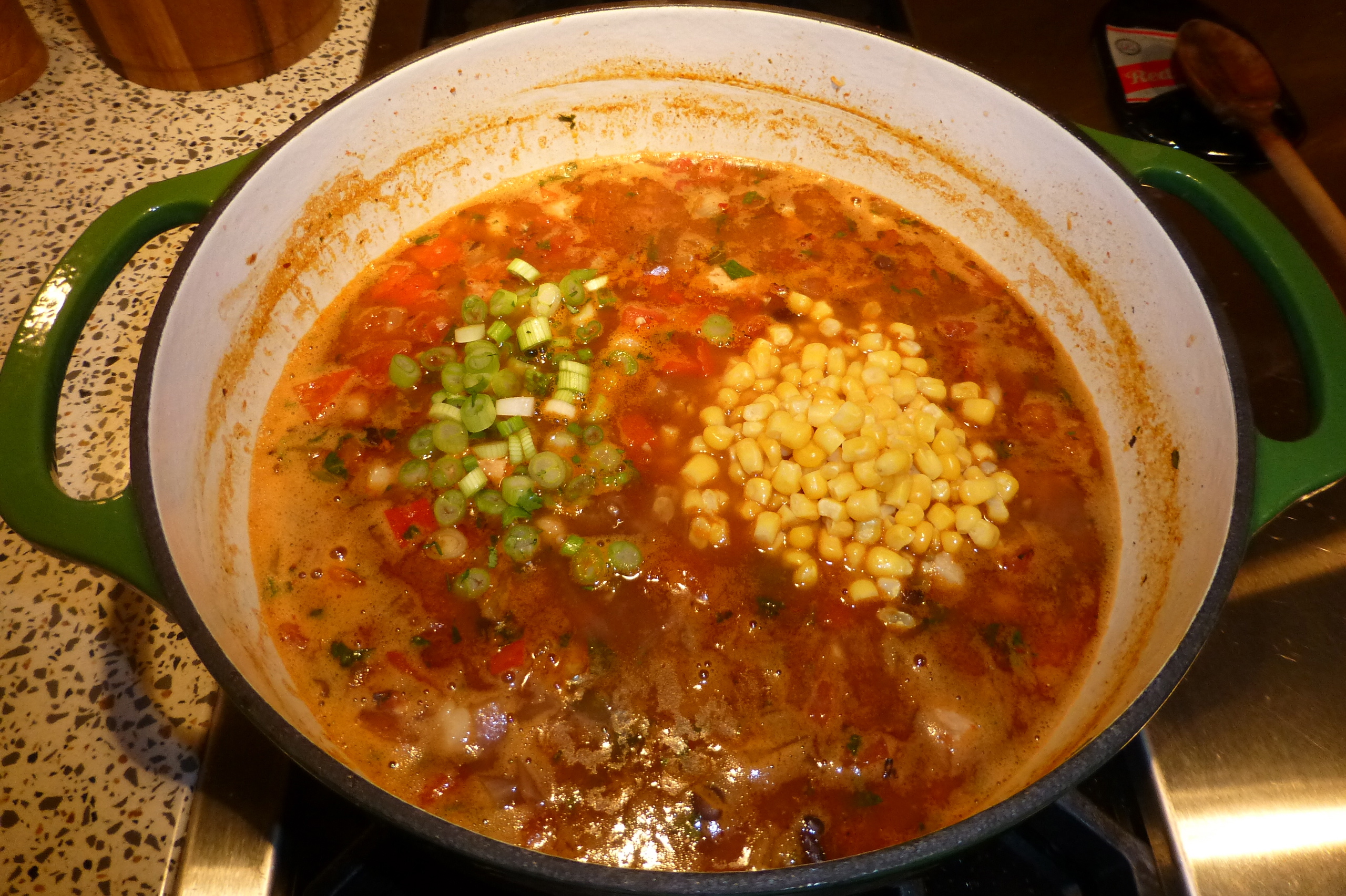 Add cooked chicken and enough chicken stock to cover the ingredients. Stir in most of the cilantro and green onion, reserving a small amount for garnishing. Simmer for 30 minutes, stirring occasionally.