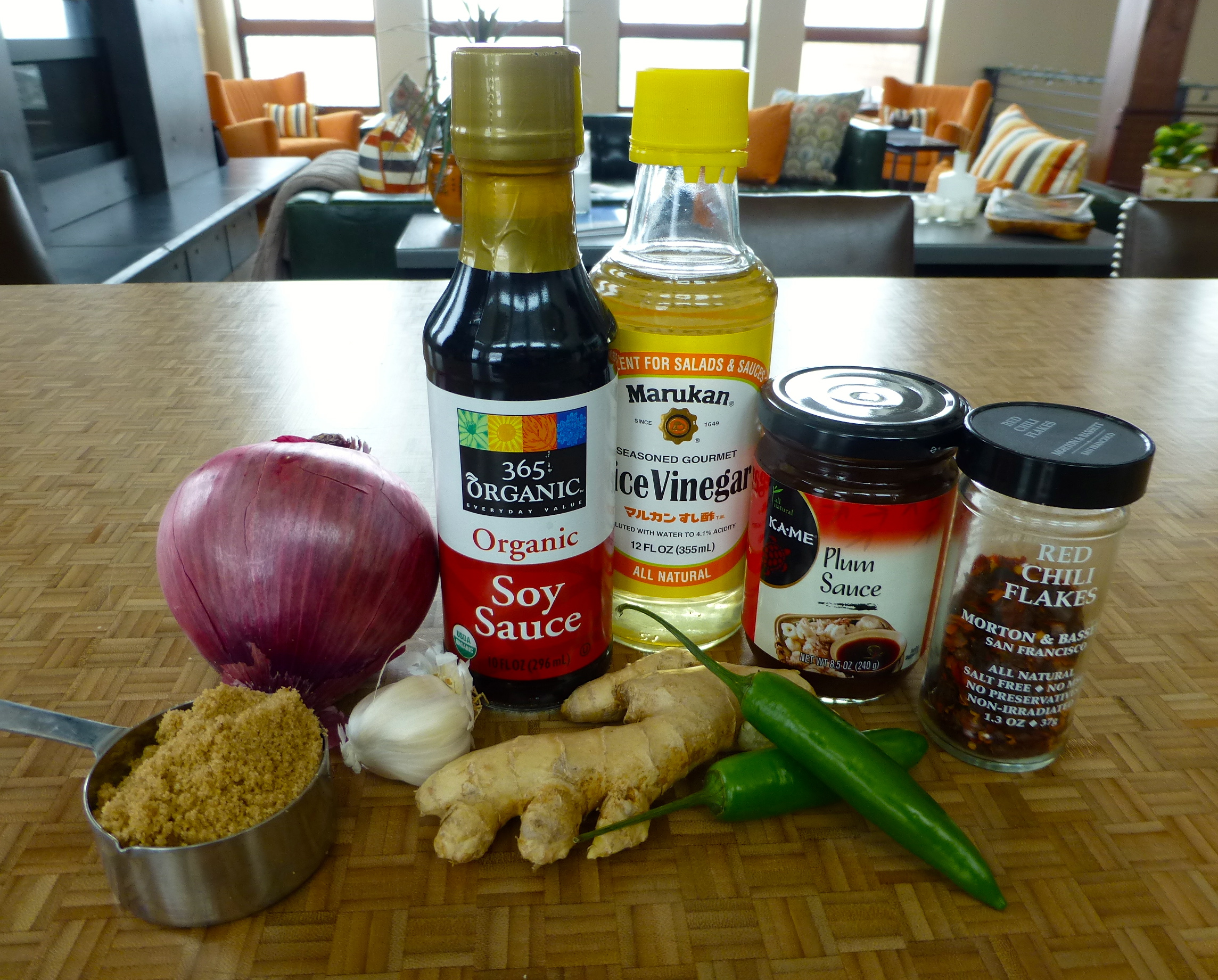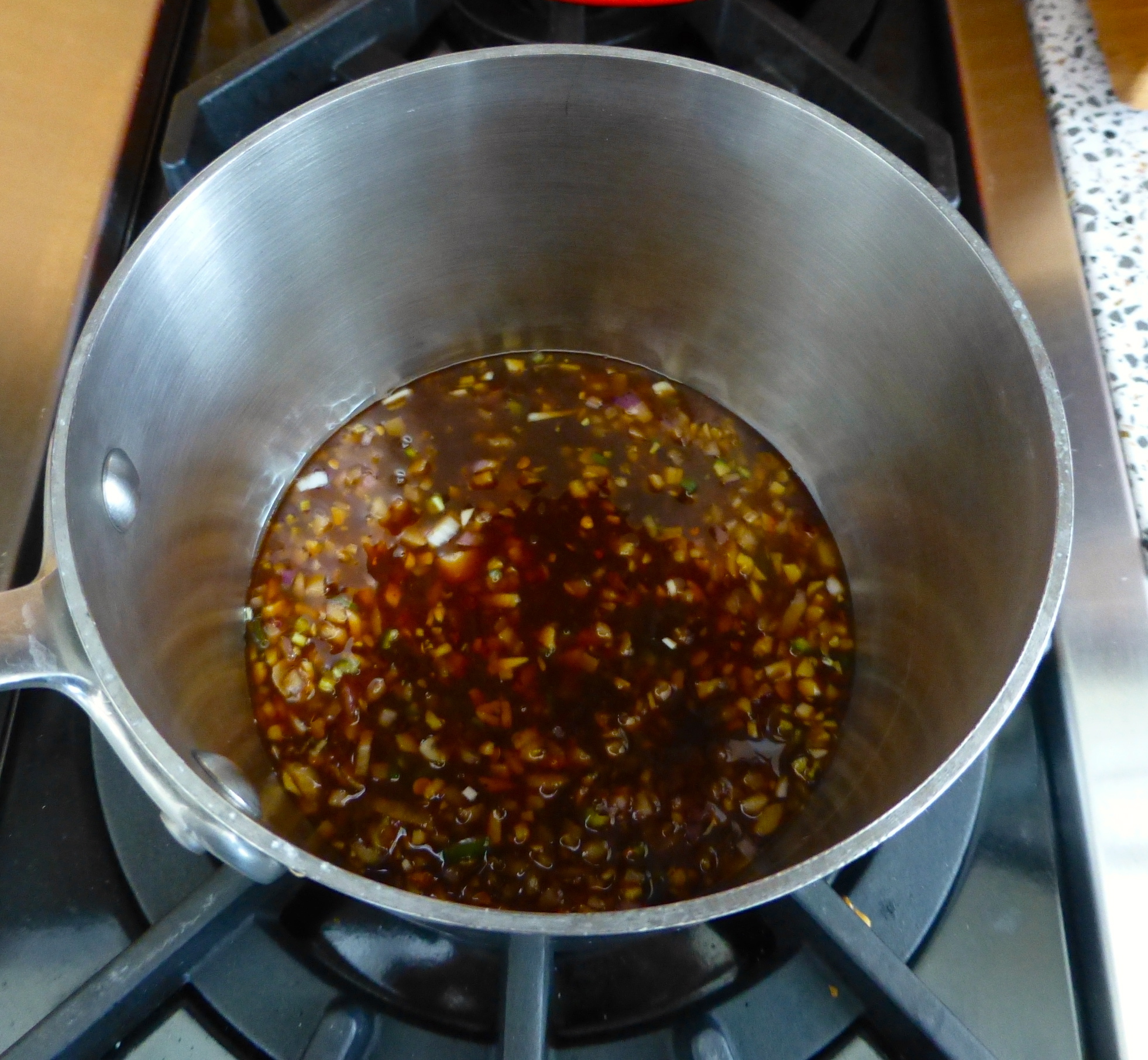 While they got nice and crispy and browned, I made the sauce. The wing sauce is a pretty simple combo of plum sauce, soy sauce, and rice vinegar, jazzed up with some fresh ingredients.