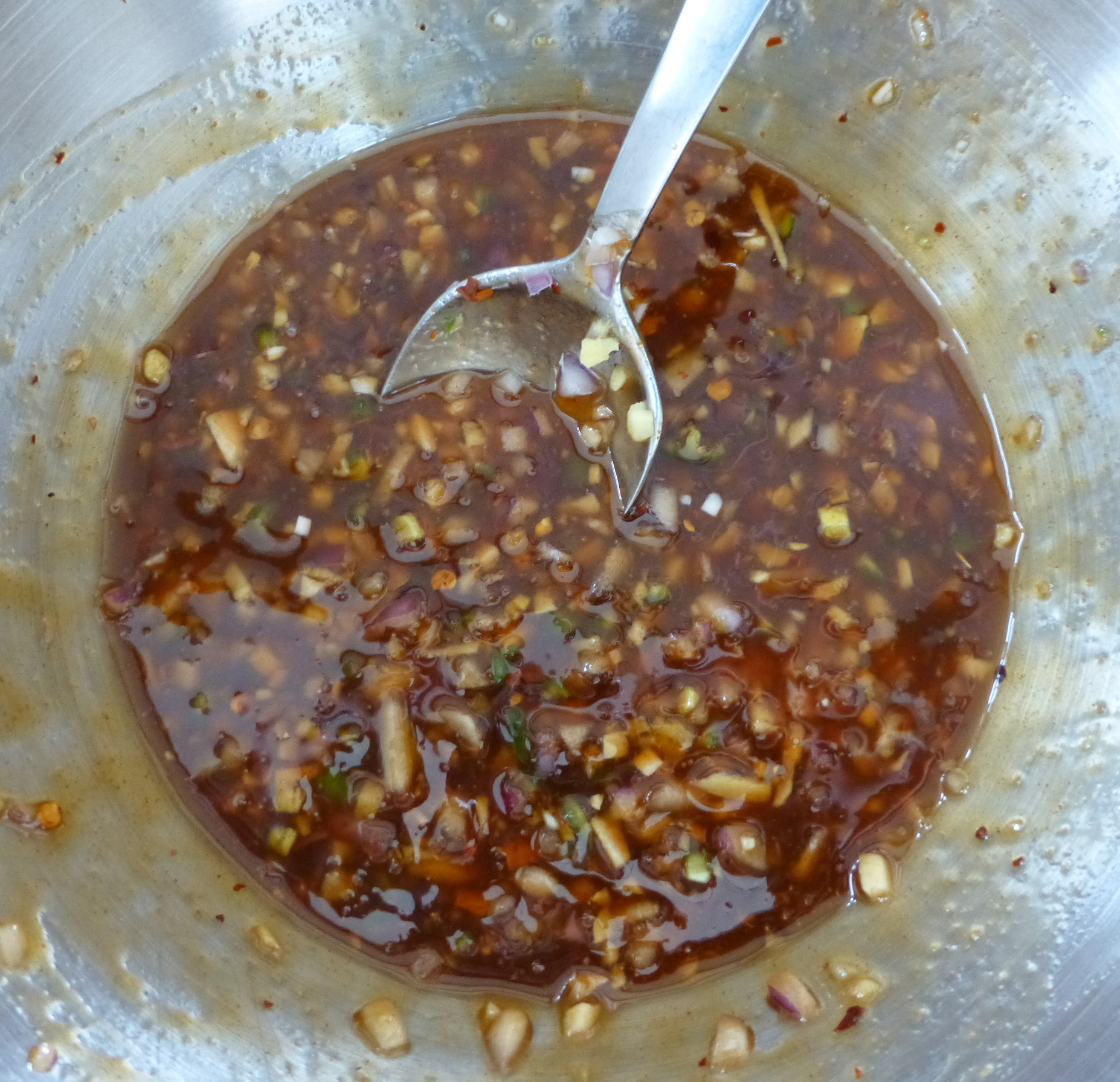 I finely chopped garlic, ginger, red onion, and a Serrano pepper. All of it went into a bowl, along with a bit of brown sugar and crushed red pepper (two kinds of heat!).