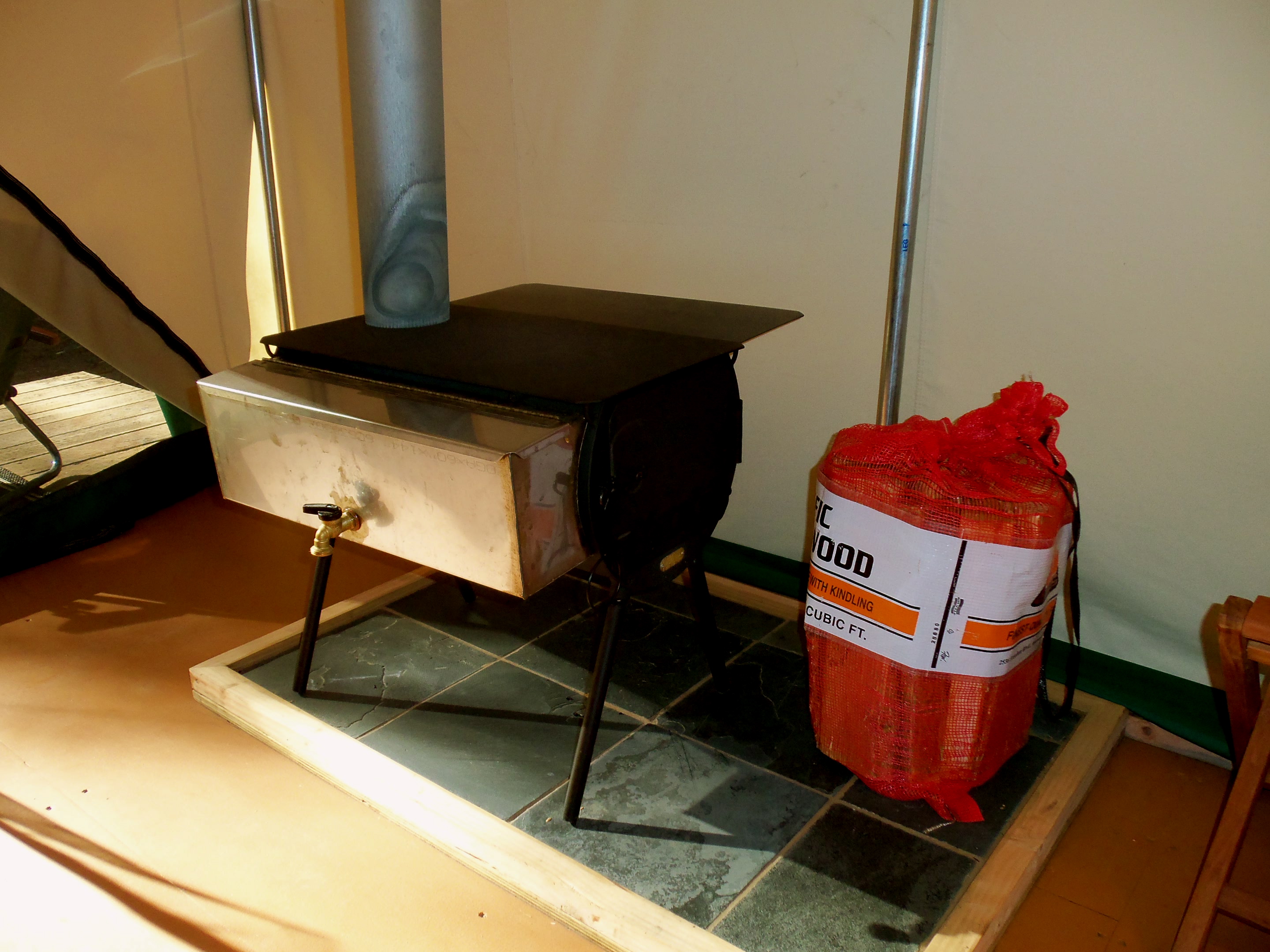 Two handmade wooden chairs with little attached side tables were ready for fireside lounging. The tent’s doors opened out onto a big wooden deck. Inside the tent, we saw a queen bed with a beautiful rustic headboard and soft, cozy linens. We saw fresh, clean towels and bath products for our use at the showers. We saw electricity for charging phones and cameras. We saw a big wood stove and a fresh pile of redwood to keep us warm.
