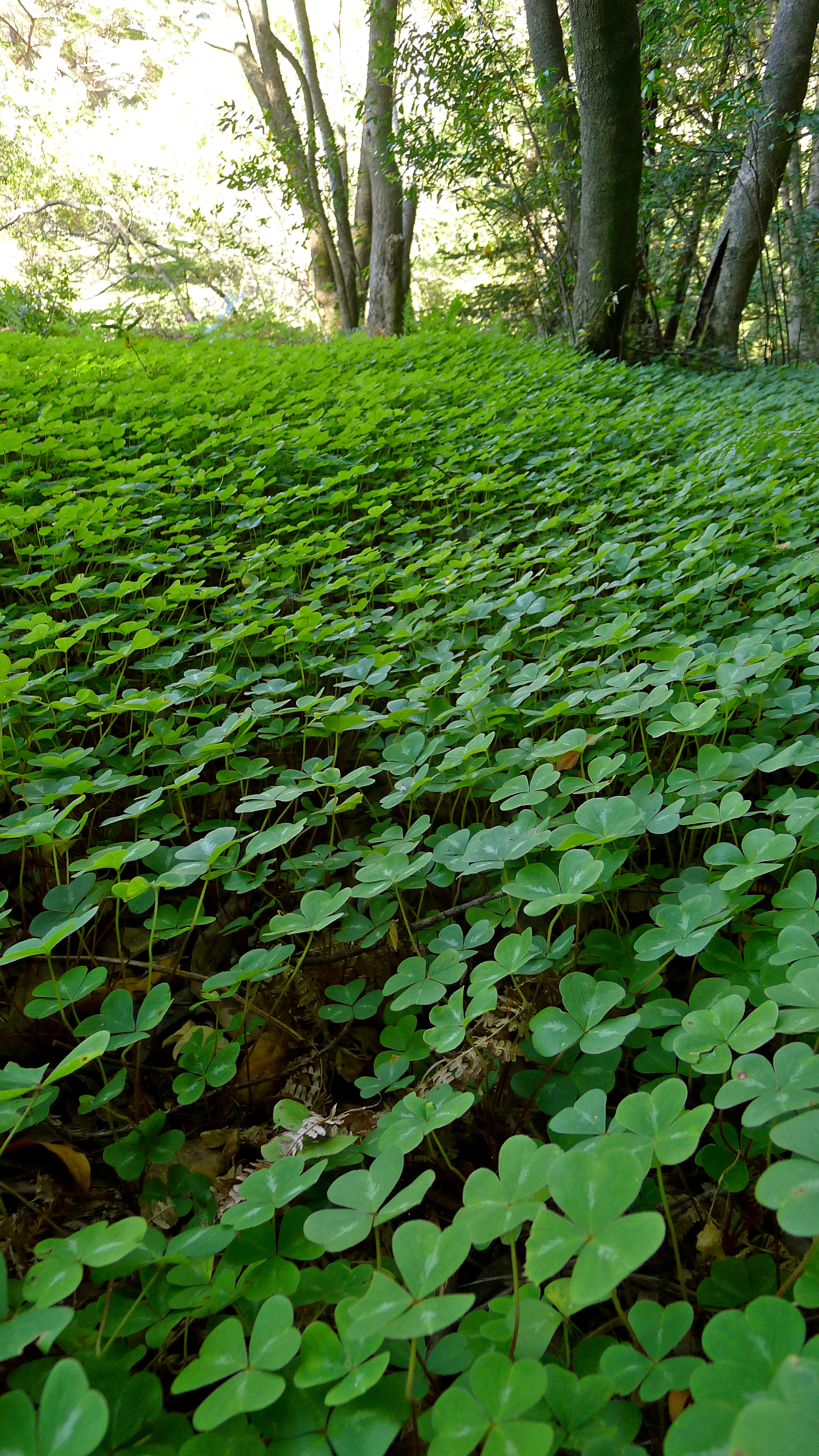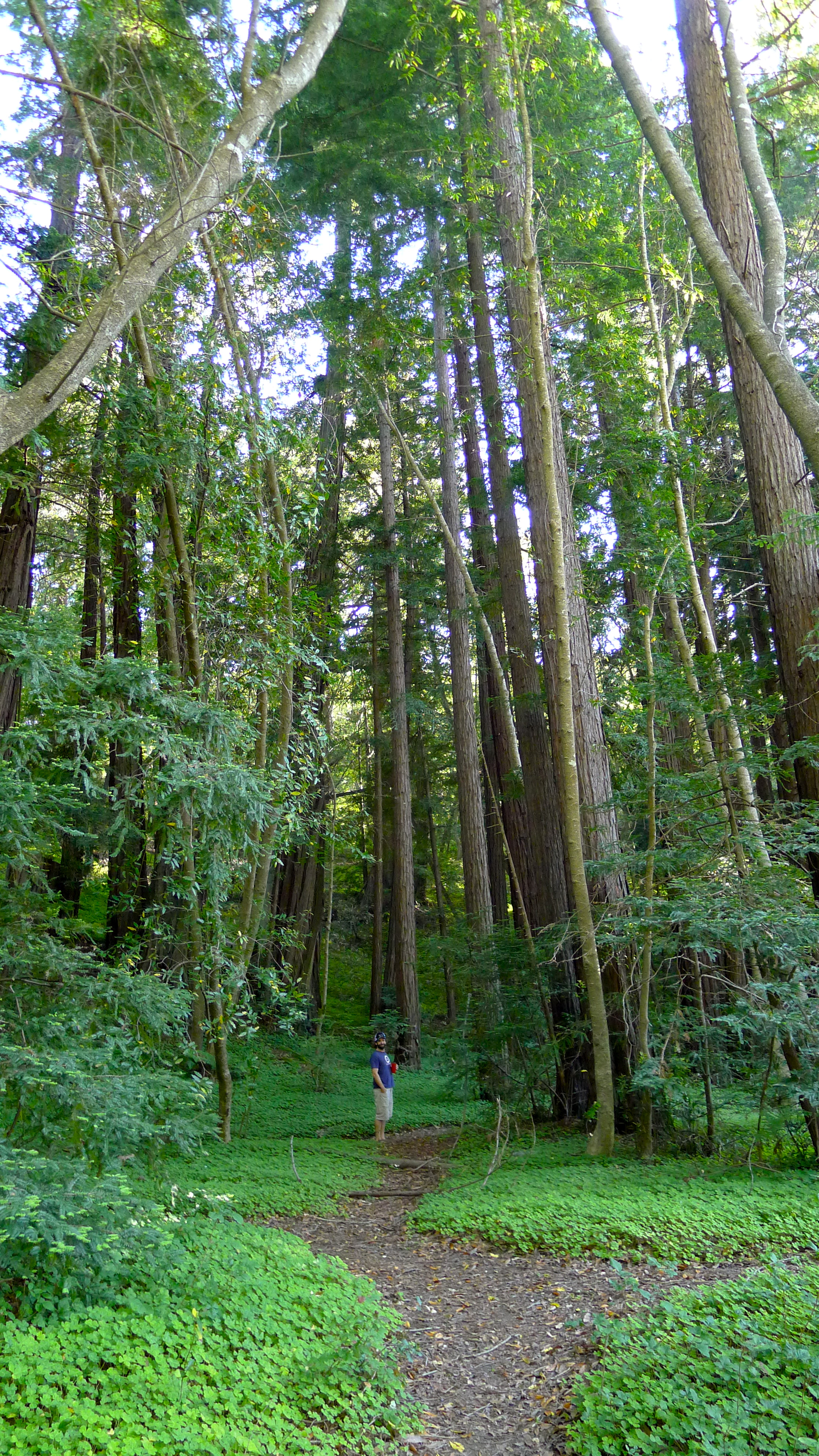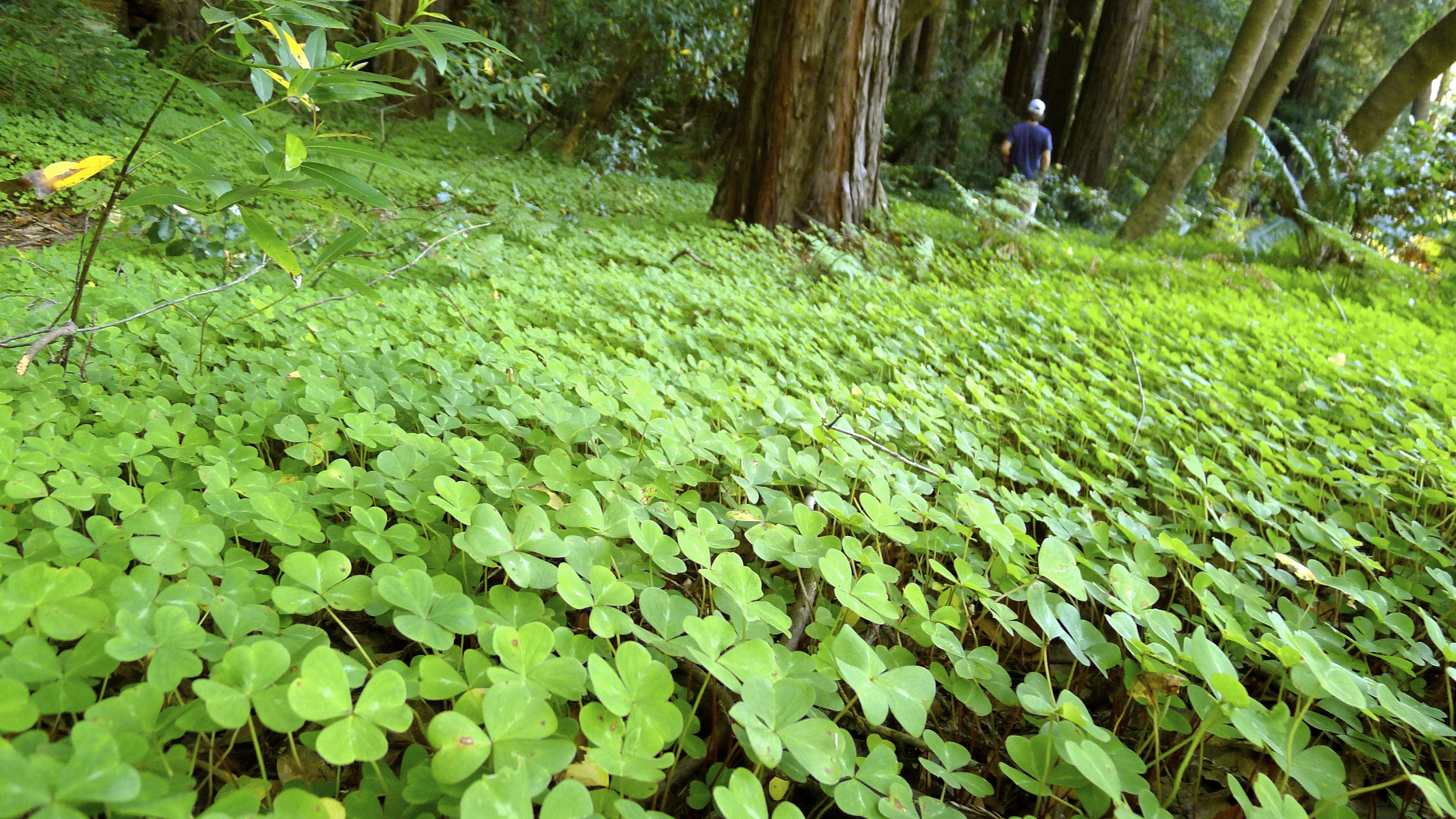 The trail led us into a grove of younger trees. Flanked on either side by a carpet of clover, John and I separated and quietly experienced the magic of the forest on our own for a few minutes. We savored the feeling of awe and commented on what a cool perspective huge trees brought. I felt tiny. I couldn’t resist a gratitude-filled hug.