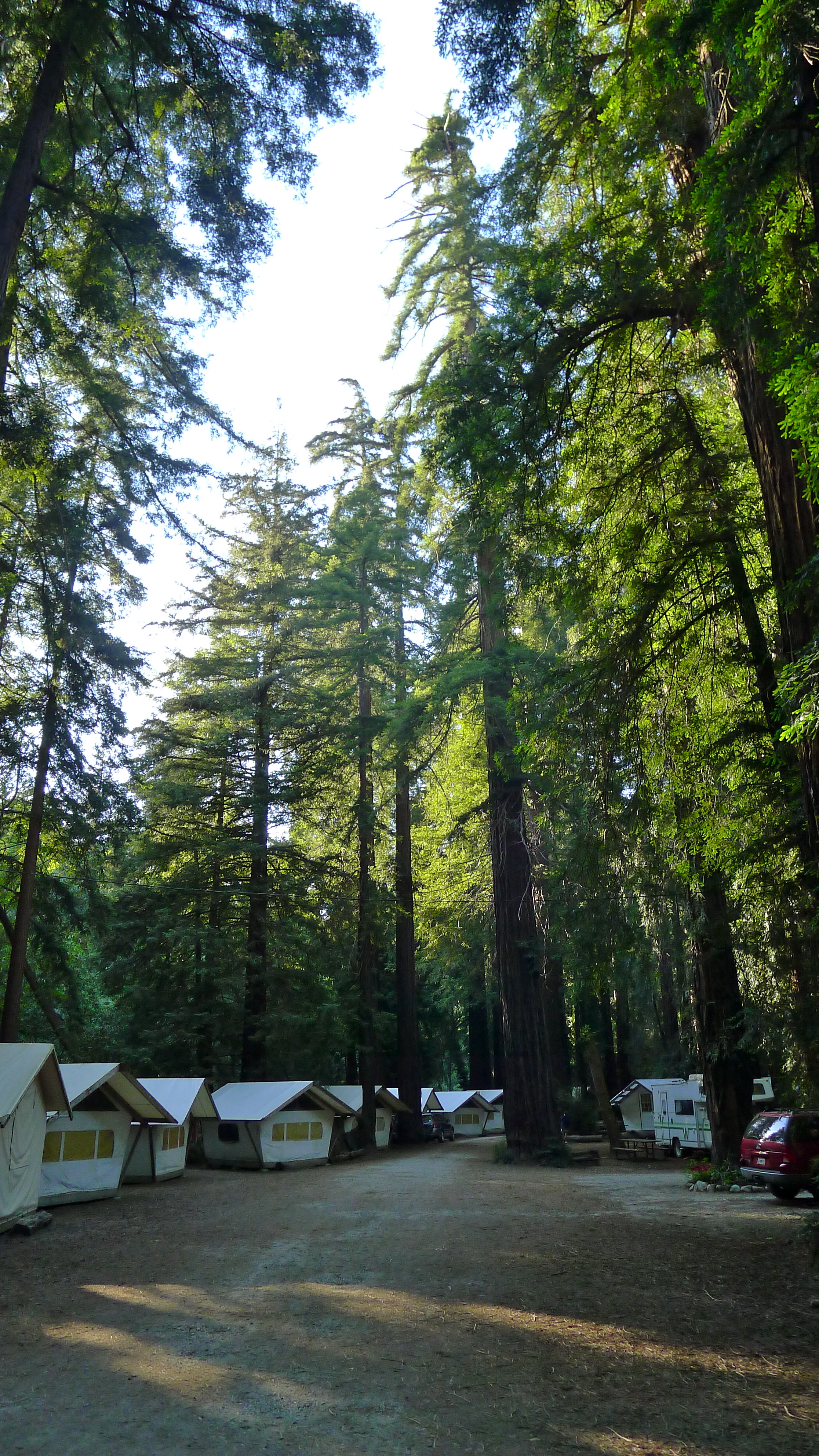 We turned down a dirt road behind the motel and followed the highlighted line on the campground map through insanely tall redwood trees. The campground was awesome- quiet, spacious, shaded from the trees, and there was a river running through it. After passing lots of trailers and tents, and even a few tiny yurts, we saw two larger canvas tents tucked back away from other campers. We were home for the night.