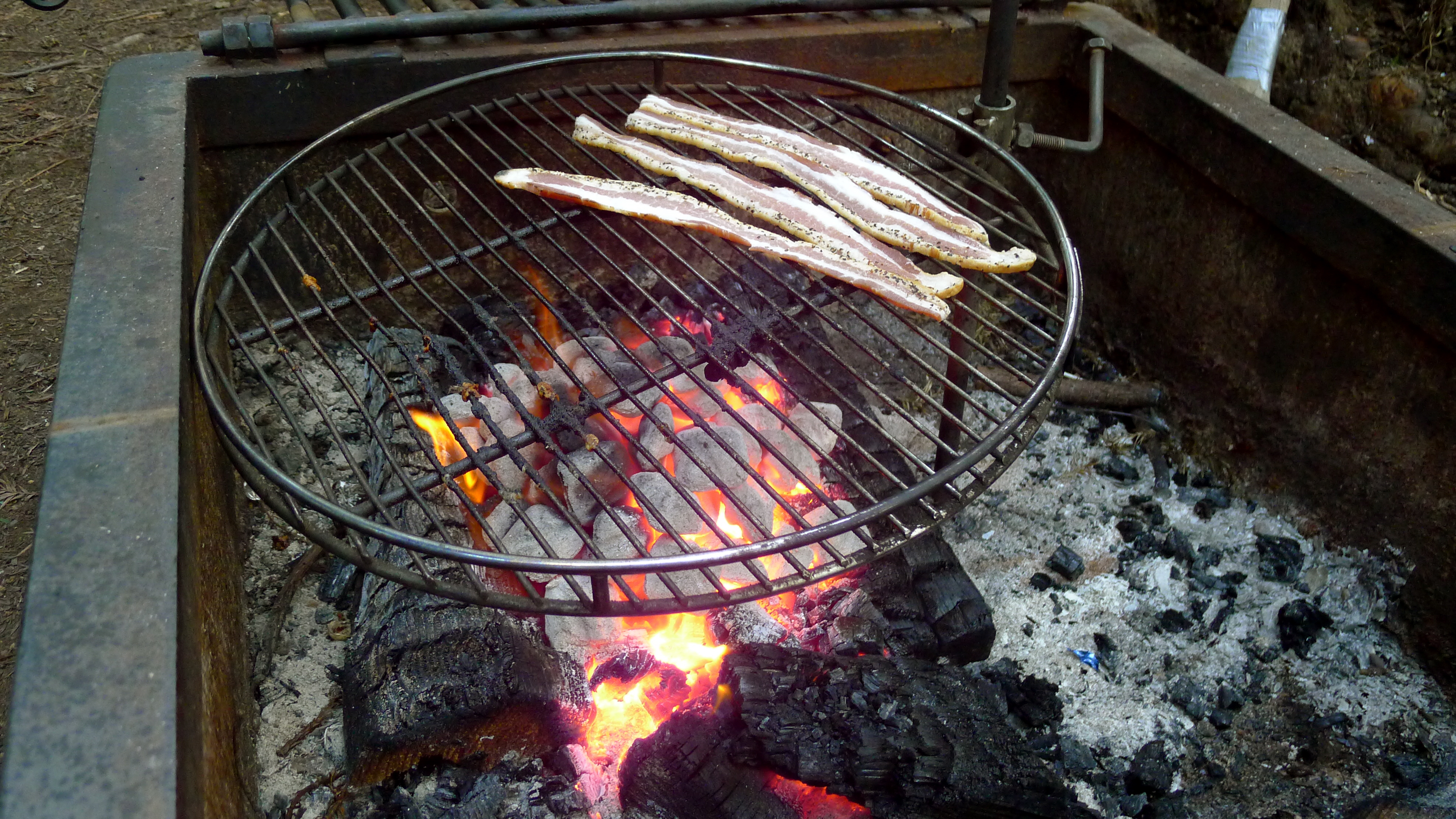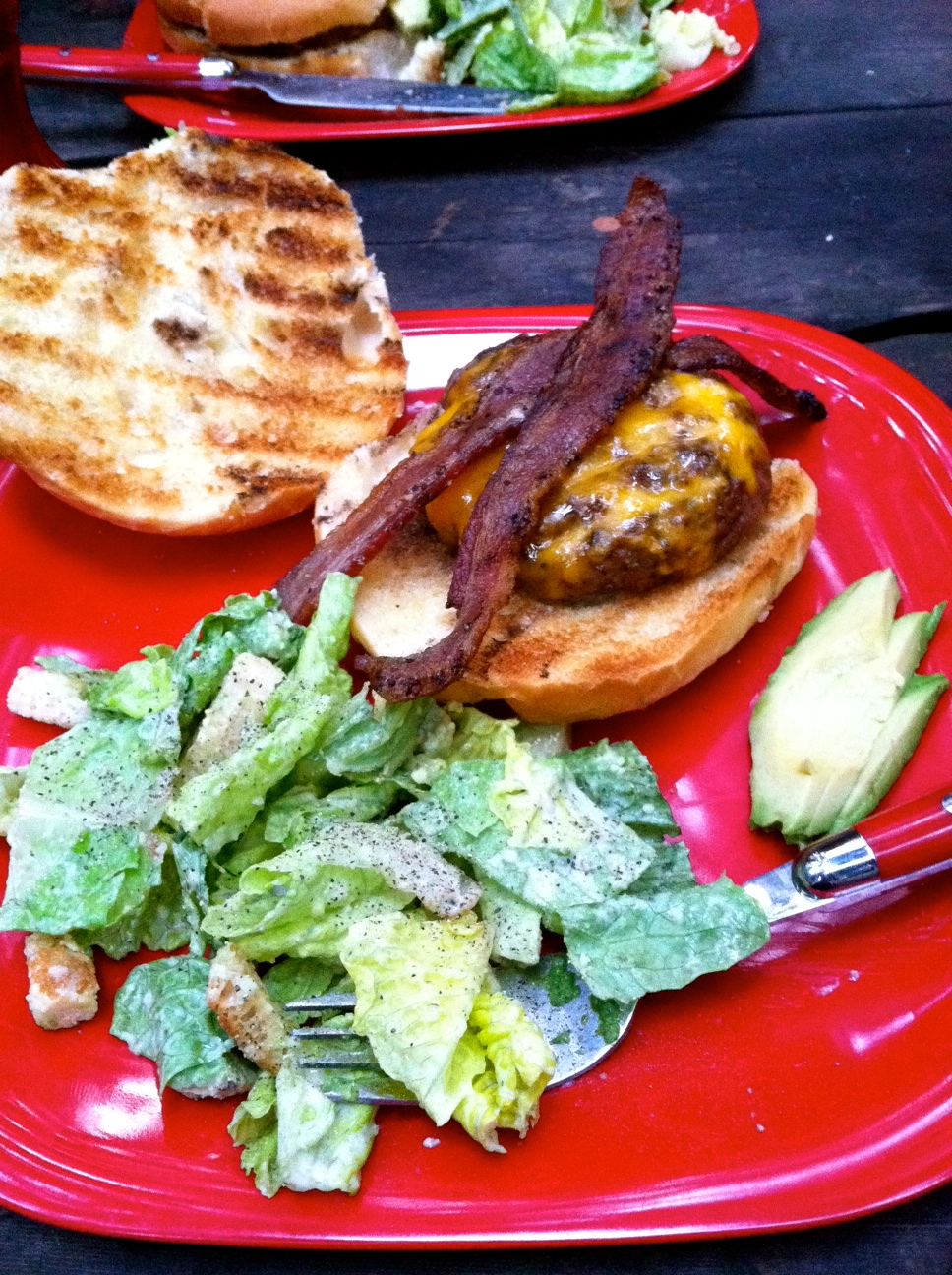 Back at camp, we got down to business: cheese and crackers warmed over the campfire, bacon cheeseburgers with Caesar salad and fresh avocado, a little mood music, and delicious red wine. We sipped our wine late into the night, watching the fire crackle from those cool handmade chairs.