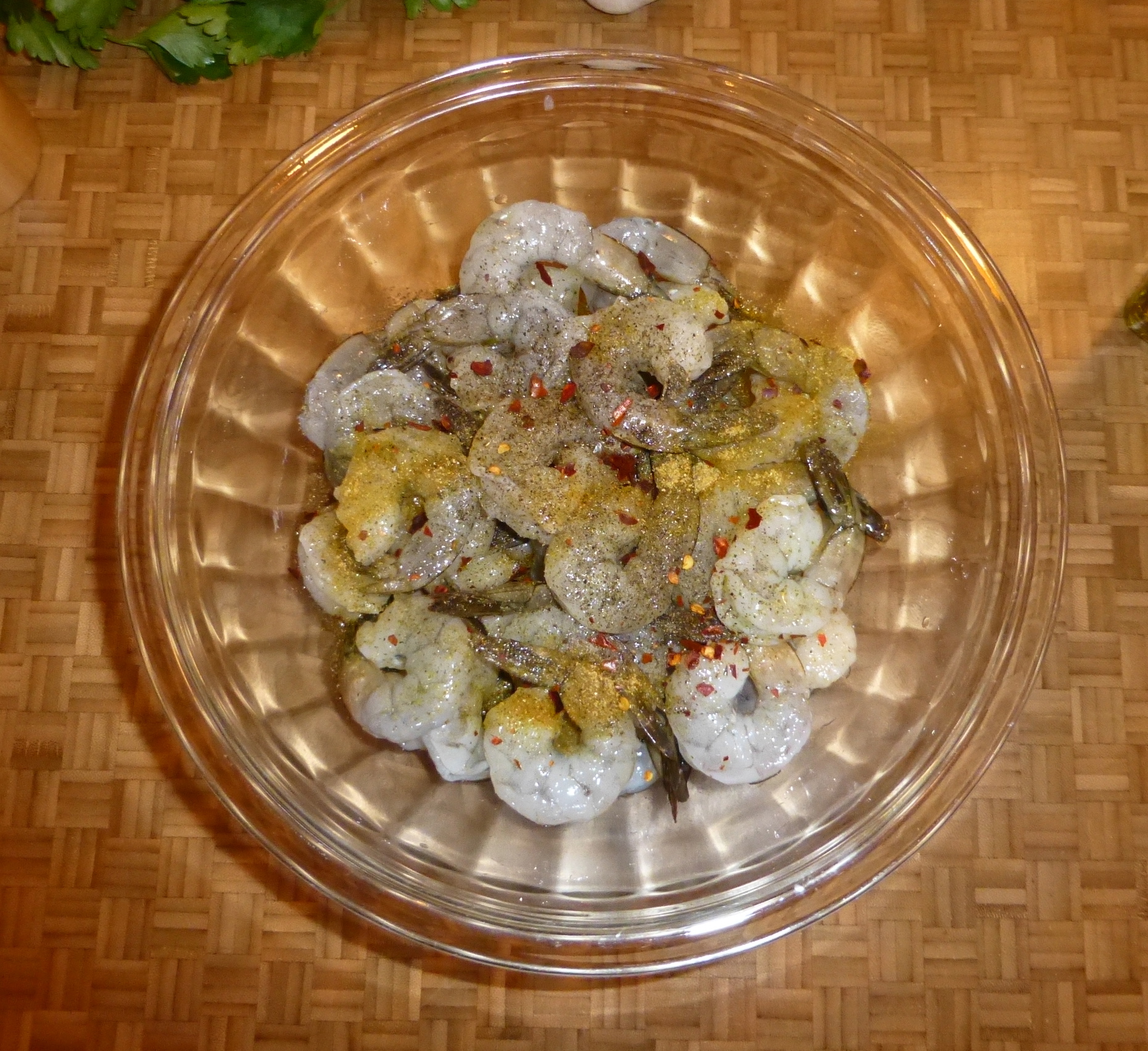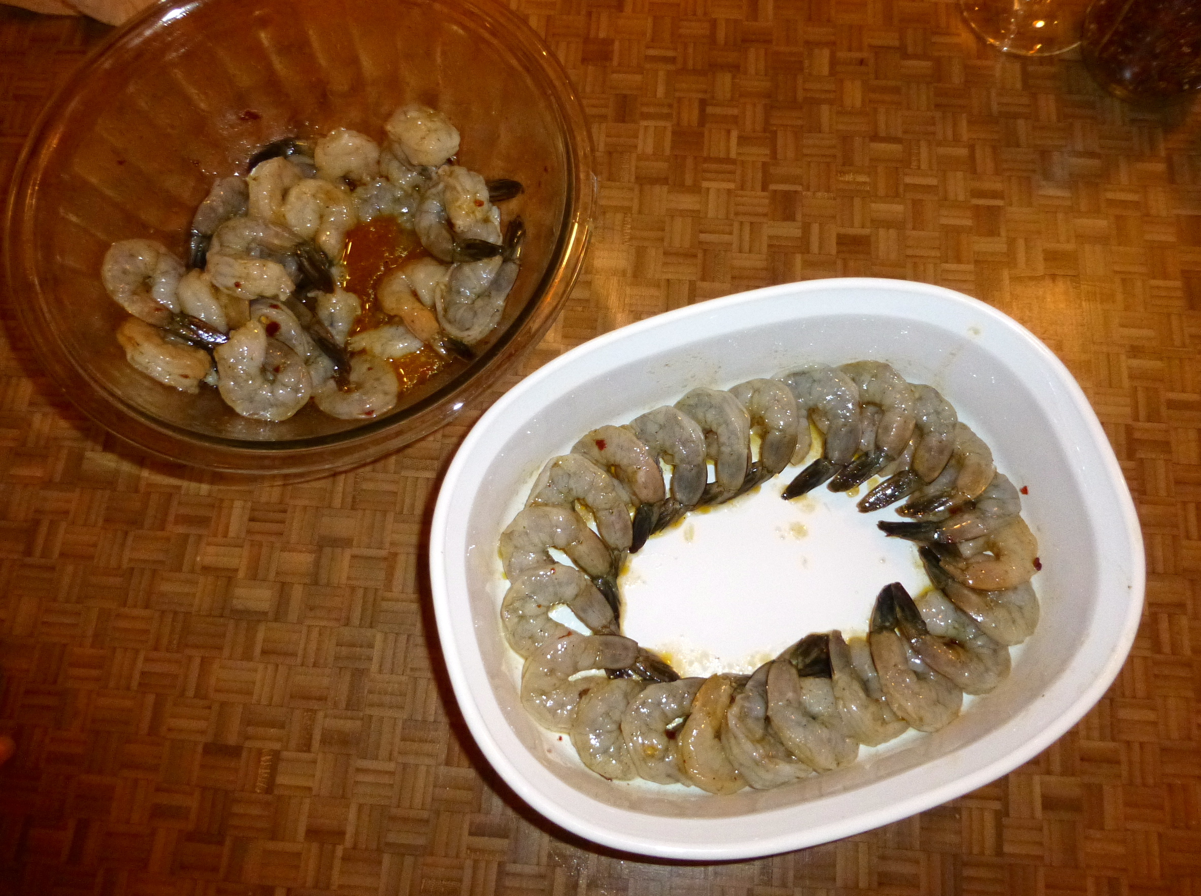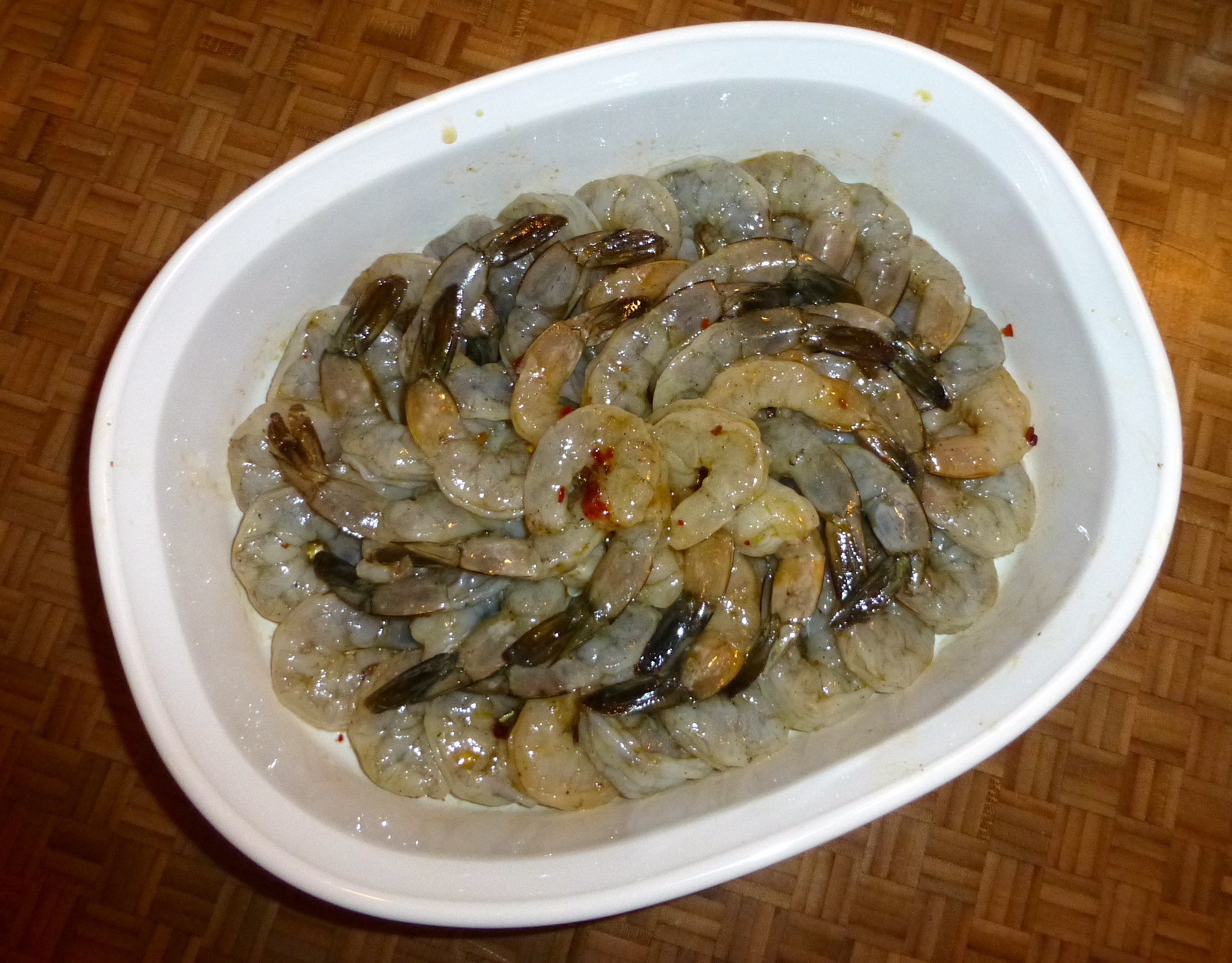 I started with a bowl of big, beautiful shrimp, already peeled but with the tails still on. Into the bowl, I added olive oil, the chile oil, garlic salt, some white wine, some cracked black pepper, and crushed red pepper. With my hands, I made sure that all of the shrimp were coated in the little marinade and then I set the bowl aside for awhile. I had the Magic Butter Mixture to make.