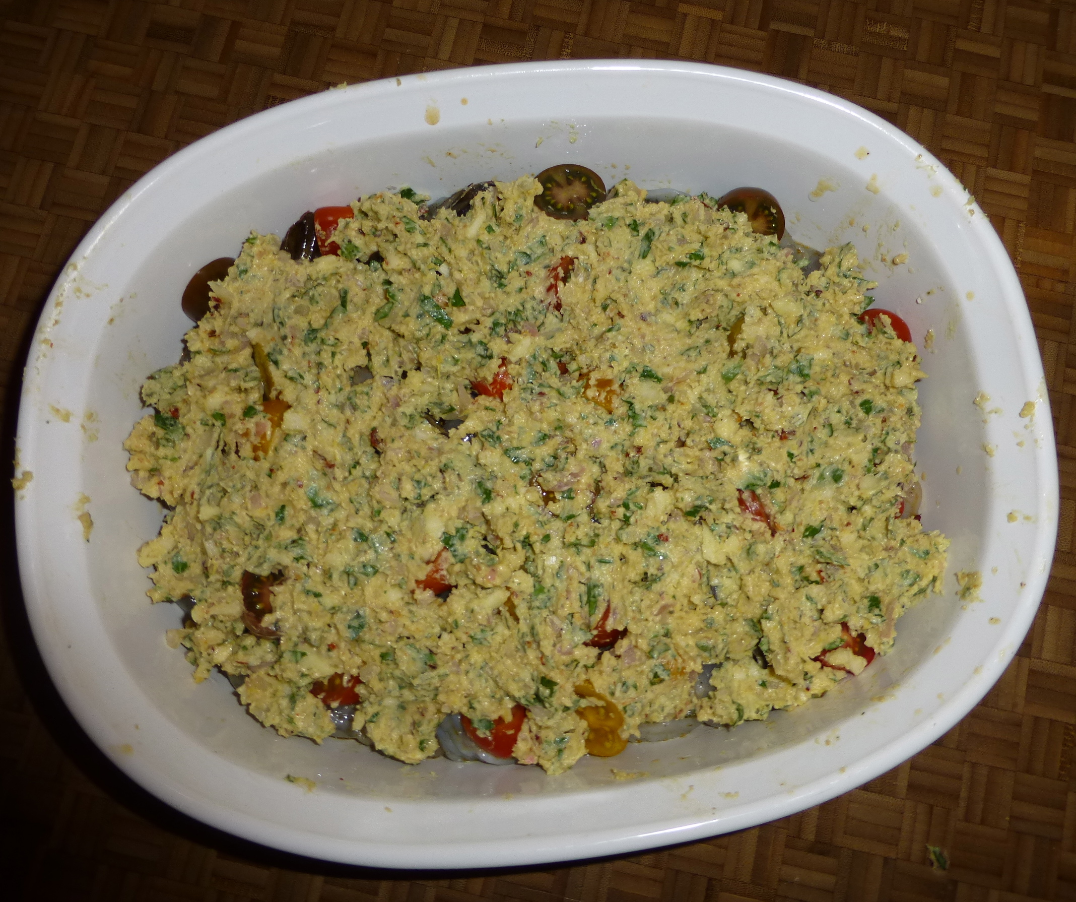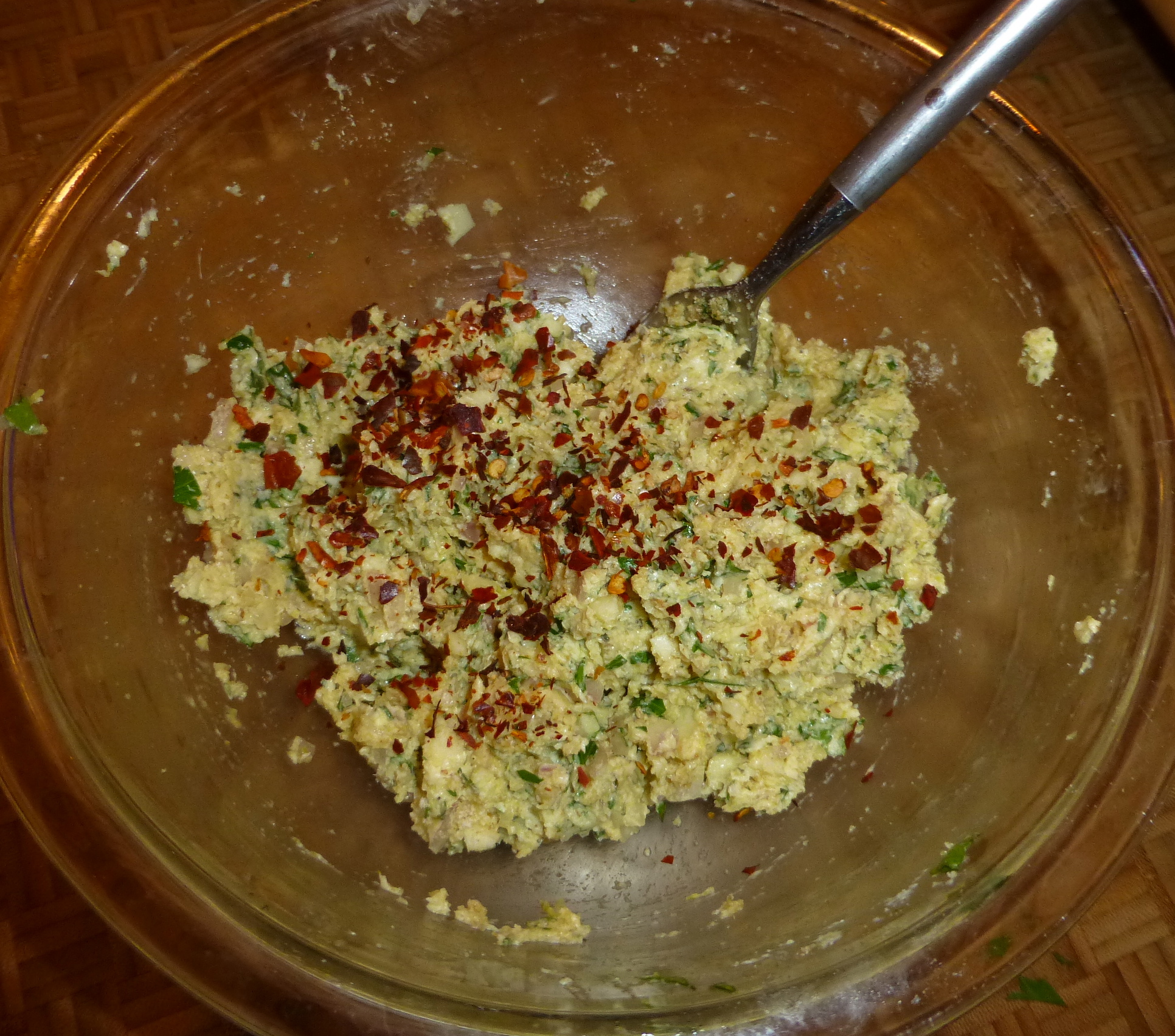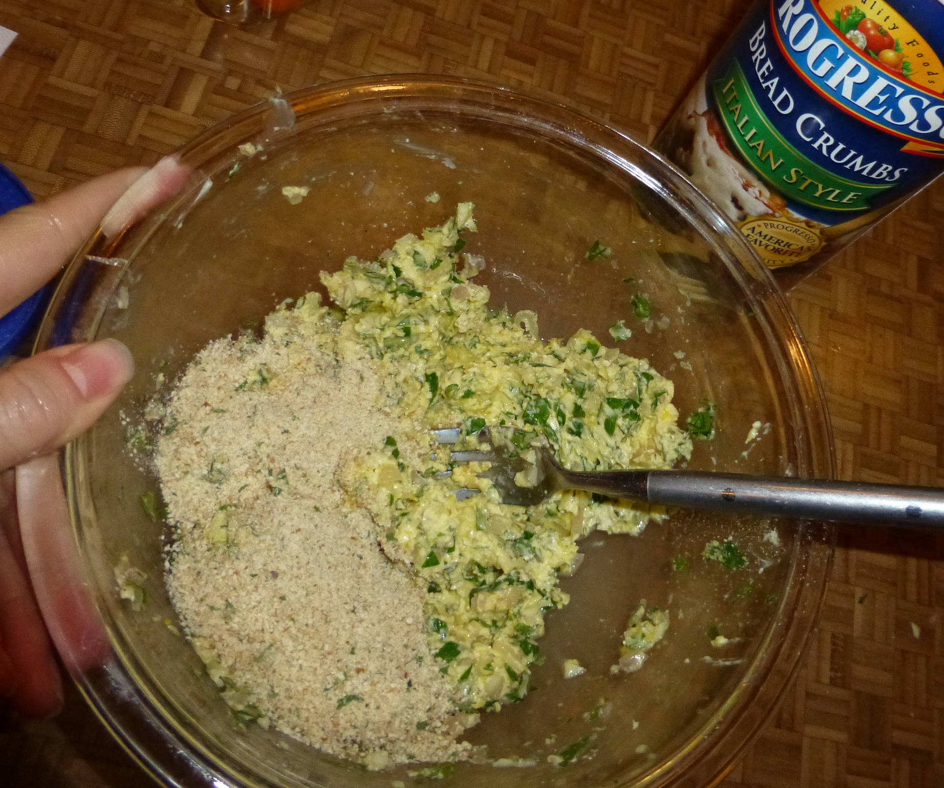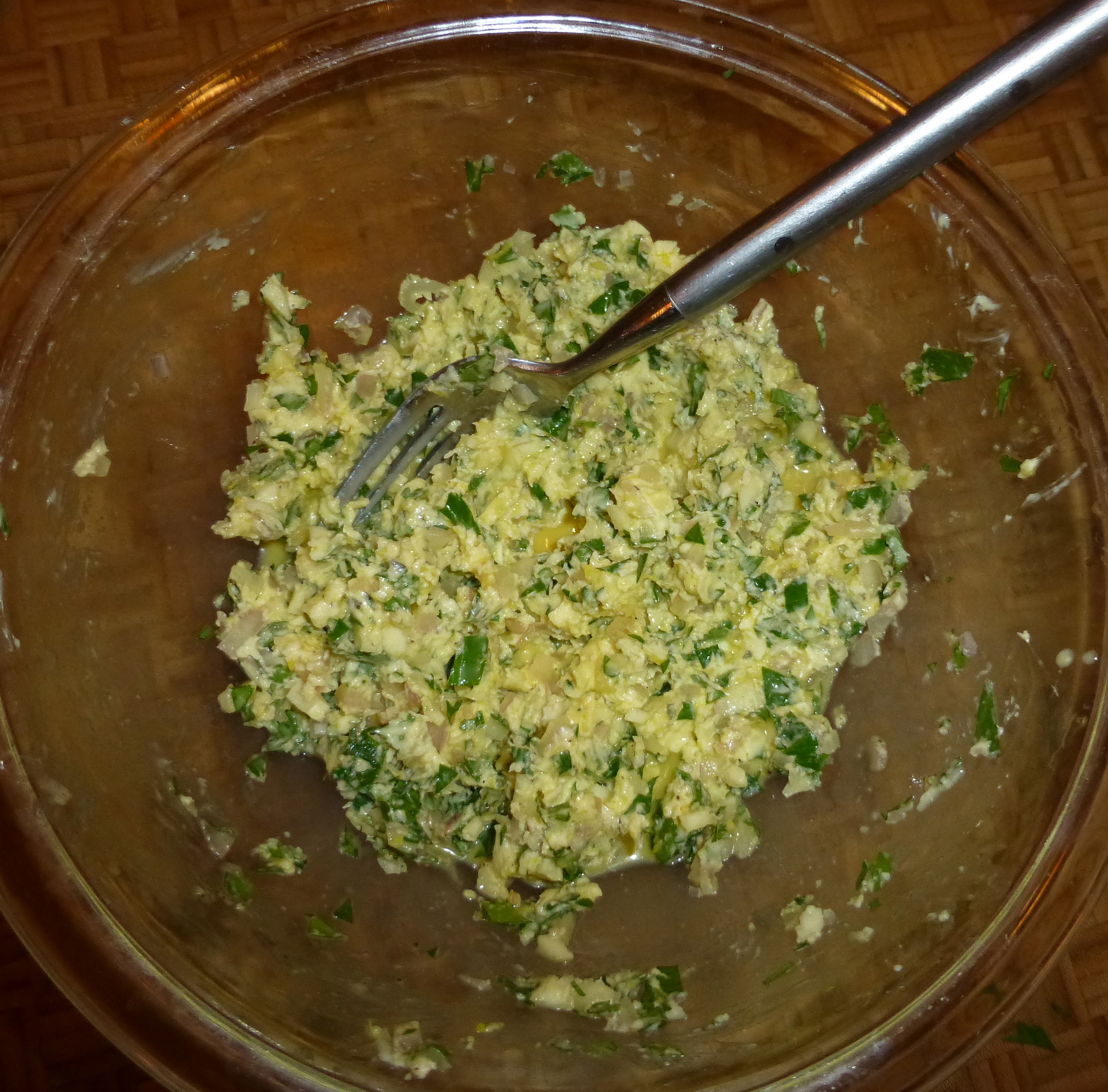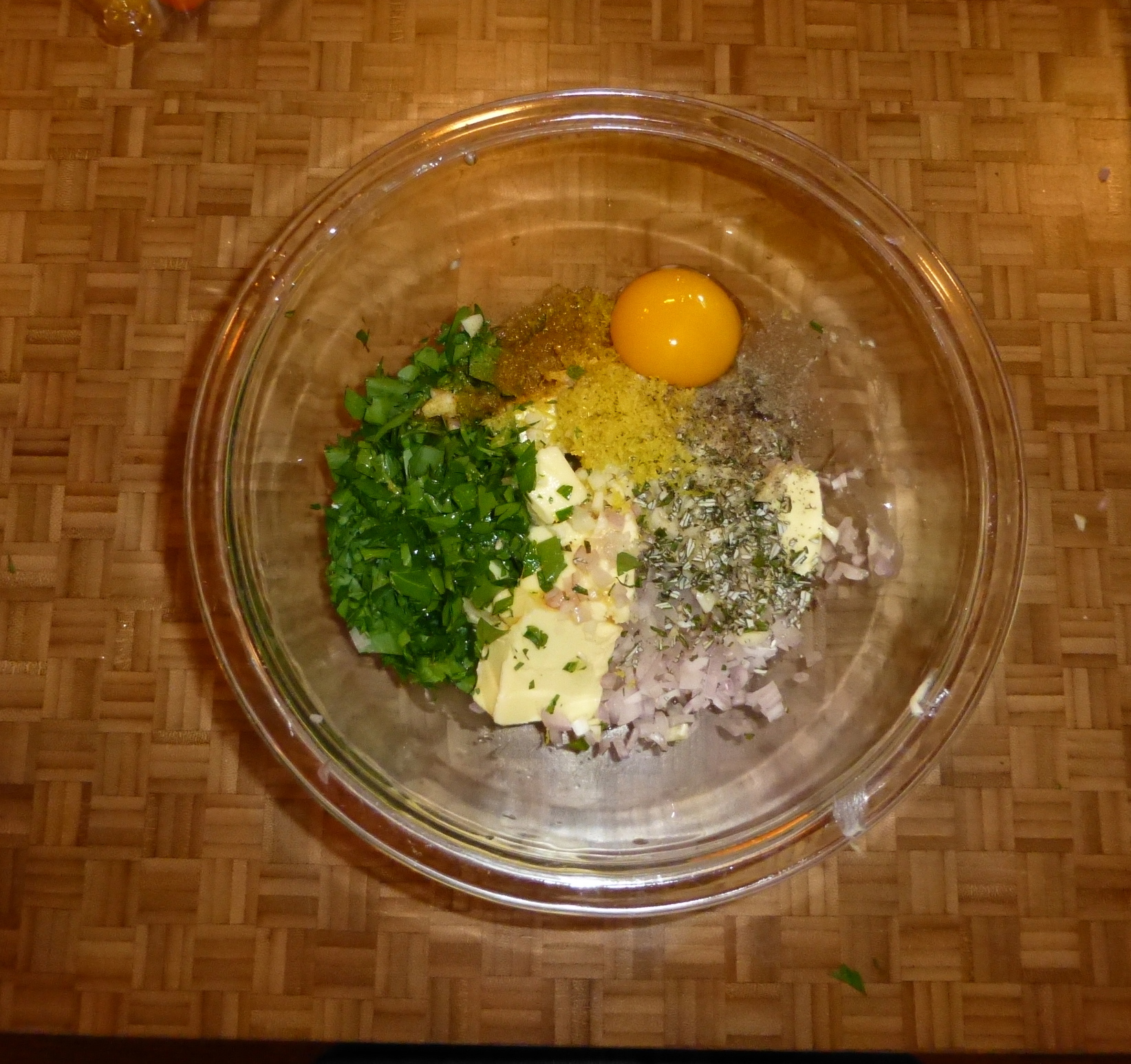 All of those goodies landed in a bowl with a stick of butter. The final touches: an egg yolk and a decent amount of breadcrumbs. Using a fork, I blended it all together into a buttery, garlic-y spread. YUM.