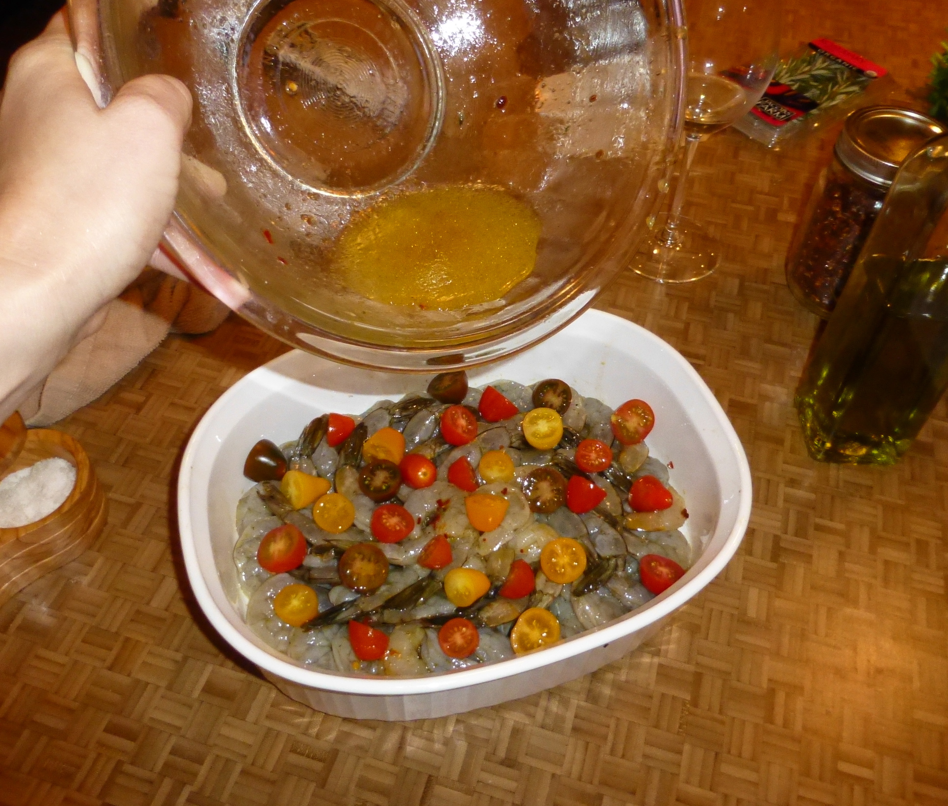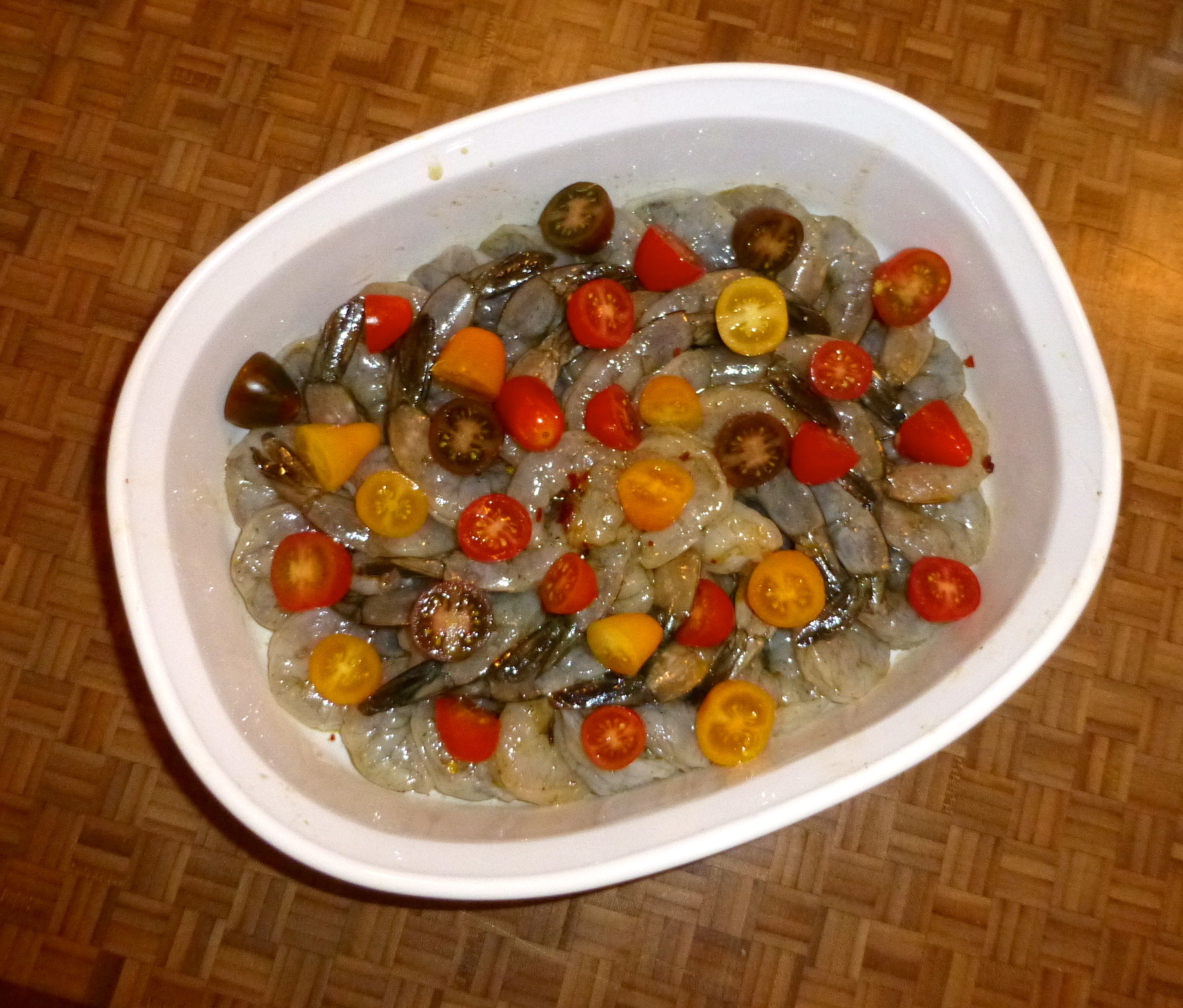 The shrimp had been swimming in their marinade for 20 minutes or so. One by one, I arranged them in a baking dish, tails up.  At the last minute, I thought some roasted tomatoes would be a yummy addition to the dish, so I halved some grape tomatoes and sprinkled them over the shrimp. Then, I poured the remaining marinade over it all- every last drop of flavor!
