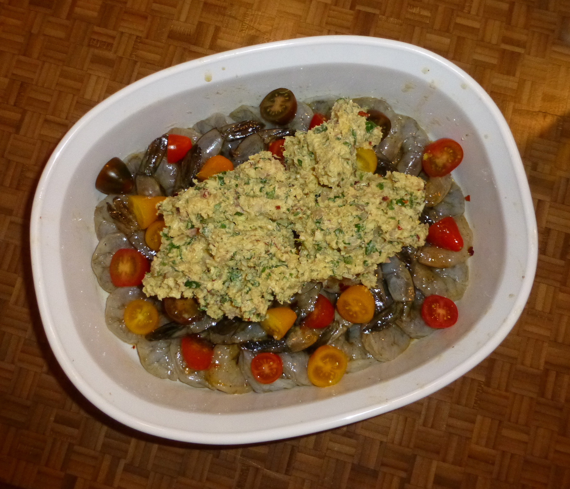 Arrange the shrimp in a baking dish, tail side up. Sprinkle cherry tomatoes over the shrimp. Pour the remaining marinade over the shrimp. Spread the butter mixture over the shrimp and sprinkle breadcrumbs over the top.