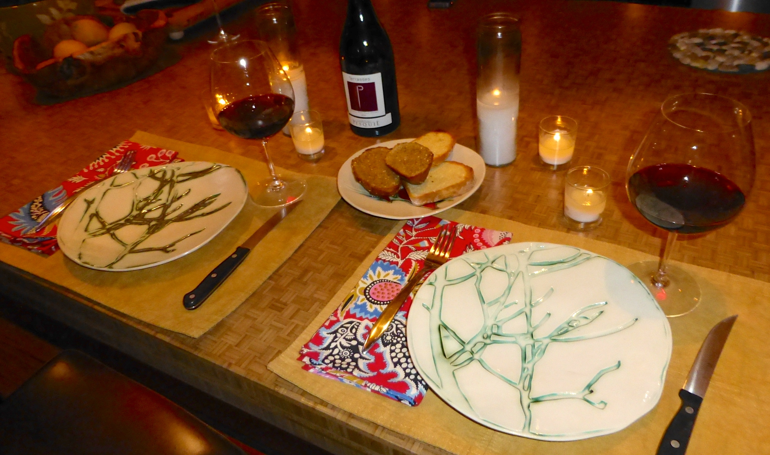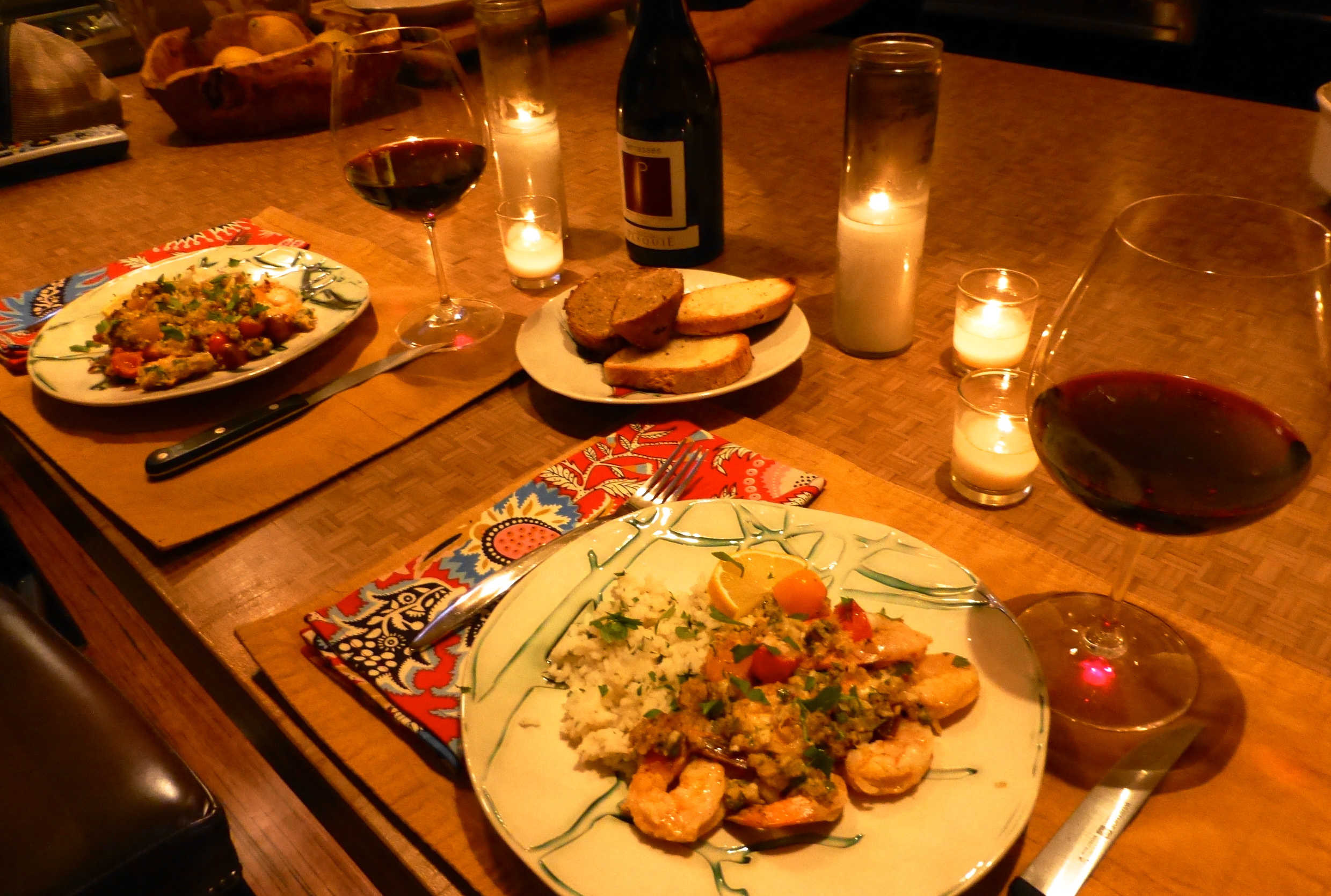 While the scampi baked away, I checked on my rock star hubby and confirmed that Cholula was still alive. I made some rice (lemon and parsley stirred into it), prepped the garnishes, and set the table with our lovely new plates.