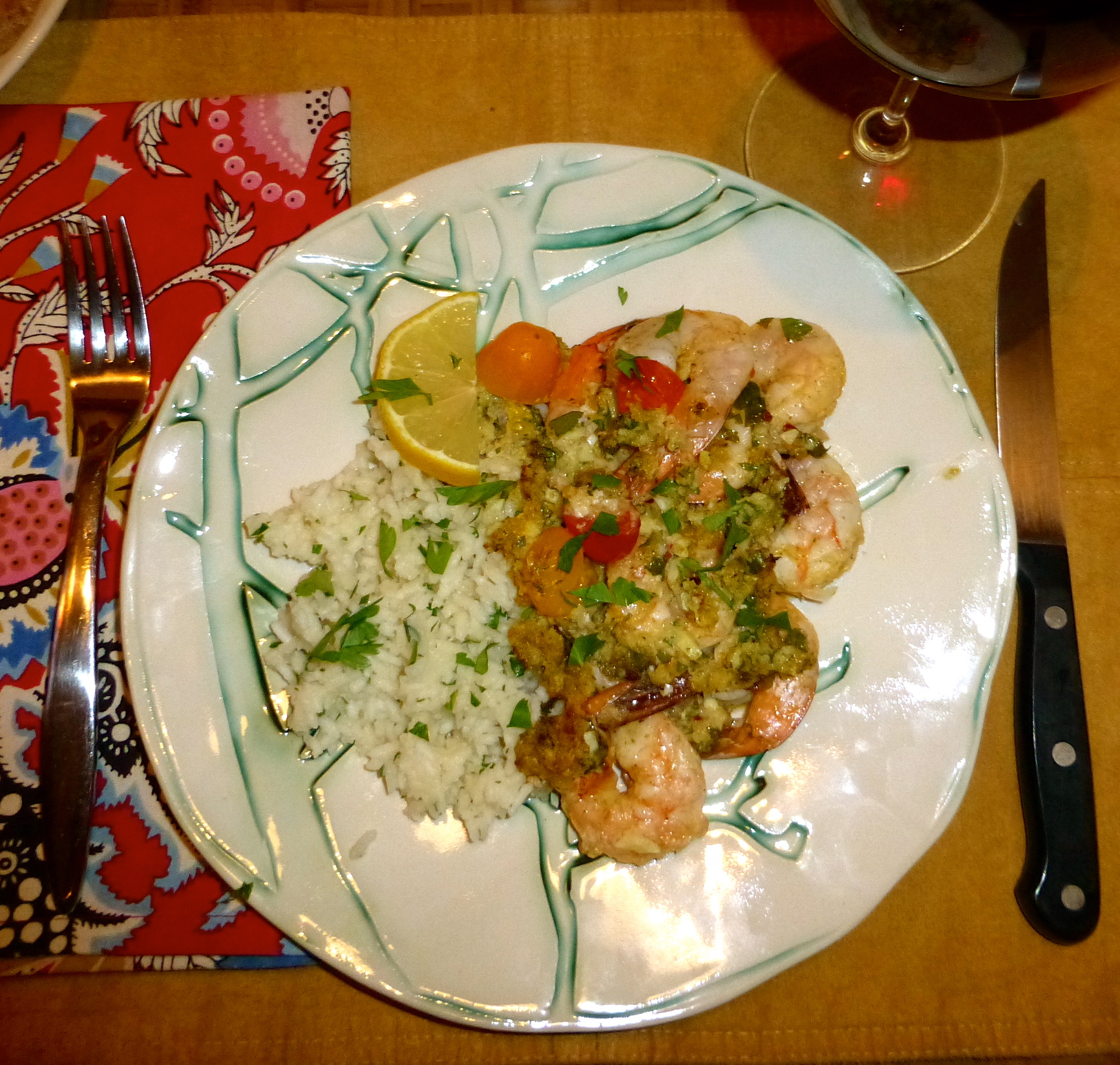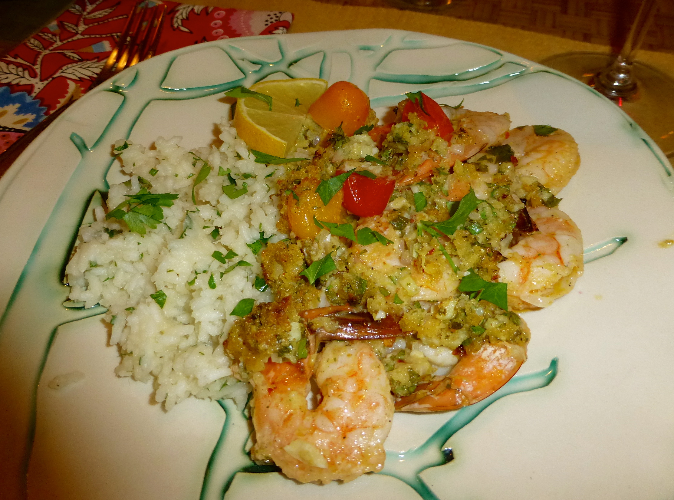 When the scampi came out of the oven, the topping was browned and bubbling. It smelled heavenly! I spooned a little rice onto each plate, then scooped some shrimp onto it. A sprinkle of parsley, a lemon wedge- time to eat!