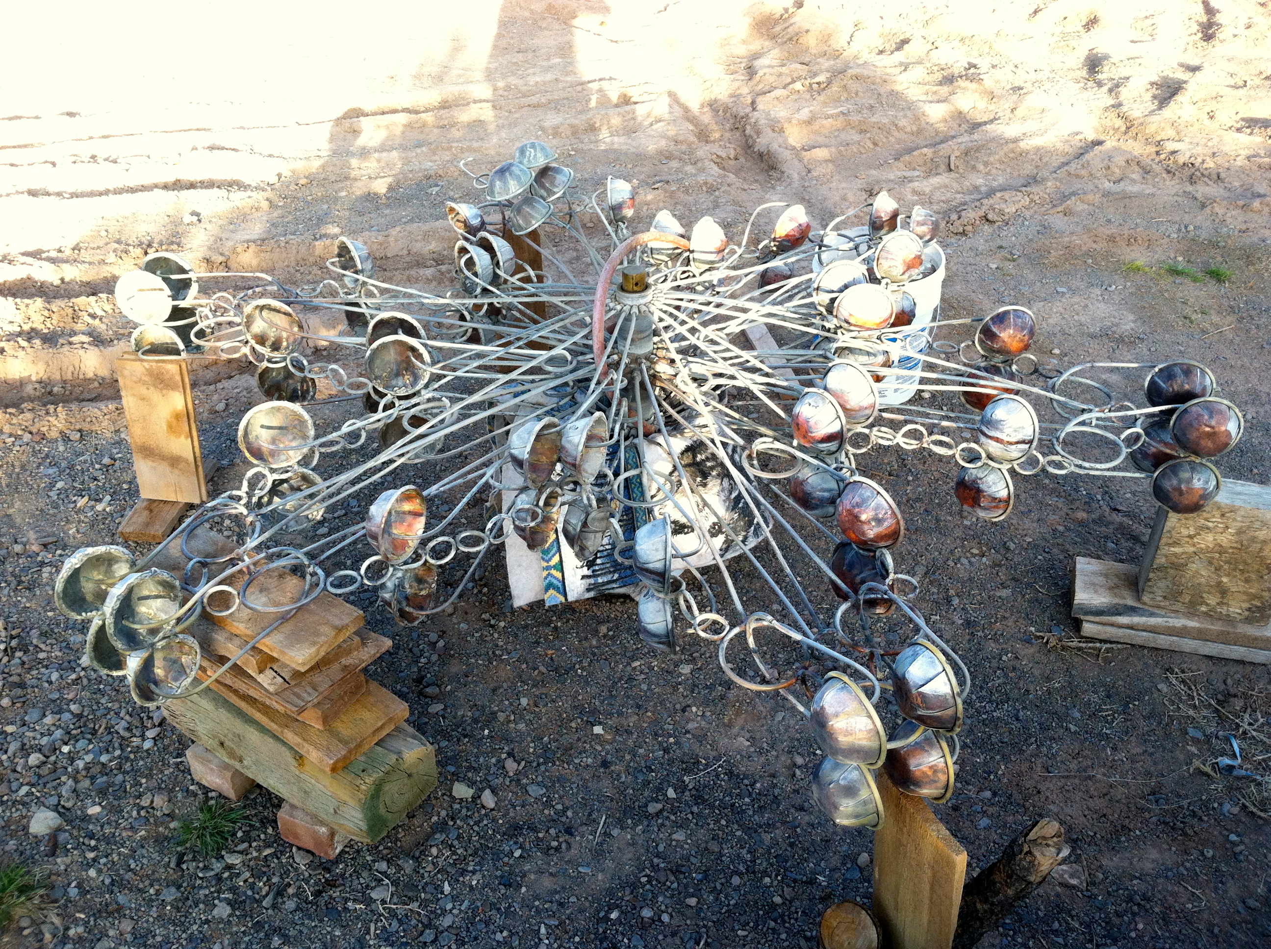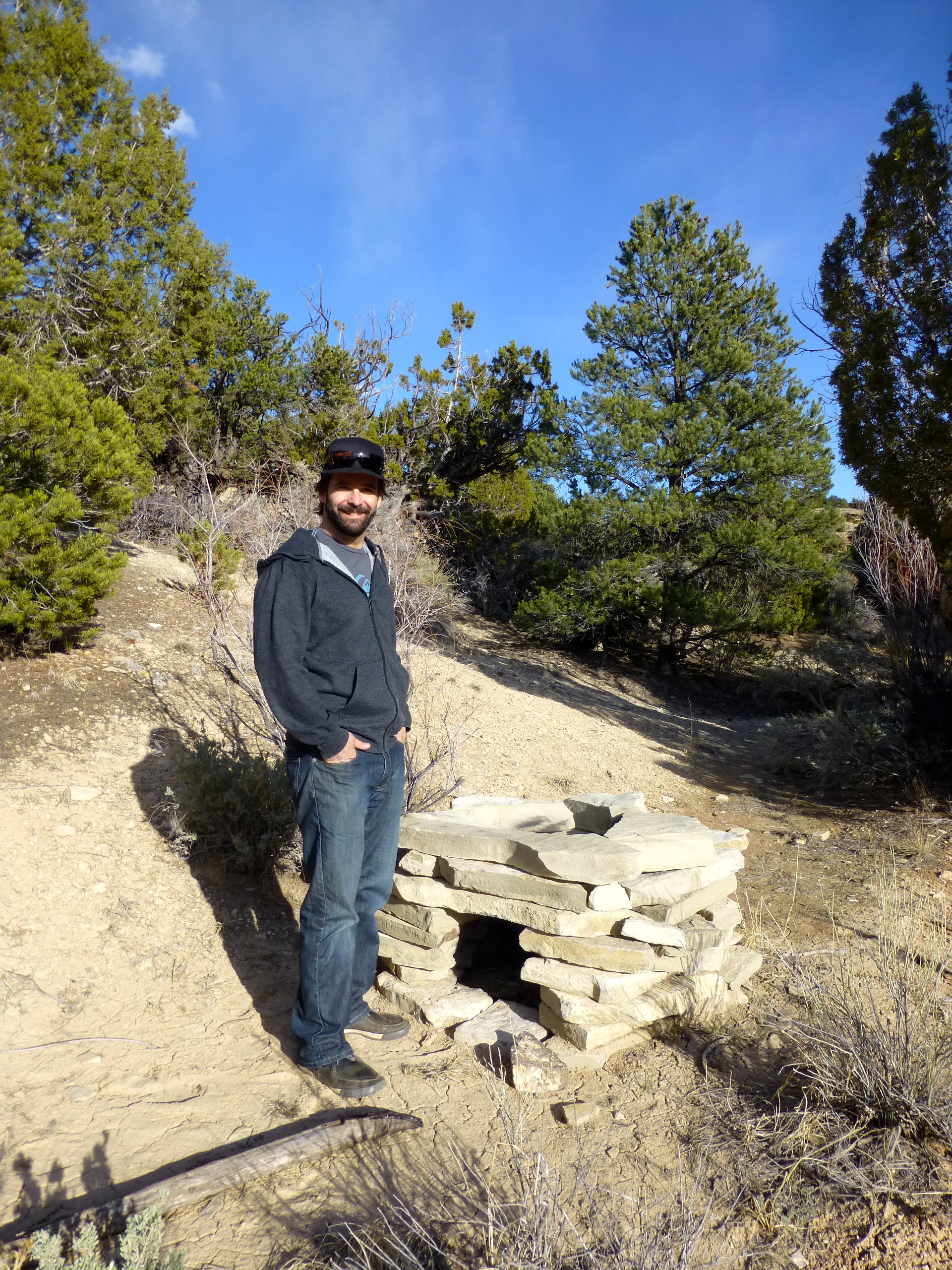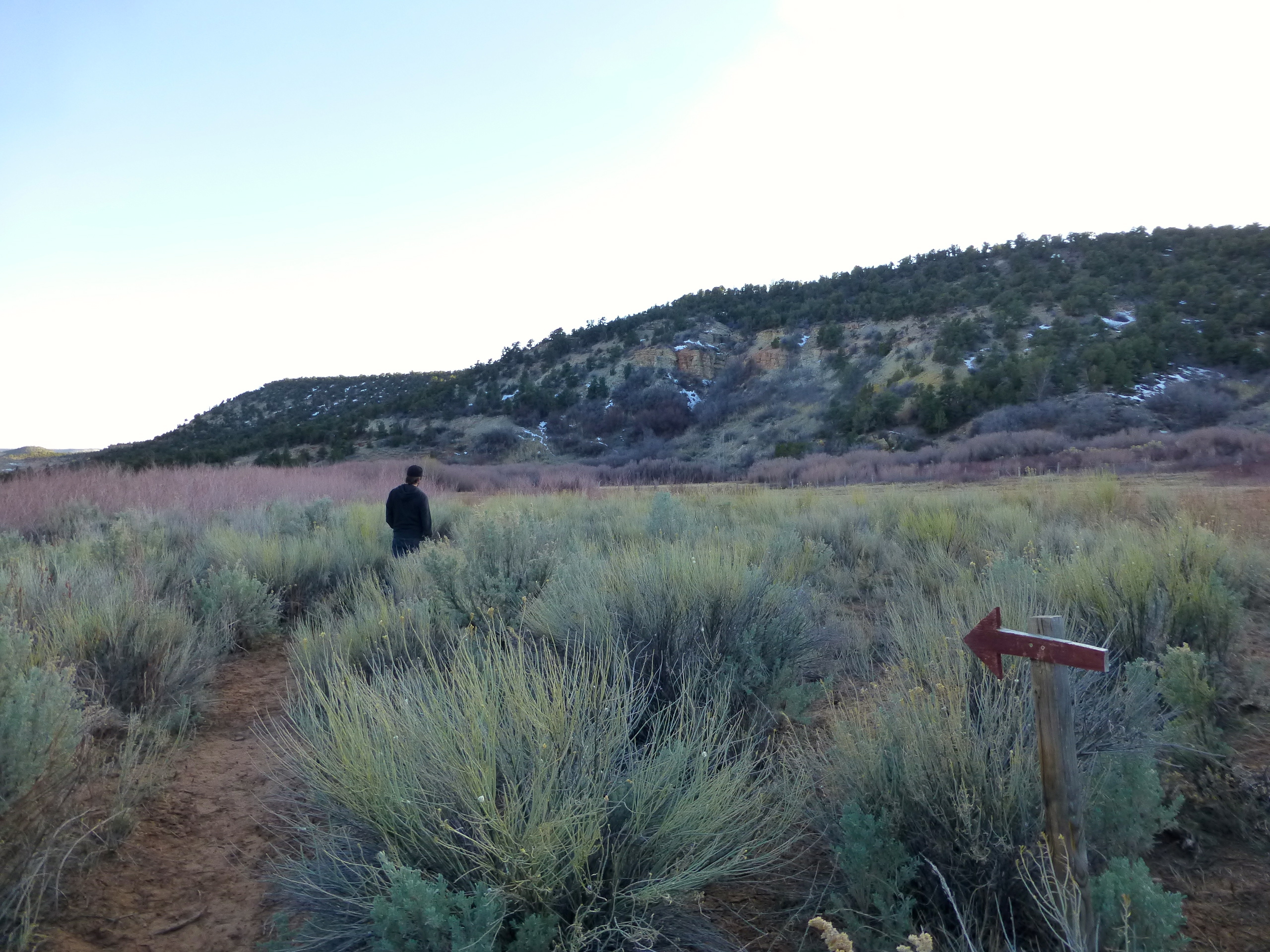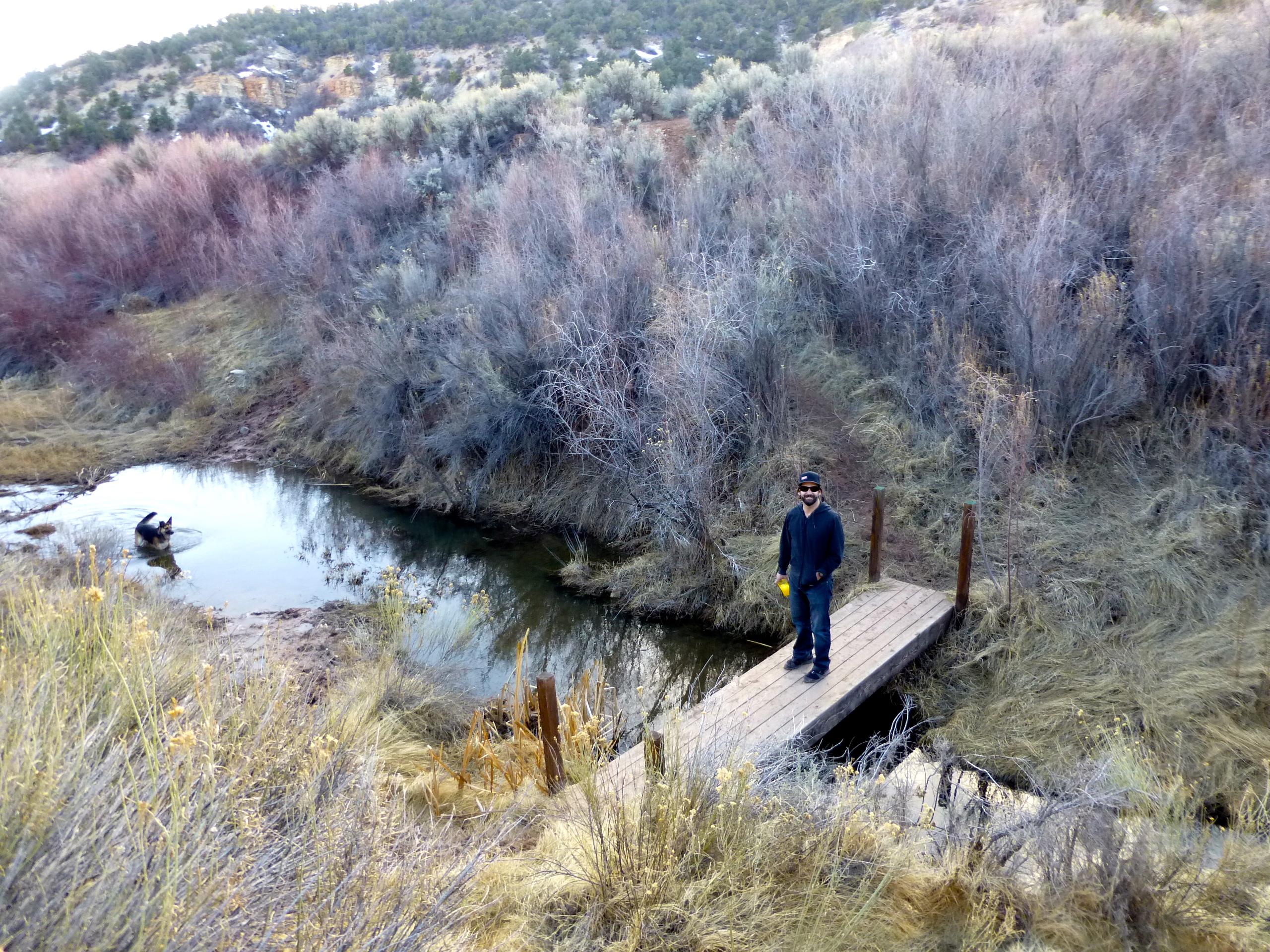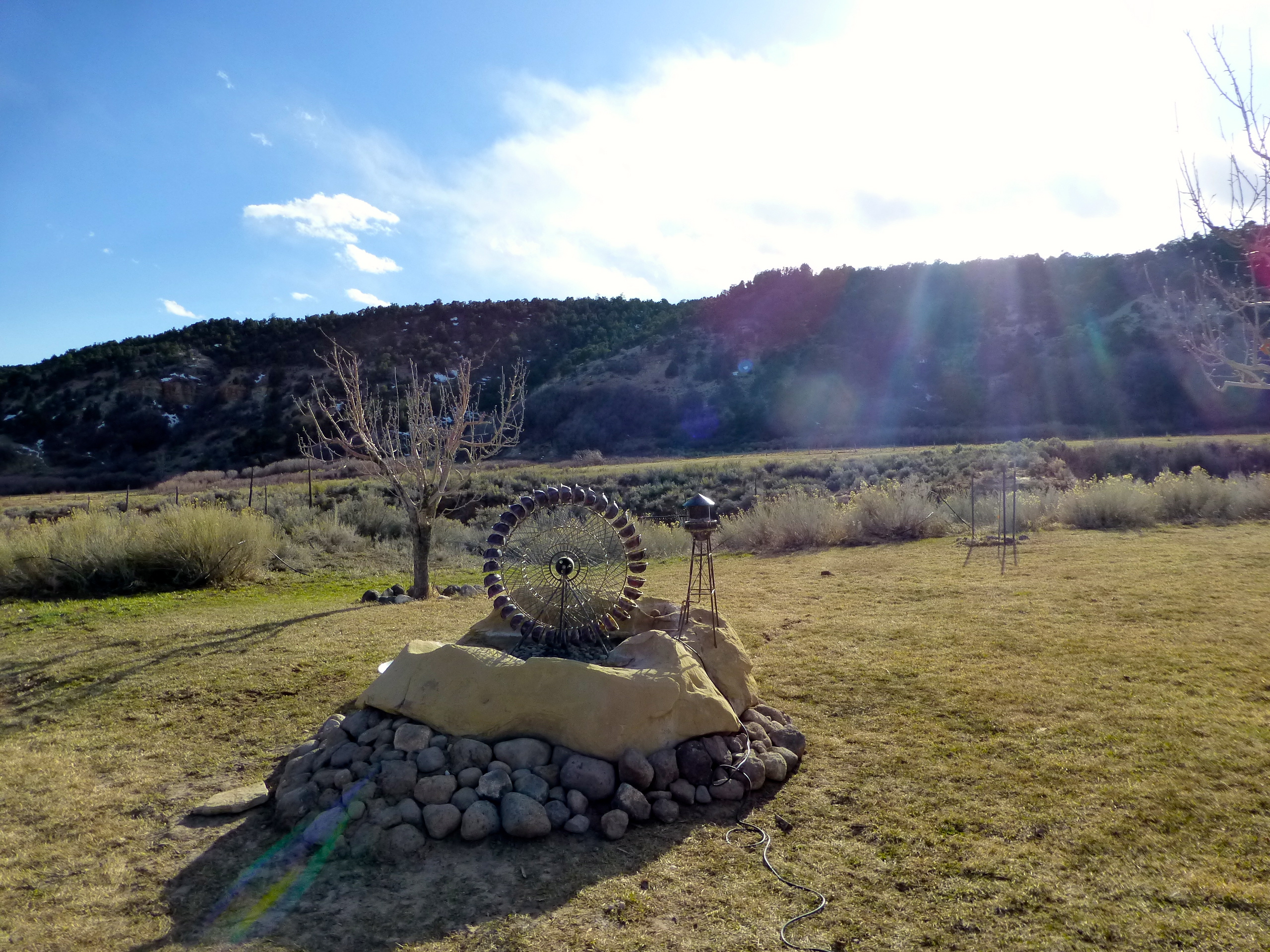 We walked past a communal firepit and through a gorgeous field, the green grass beginning to provide some color to the landscape. We’d heard there was a short trail to a waterfall on the property, so we followed wooden arrows and hoped the sunset would wait a few extra minutes for us to find it. We found an underground storage bunker with beautiful wooden doors. We found in-progress industrial art pieces made of metal. Our stroll was cushioned on both sides by the soft hues of springtime in the Utah desert– sage green, dusty mauve, burnt orange, periwinkle gray-blue.
