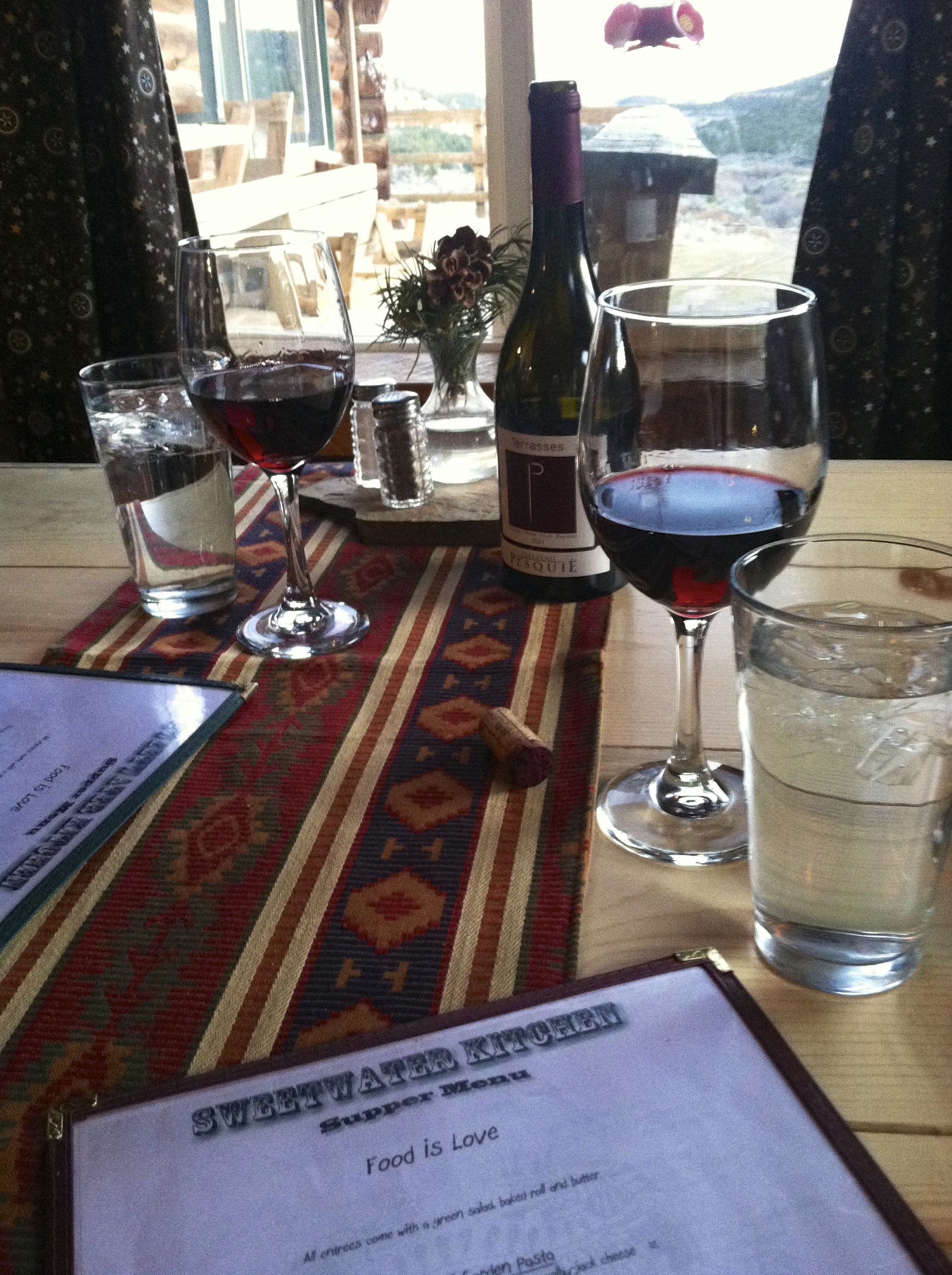 Before our trip, I’d looked up the menu for the Ranch’s restaurant- Sweetwater Kitchen. The food had sounded incredible– fresh ingredients with unique “cowboy-ish” additions (braised rabbit, anyone?). But, being so early in the season, we weren’t sure what to expect. We tucked Cholula into the cabin with her own supper, grabbed a tasty bottle of red wine from our collection, and walked the 100 yards to the main lodge. As we approached, it felt like we were arriving at a friend’s house for dinner.