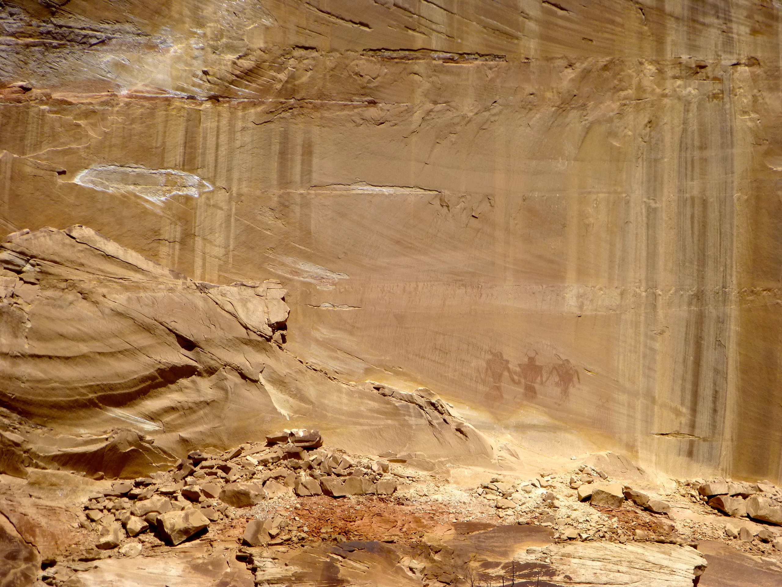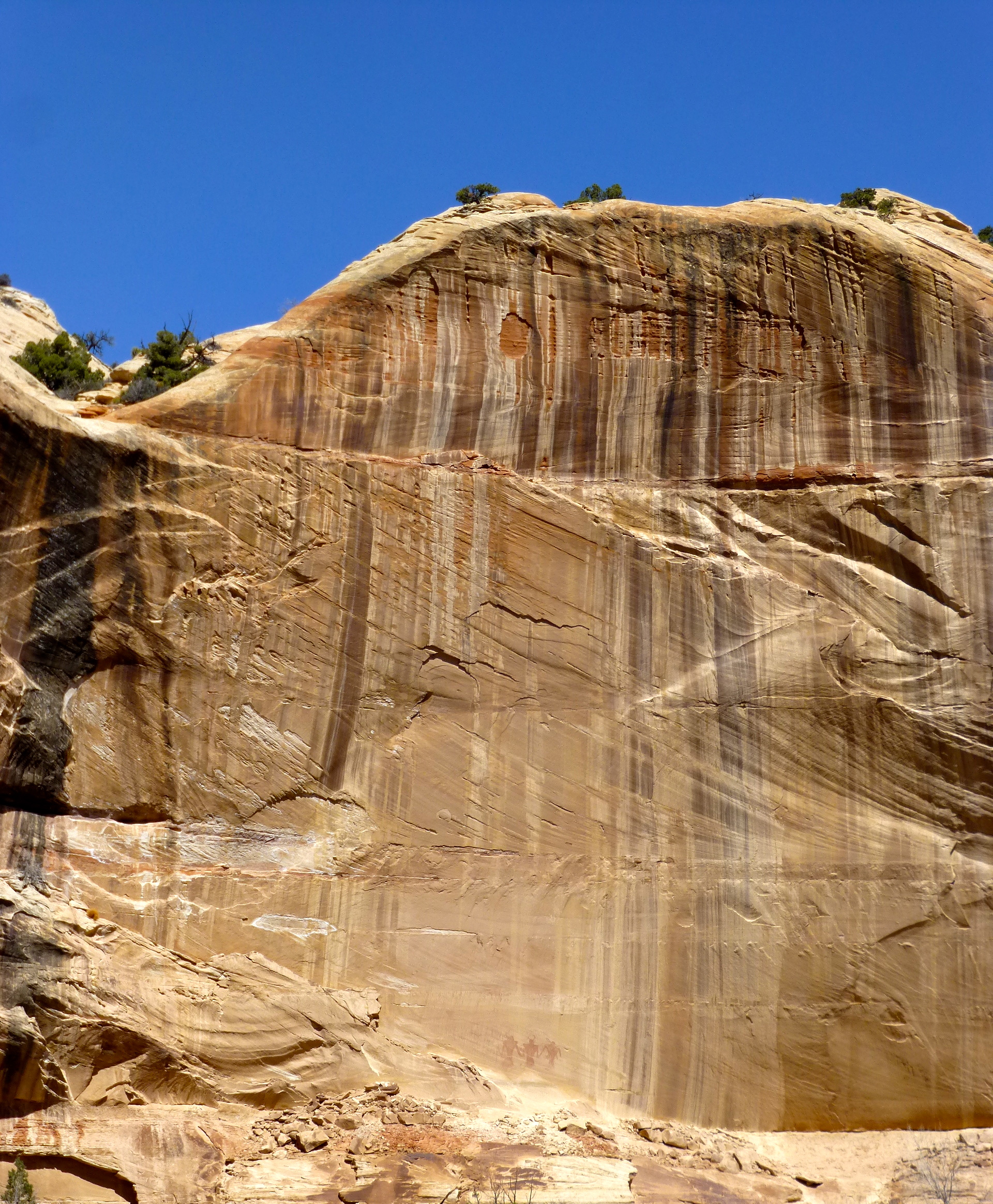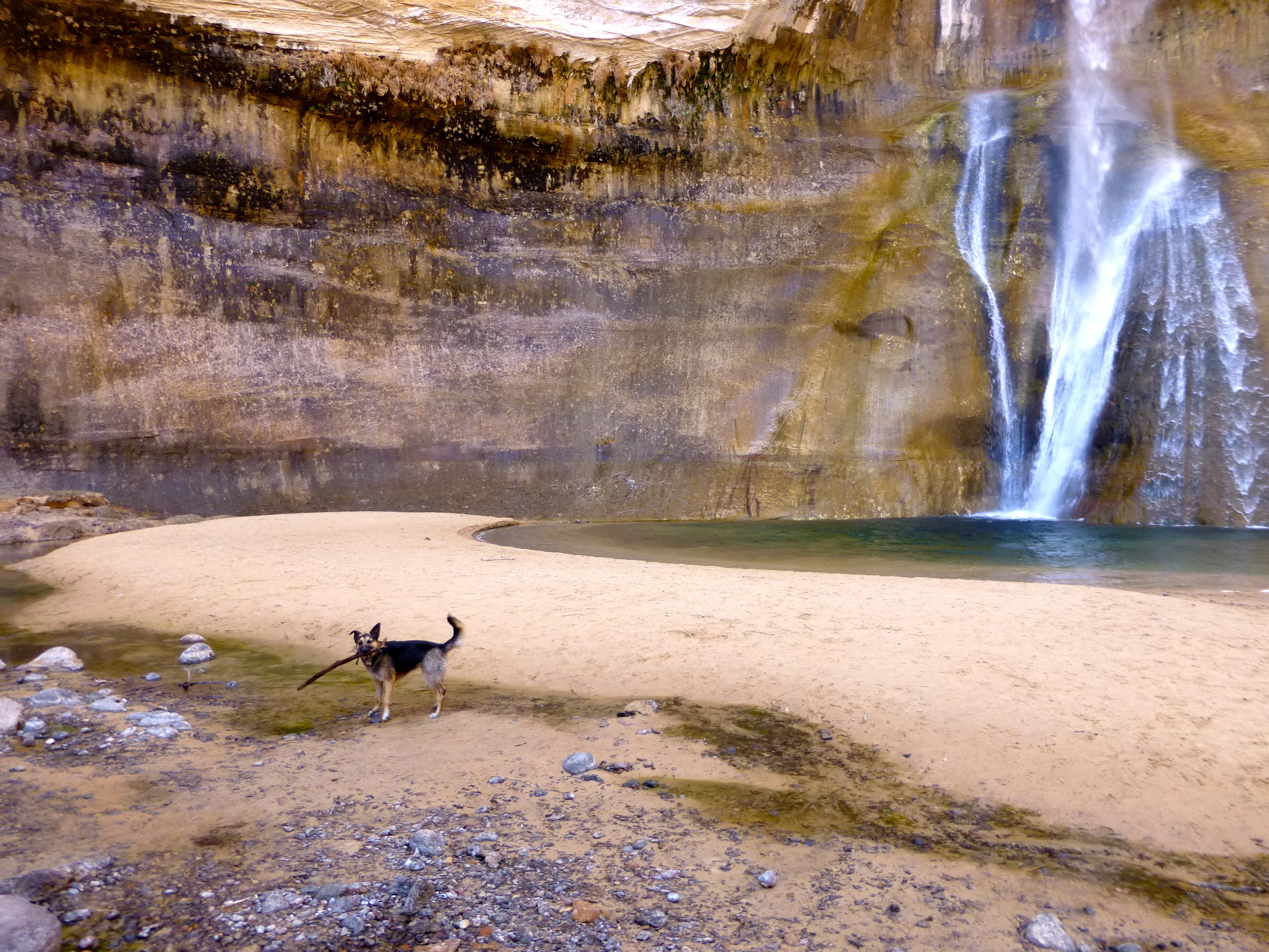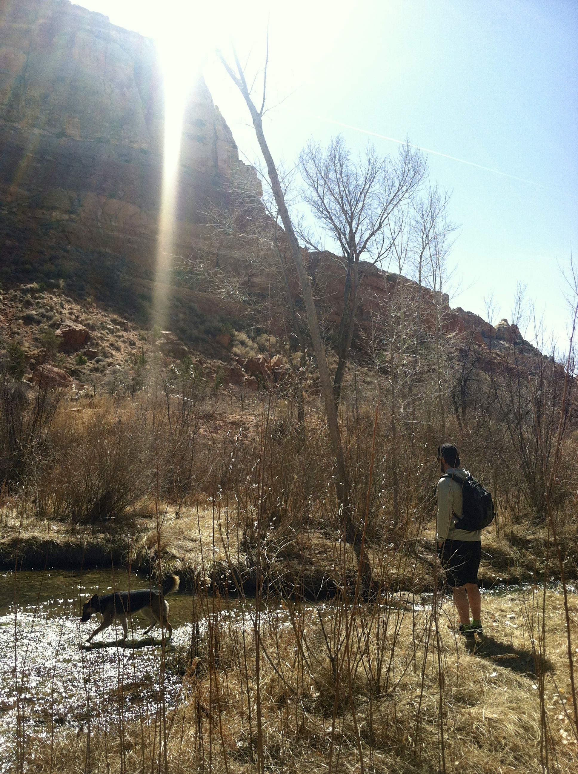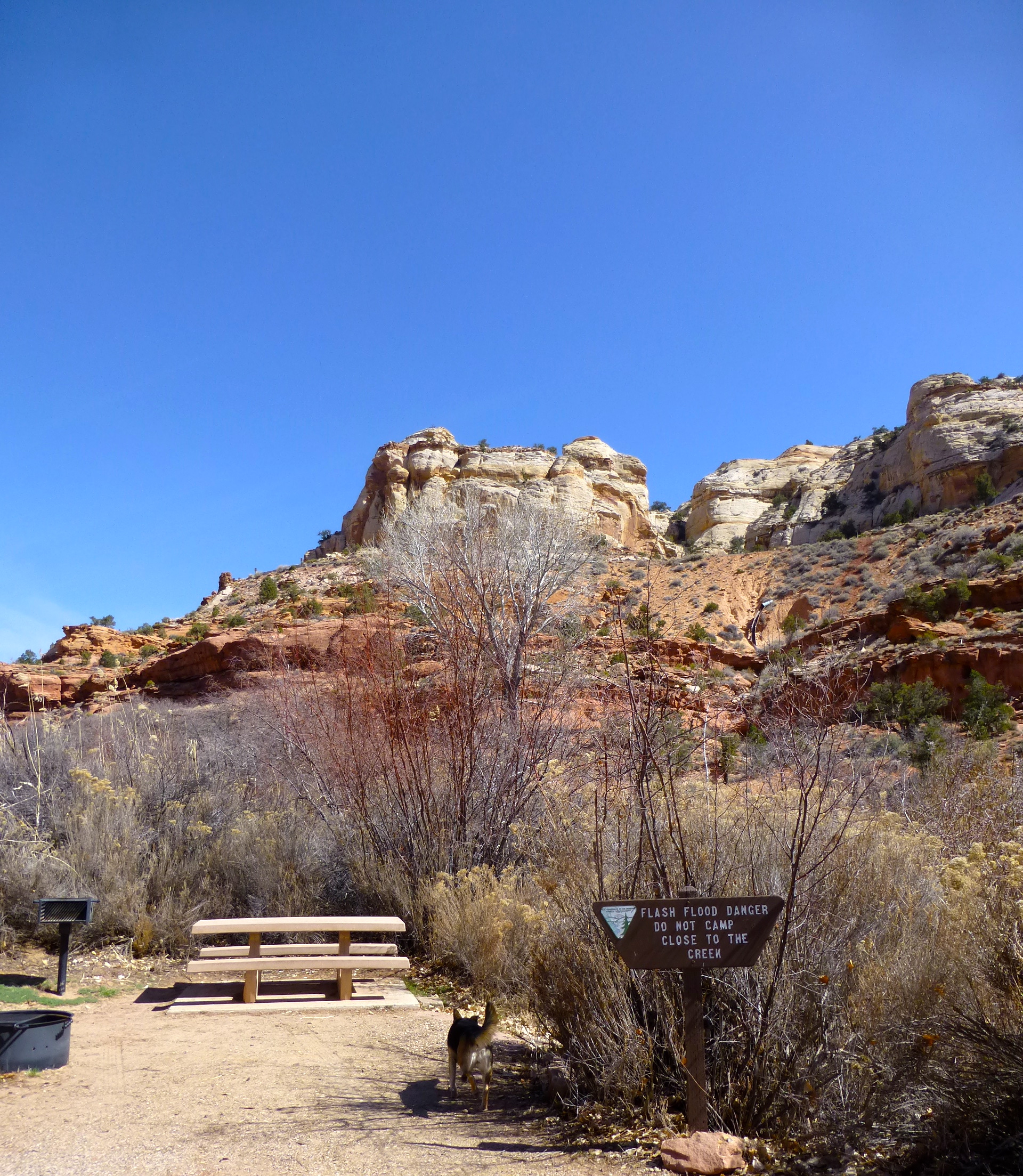 Our solitude on the trail was an incredible gift. Over the whole day, we passed only three or four groups of other hikers. In between chatting about John’s new job and upcoming summer trips, we relished the sounds of this painted desert canyon. Birds chattered away, their songs bouncing back and forth off of the sheer, red cliff sides. Calf Creek, in springtime fullness, burbled alongside us for the whole hike, providing extra fun for our part-fish dog. Three petroglyphs etched onto the walls across the canyon were a reminder of an ancient civilization, long extinct.