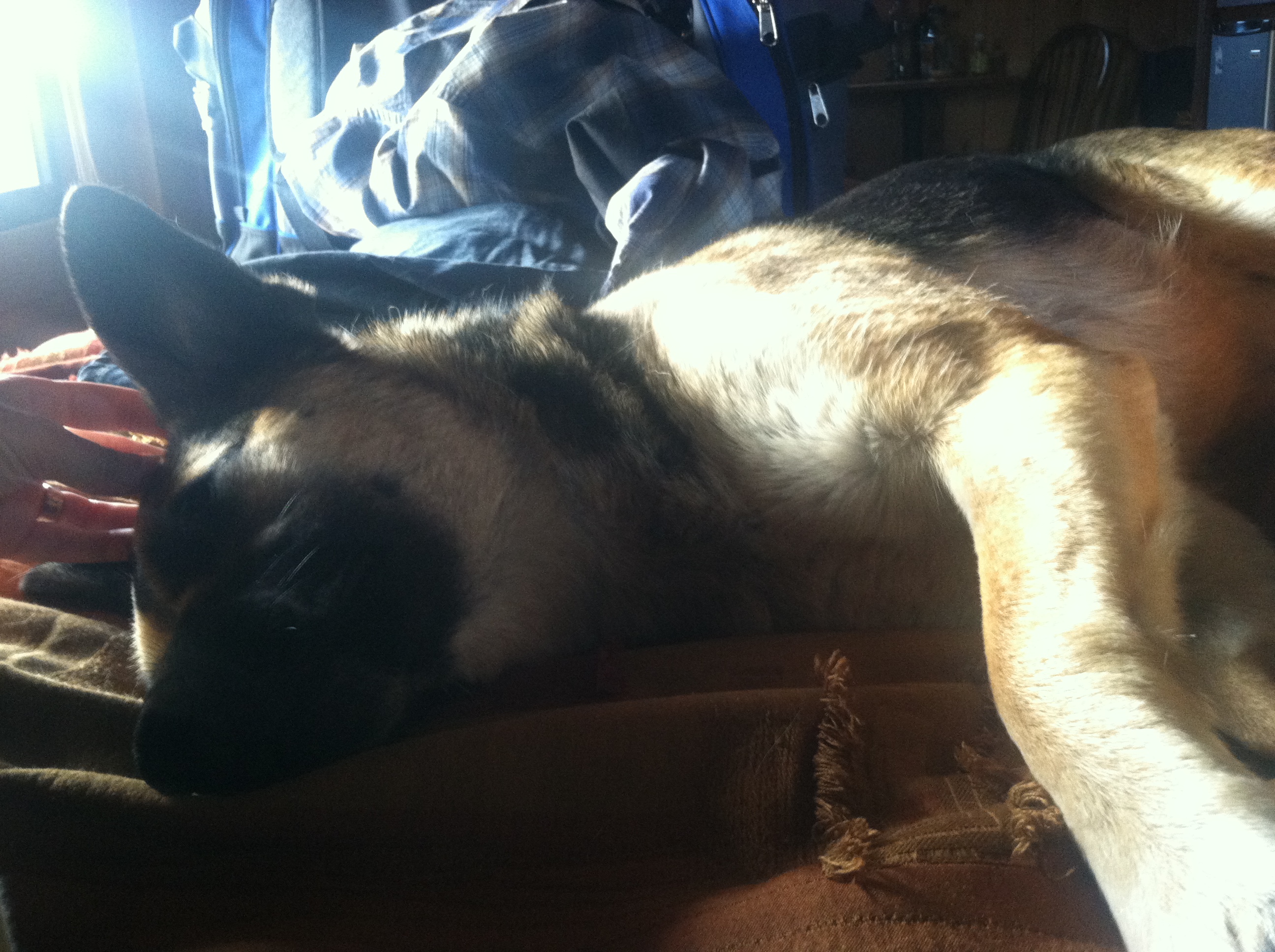 My main worry was my back. Treatment of my snowboard-fall/yoga-FAIL S.I. joint strain was in full effect: a short period of steroid pills, painkillers, prescription-strength anti-inflammatory pills as well as regular icing and light stretches. A strenuous hike was a guarantee to re-injure myself. I sat in a warm sunbeam, the heat from the stove at my back, and watched Cholula get happily filthy as I wrote in my journal. I felt apprehensive as we walked to the main lodge for breakfast: I didn’t want to ruin John’s time by limiting what we could do.