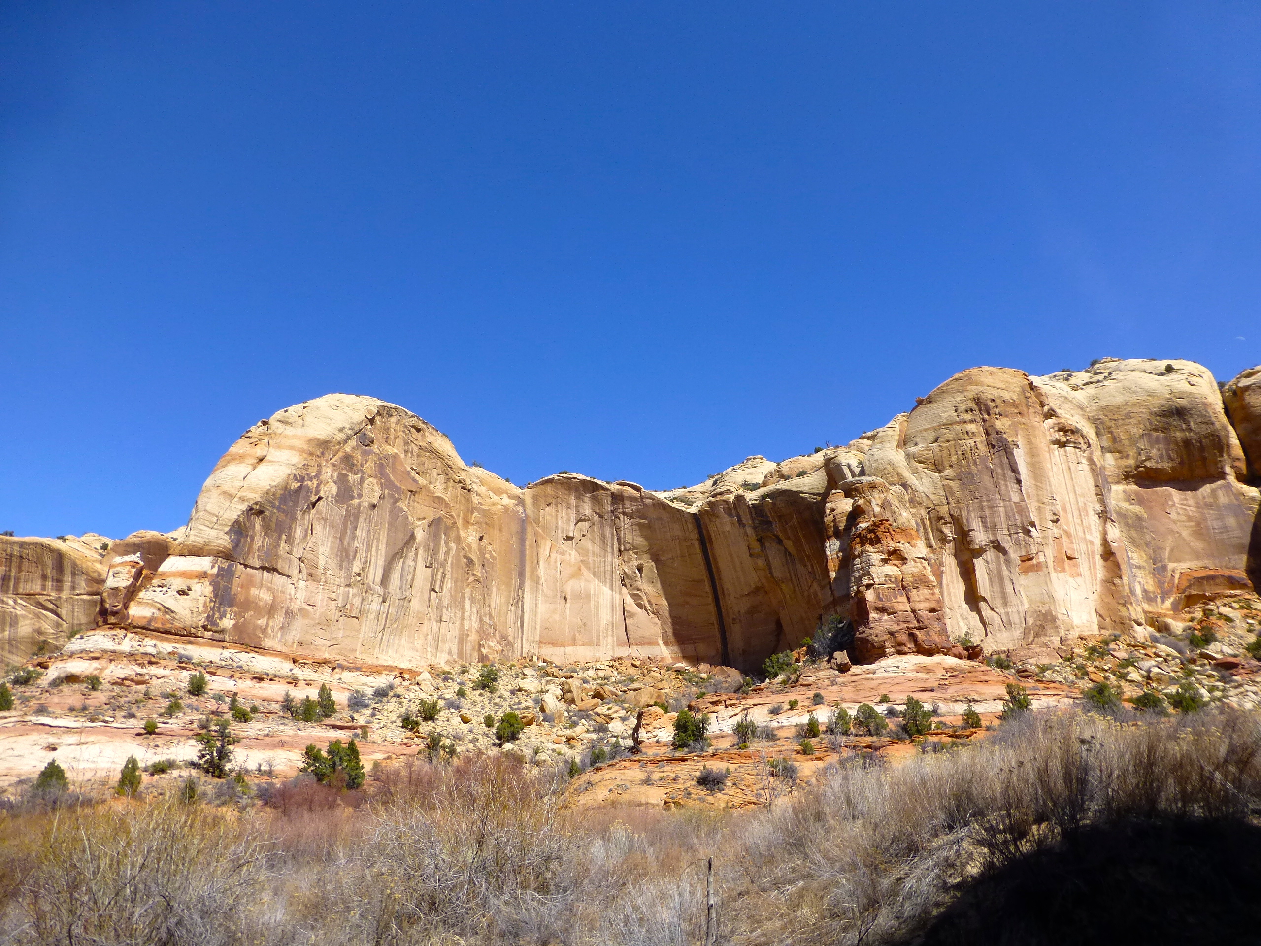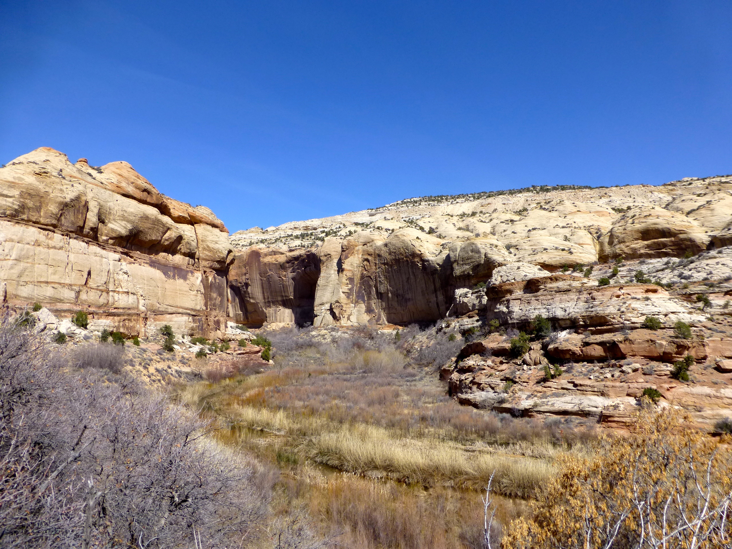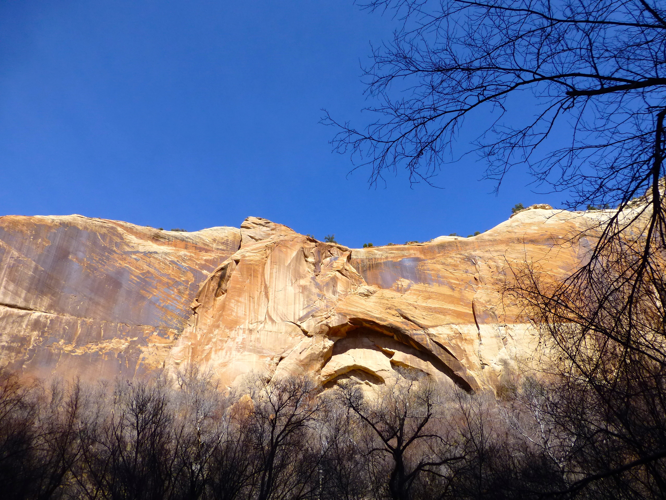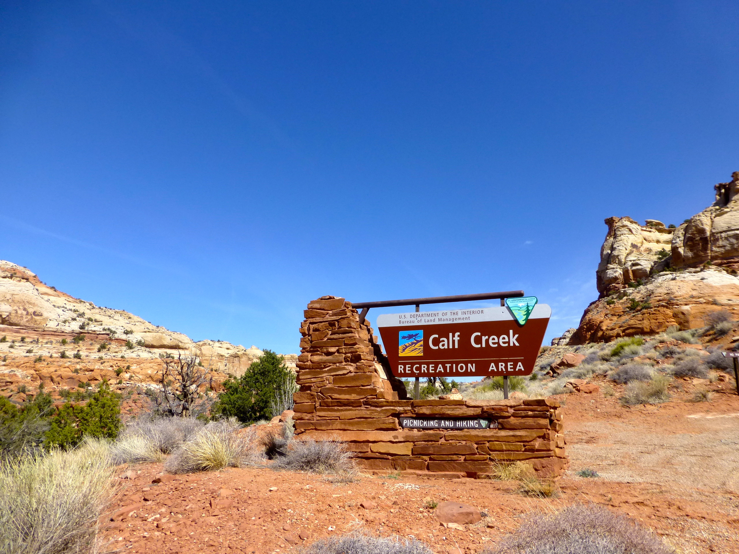 John discussed nearby low-impact hikes with our host and pored over topo maps of the area. We decided to try the minimal-elevation, 6-mile start-to-finish hike to Lower Calf Creek Falls. When we’d visited this part of Utah over Memorial Day weekend a couple of years ago, we’d driven to Calf Creek campground- it was crawling with people, overstuffed with RVs and VW Vanagons. Now, in mid-March, it was a mostly-deserted wasteland, save another dusty Subaru and a hippie’s Westfalia. Perfect.