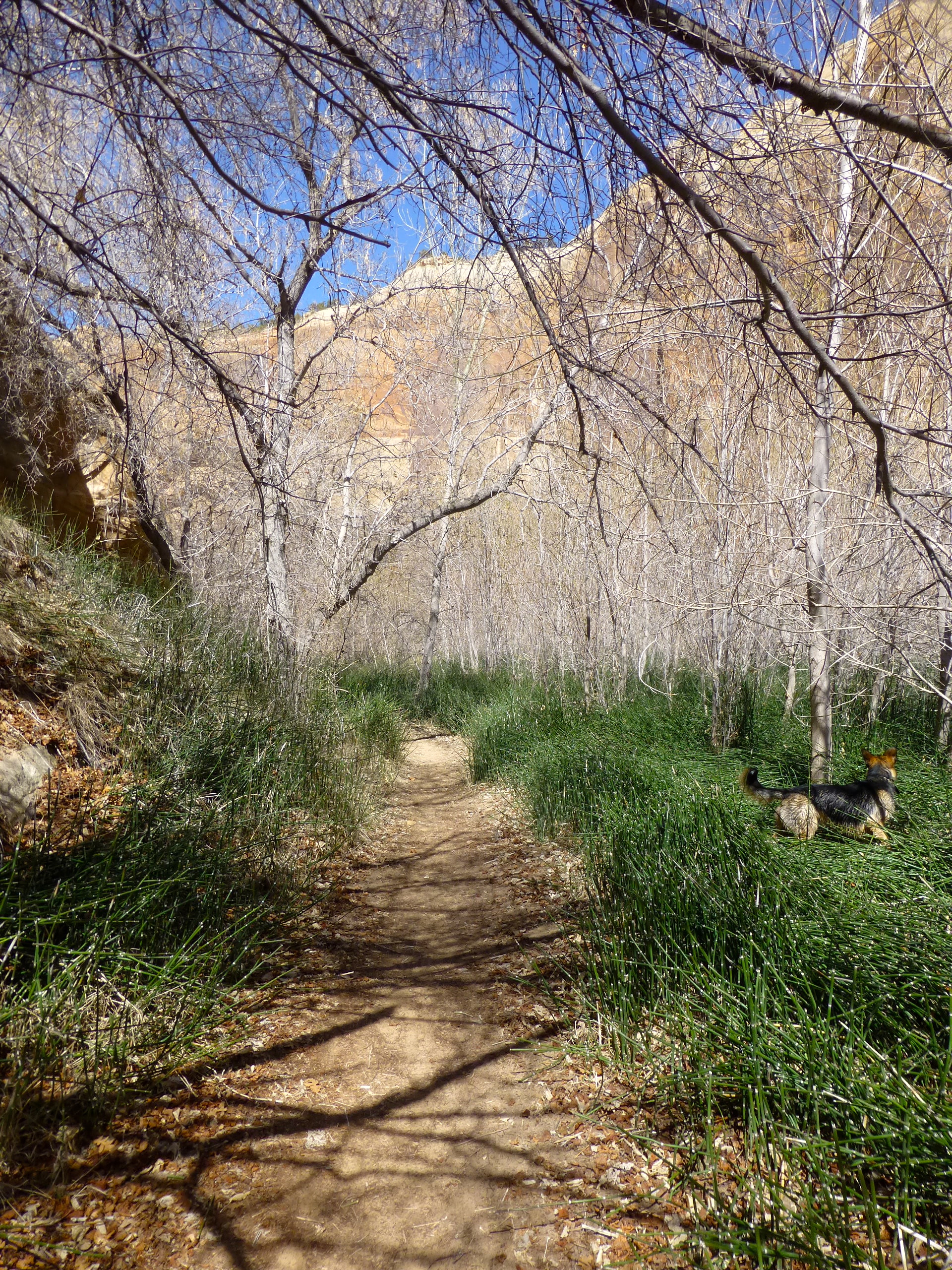 Signs of life emerging after months of harsh desert winter were everywhere- the green reeds along the creek bed, the fresh purple of new cactus, an occasional blooming desert flower bringing a pop of unexpected color to the muted dirt. Gnawed-on tree trunks provided evidence of hard-working beavers. At one point, we bent down to see what Cholula was so interested in a tangle of branches. Then the barren sticks came to life, a squirming, writhing ball of SNAKES, likely just emerging from their hibernation hole. There were at least 10 of them, and from that point on, every branch was a threat.