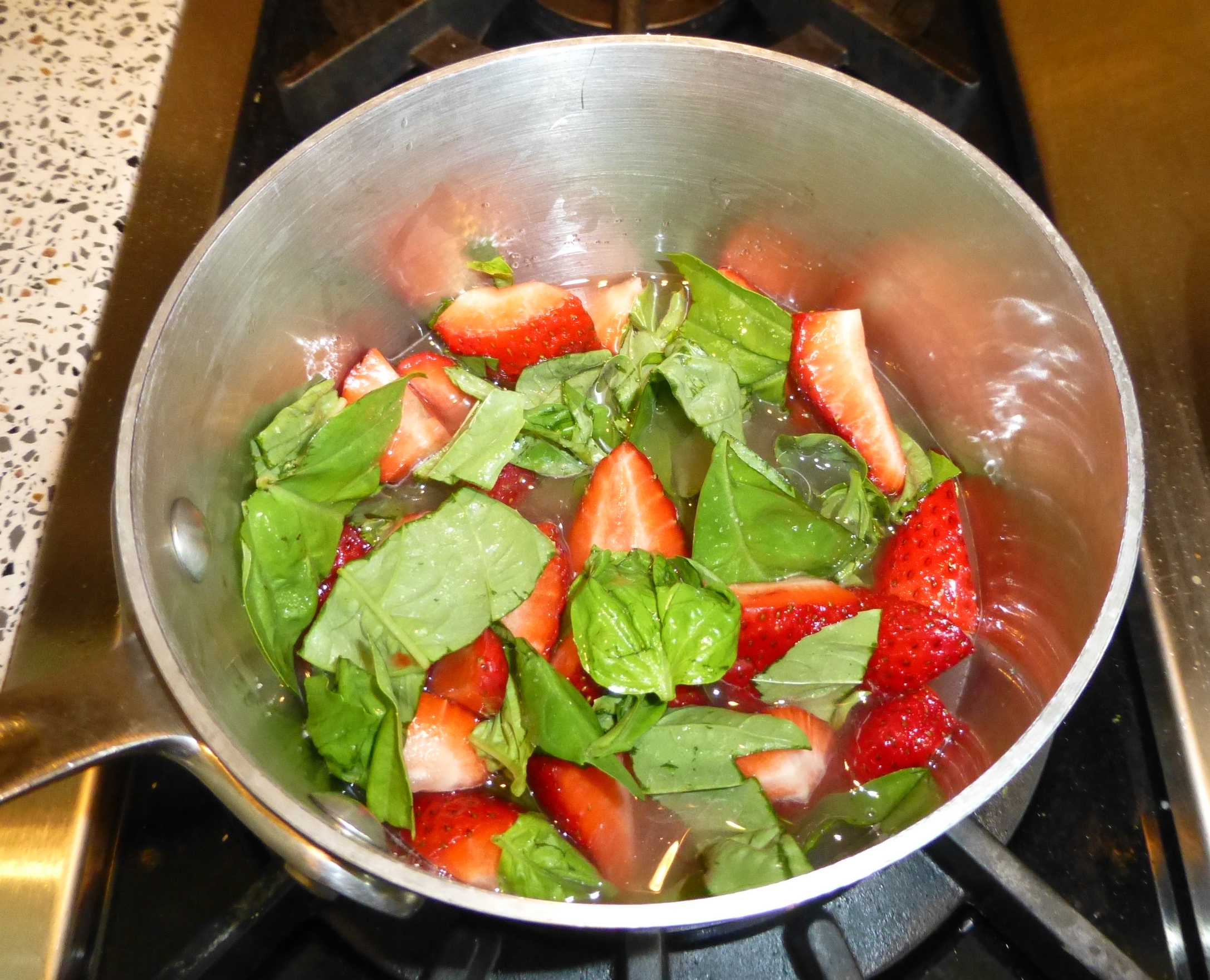 Combine the water, sugar, strawberries, and basil in a medium saucepan over medium heat. Let the sugar dissolve and simmer for about 10 minutes, stirring often.