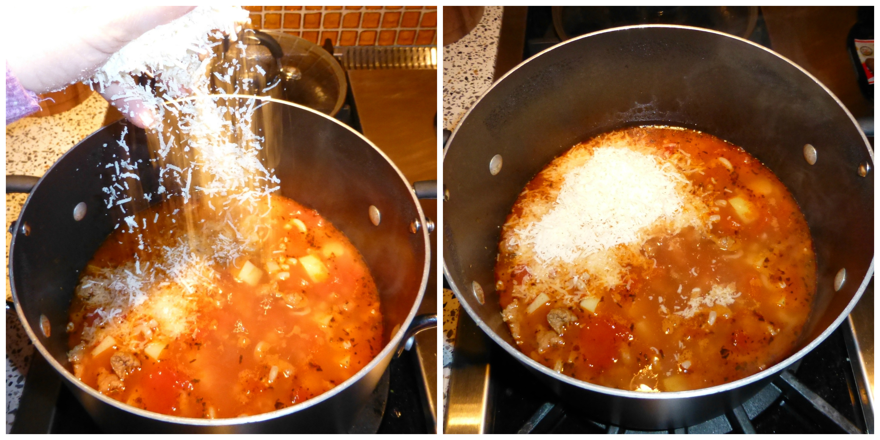 I topped each bowl with more parmesan and a sprinkle of basil. The flavors of the sausage and the chicken stock somehow come together into a spicy, rich base. I liked the chunkiness that the potatoes brought to the soup- they made it hearty and filling. Don’t skimp on the cheese- the salty tang really adds to the overall flavor. Positively delicious– and so easy.