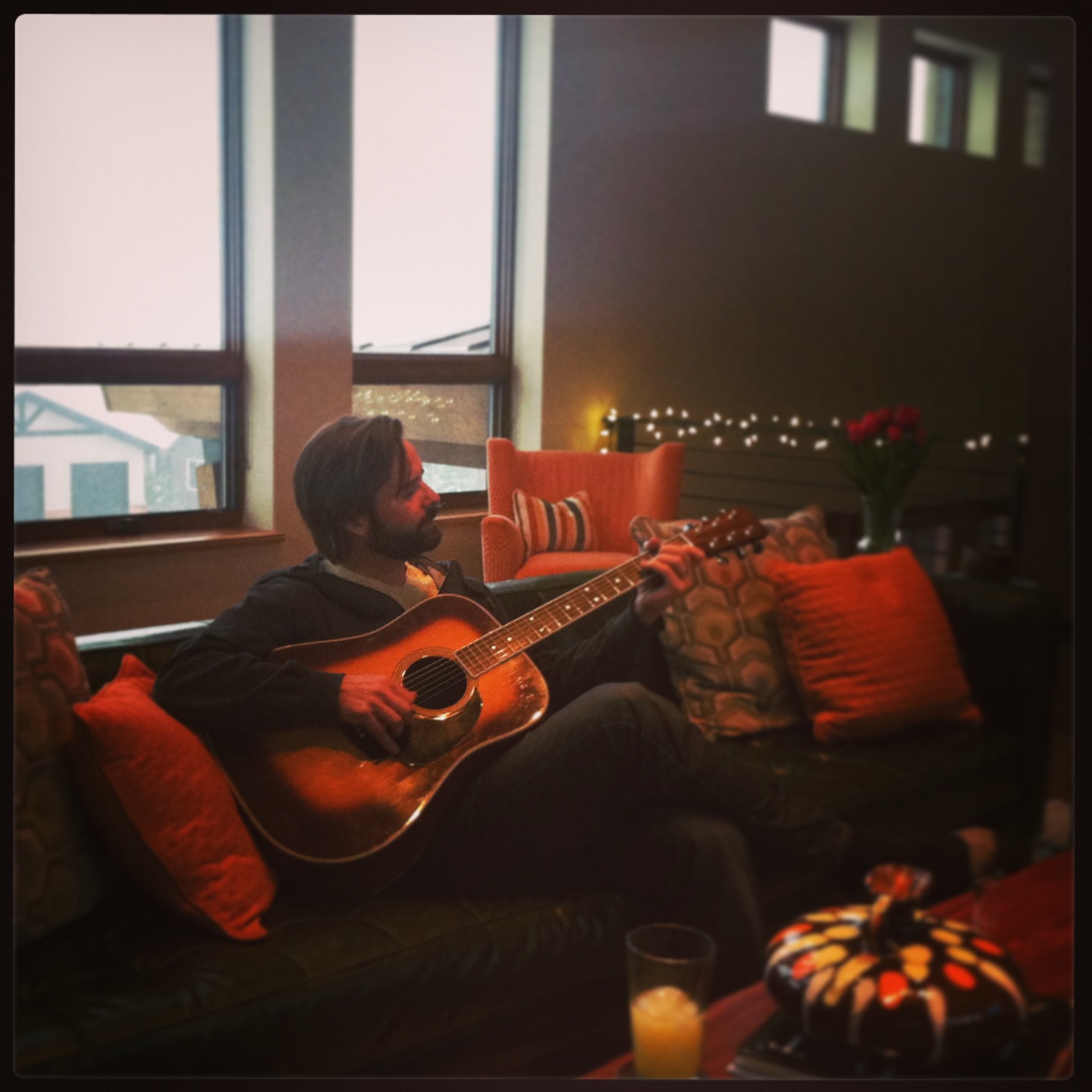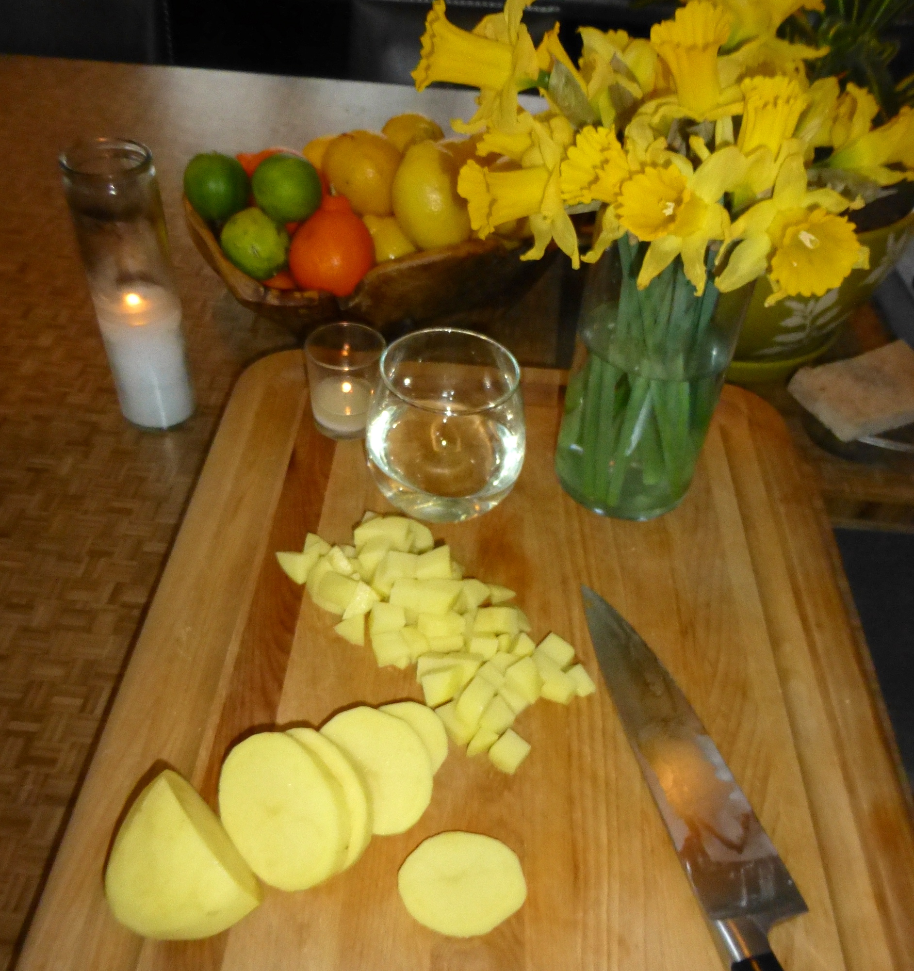 The soup came up to a boil, so I turned the heat down to simmer and put the lid on the pot. I wanted the potatoes to have some time to get tender. I shredded a big pile of good parmesan cheese and chopped up some fresh basil. John took the opportunity to sing me a song and the snow kept falling outside. How dreamy is this?