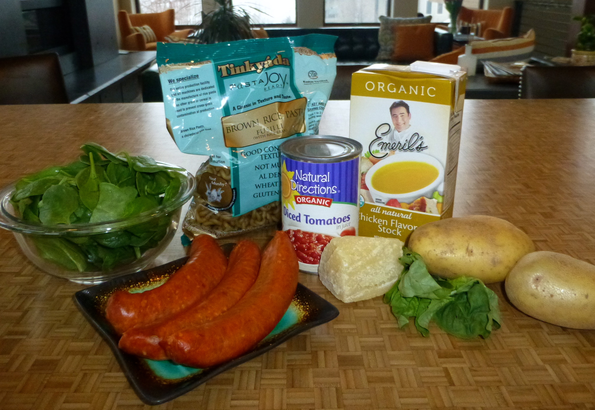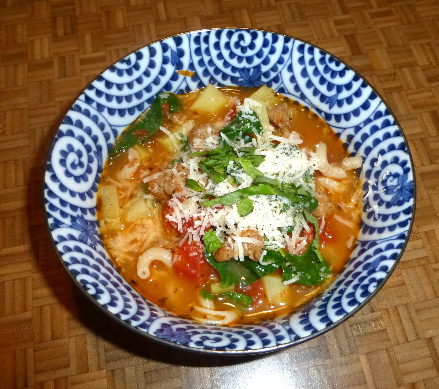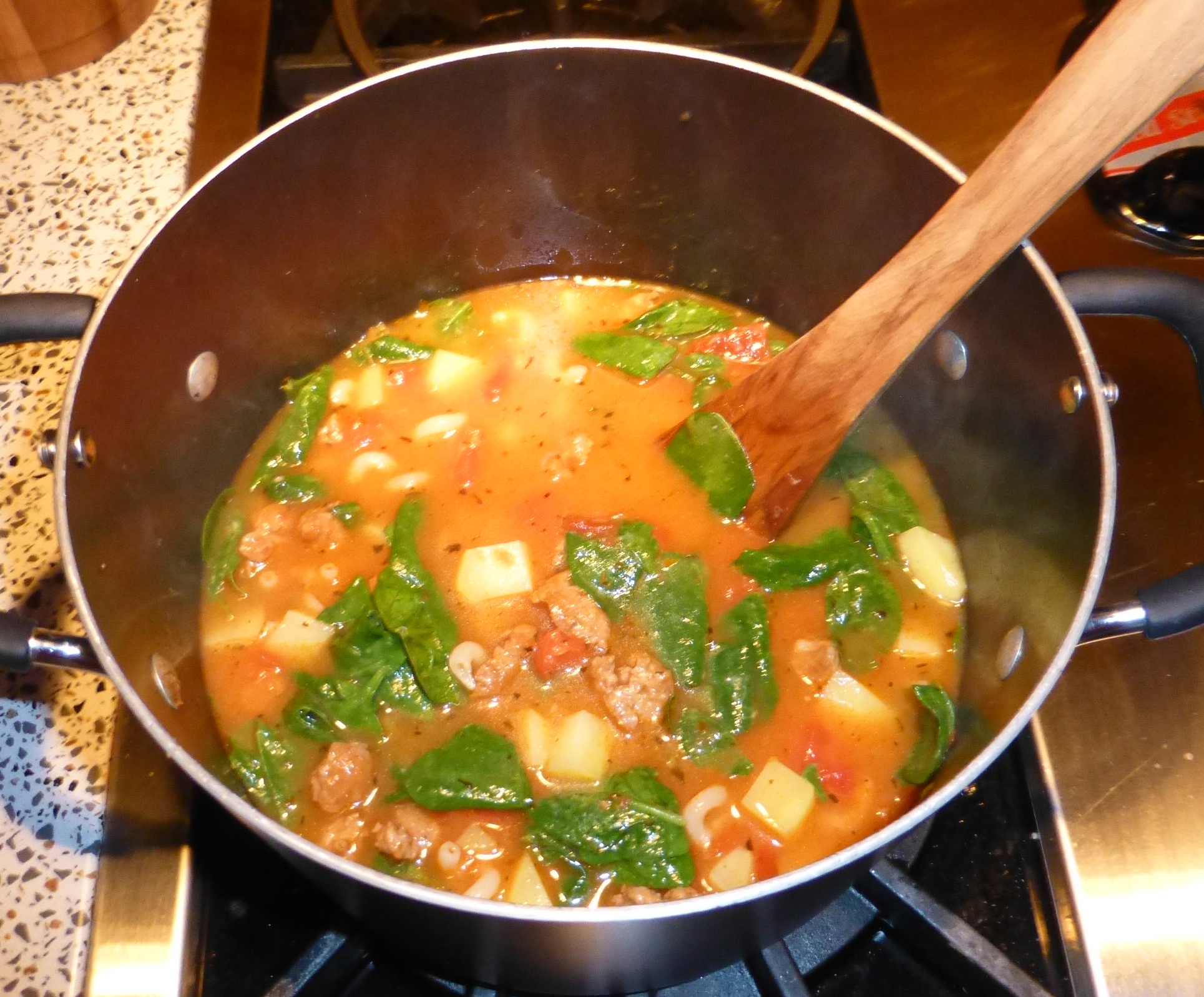 Brown sausage in a large pot. Add tomatoes, potatoes, and chicken stock. Cover and simmer until the potatoes are firm-tender. Add most of the cheese, some of the basil, and the spinach. Stir until the spinach is wilted. Add the pasta. When the pasta is done, serve in bowls topped with the remaining basil and Parmesan cheese. Don’t forget your slippers. Yum!
