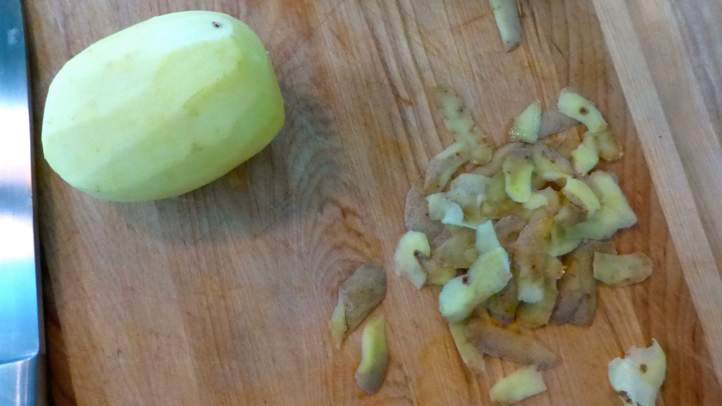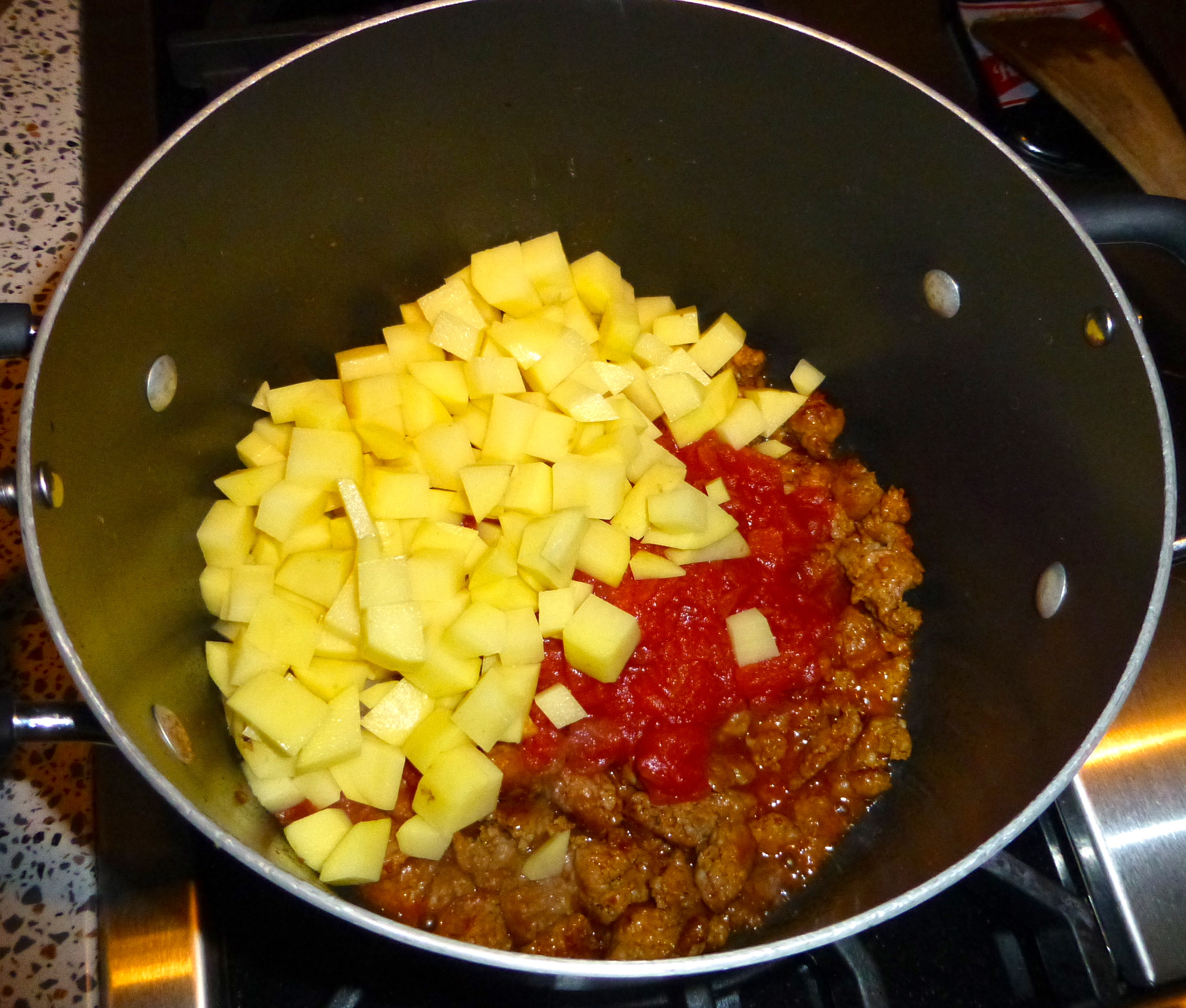 While the sausage did its thing, I peeled and chopped two potatoes and opened a can of diced tomatoes. Prep for this soup is seriously easy.