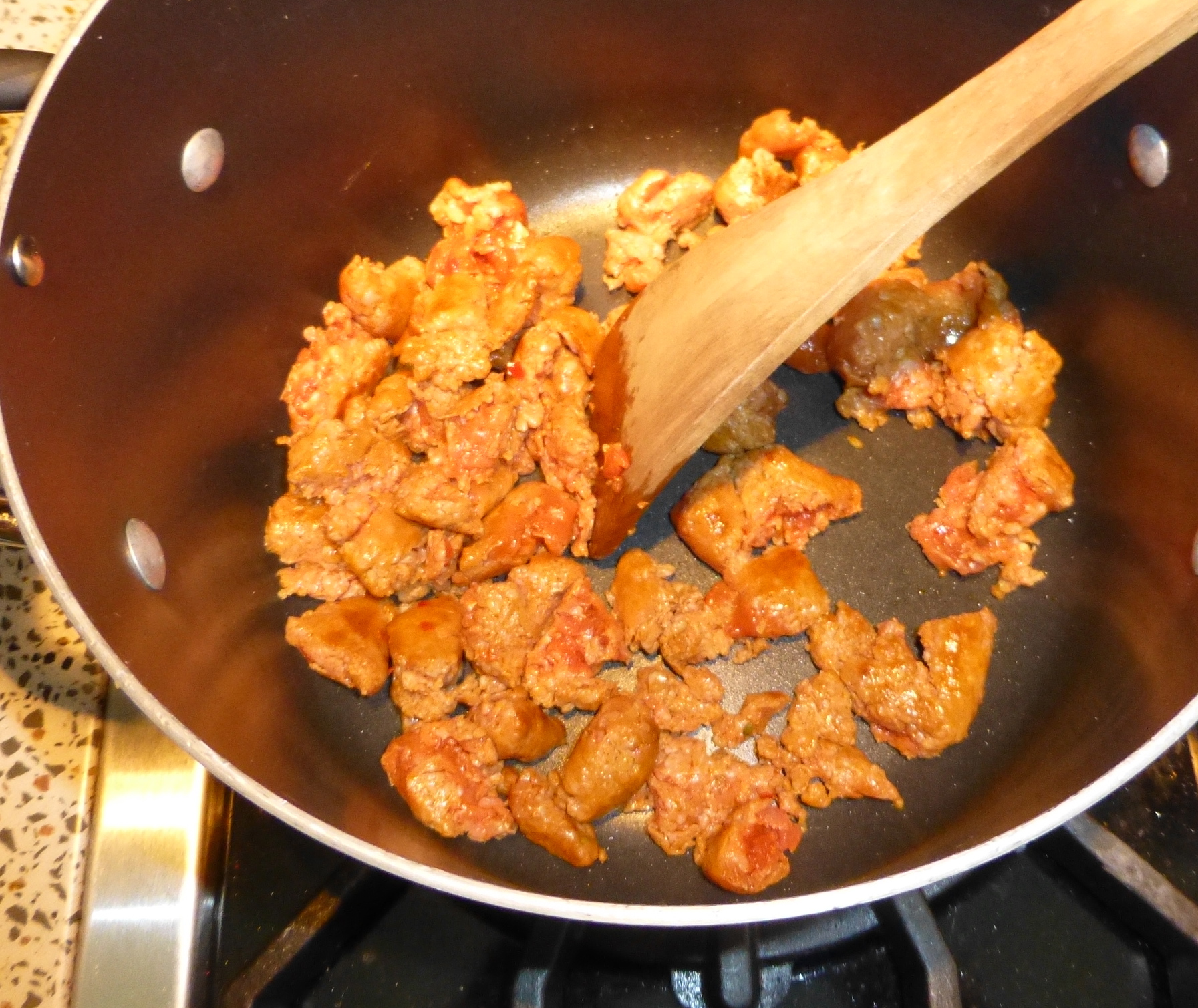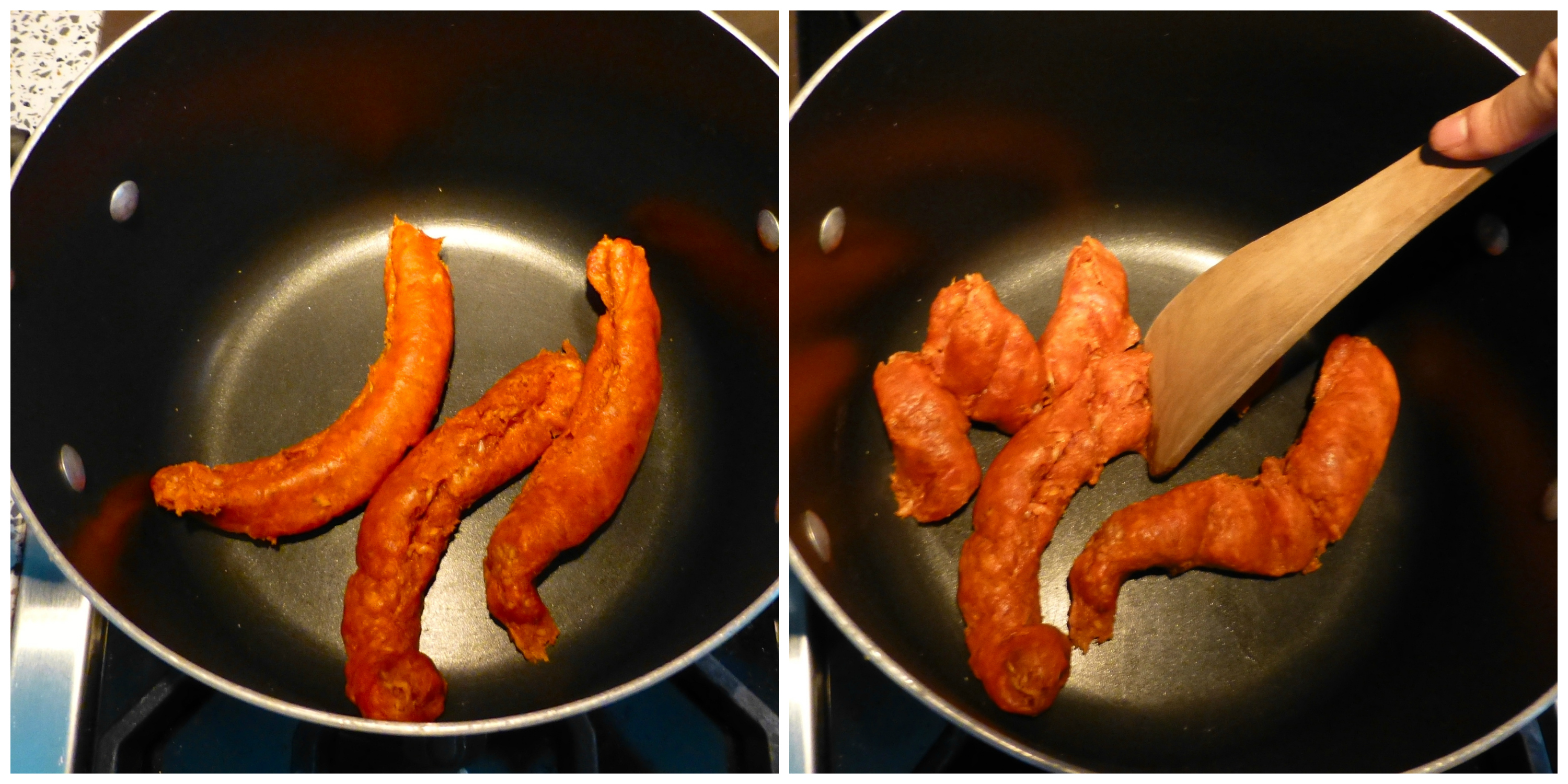 Usually, I use the ground hot Italian sausage, but when your sweet hubby goes to the market for you on a snowy day, you improvise. I cut the sausage casings and started browning the meat.