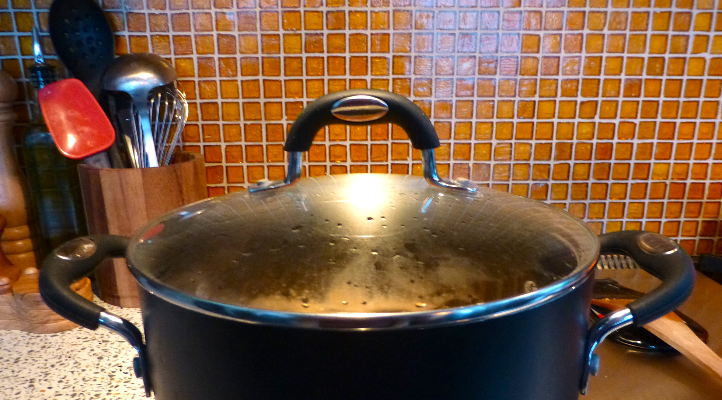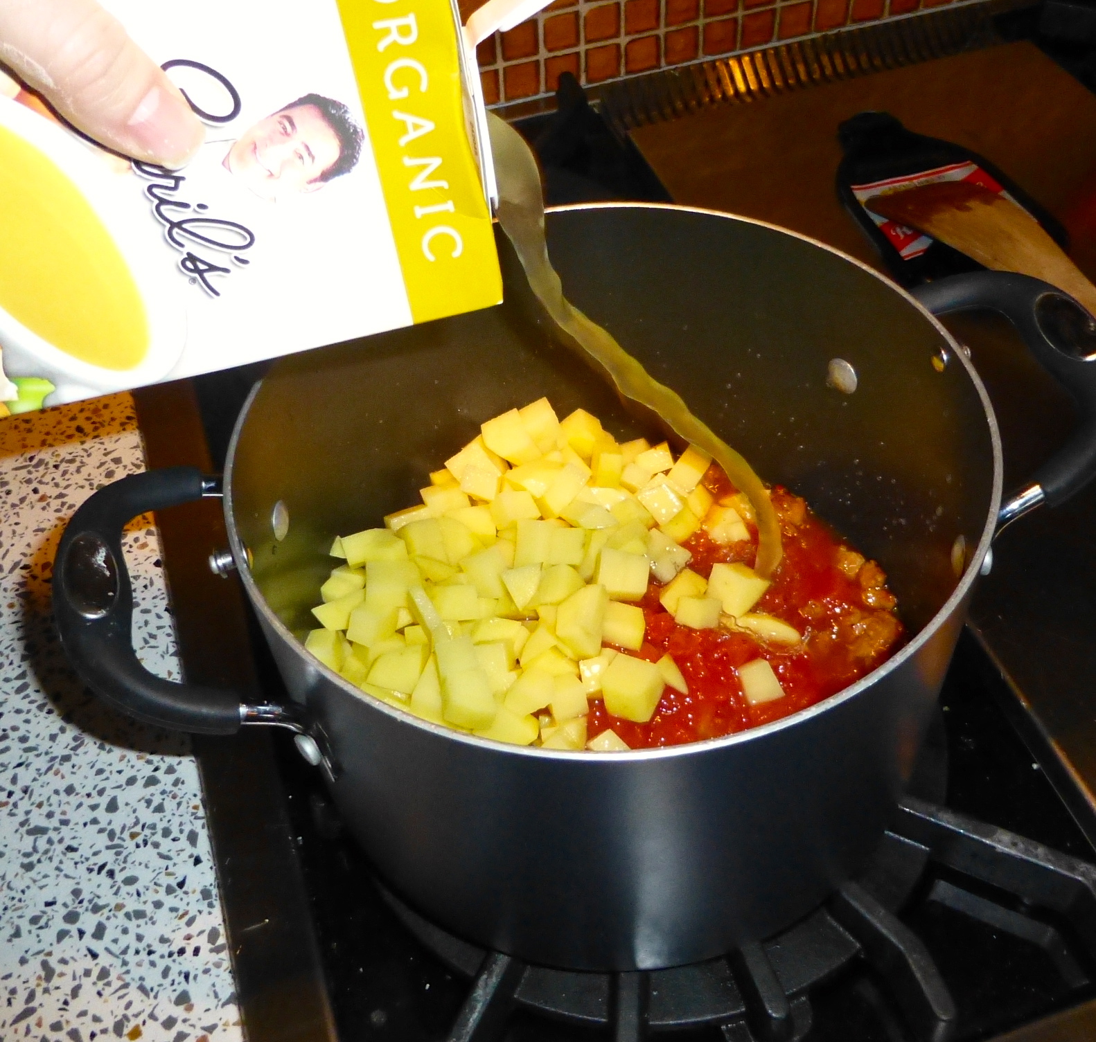 Once Cholula approved of the sausage’s status, I added the tomatoes to the pot. Then came the potatoes and a quart of chicken stock. Since I didn’t know what flavors these particular sausages would have, I added some dried oregano and basil to the soup.