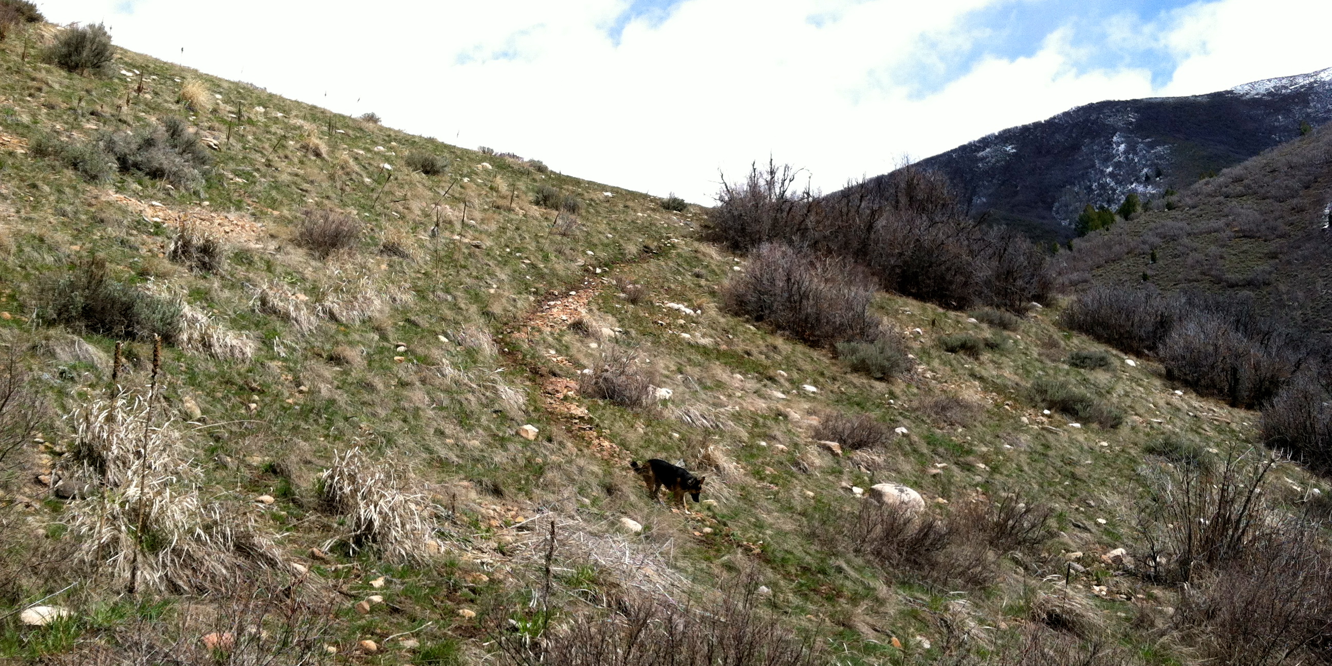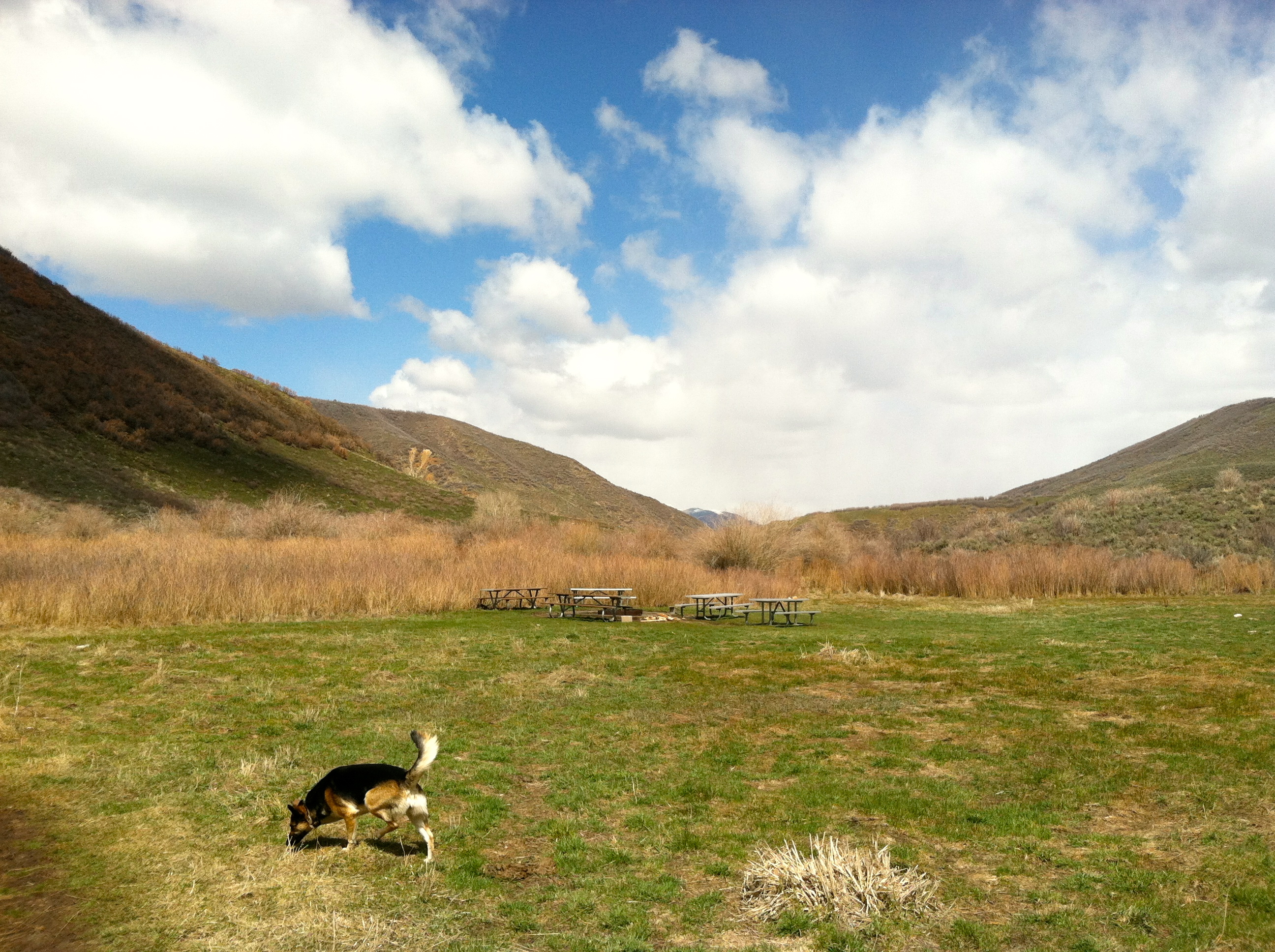 This trail is part of the original Mormon Trail that the pioneers used when settling this area in the 1800s. Cholula happily zig-zagged back and forth across my path, and I was silently happy each time she bounded through the paw-cleansing creek that ran beside (and sometimes over) the trail. I kept thinking it would dry out, but it never really did. I resigned myself to mud-caked shoes and a carwash later this week.