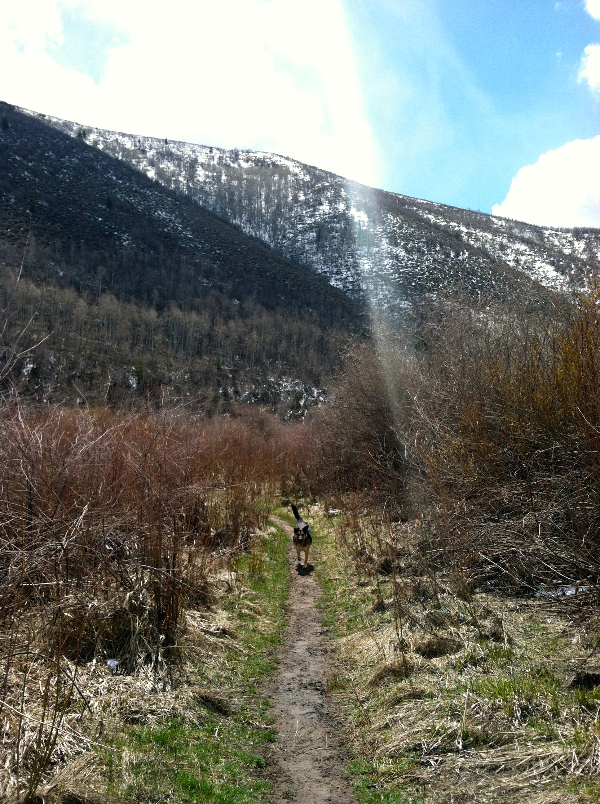 Within minutes, one thing became crystal clear: we deep into mud season. In climates like Park City’s, there’s a period of time between snowpack and green when the snow melts and everything is MUDDY. For dog-owners, these are the months when a basket of towels lives by the door to try to clean wet and filthy paws. I felt the squish-squish of my shoes as I walked and watched as Cholula’s paws turned mucky. I decided that the extra time it would take to clean up would be worth the fun we were both having. Mud comes off.