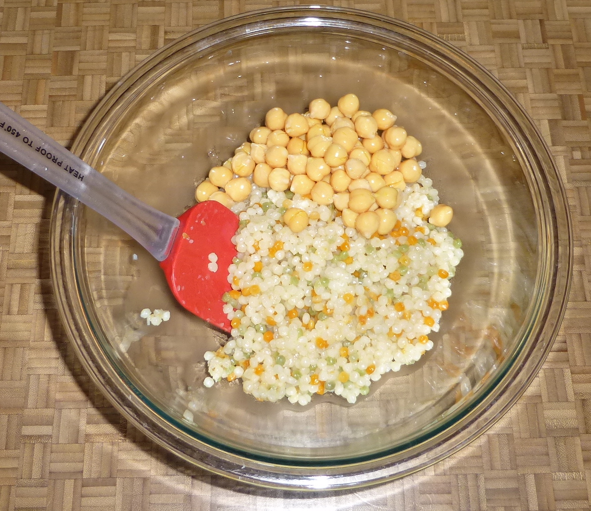 Have you ever made Israeli couscous? Instead of teeny little granules, the pasta balls are a little bigger- mini-pearls. I used tri-color couscous, and prepared it according to the package using chicken broth instead of water.