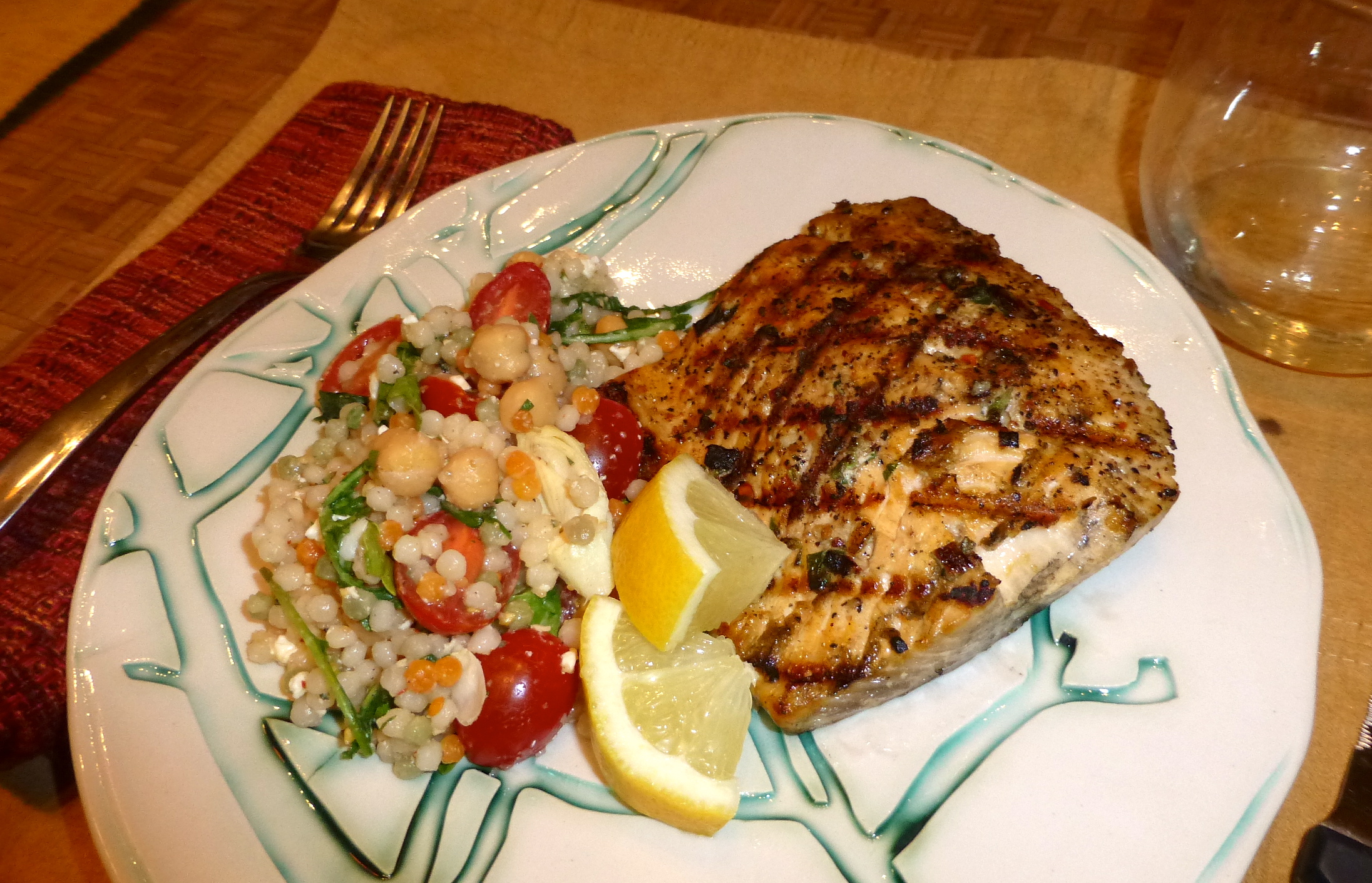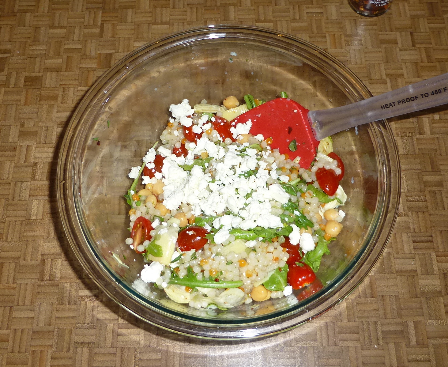 The first recipe came together as I was making it. John had plans to grill some fish, so I put together some ingredients I had on hand and hoped for the best. The result was Israeli Cous Cous Salad with Artichokes and Feta– and it was delish!