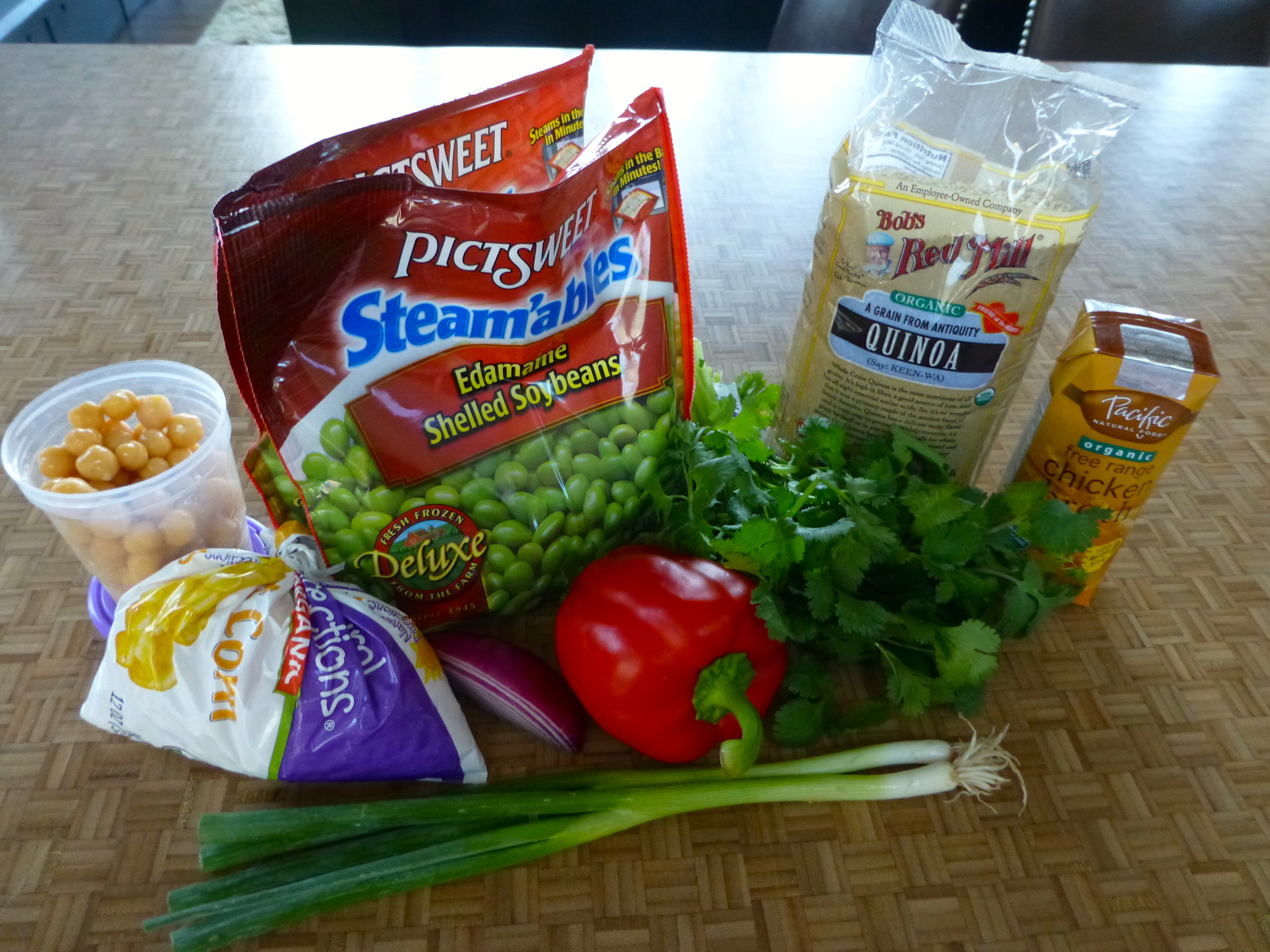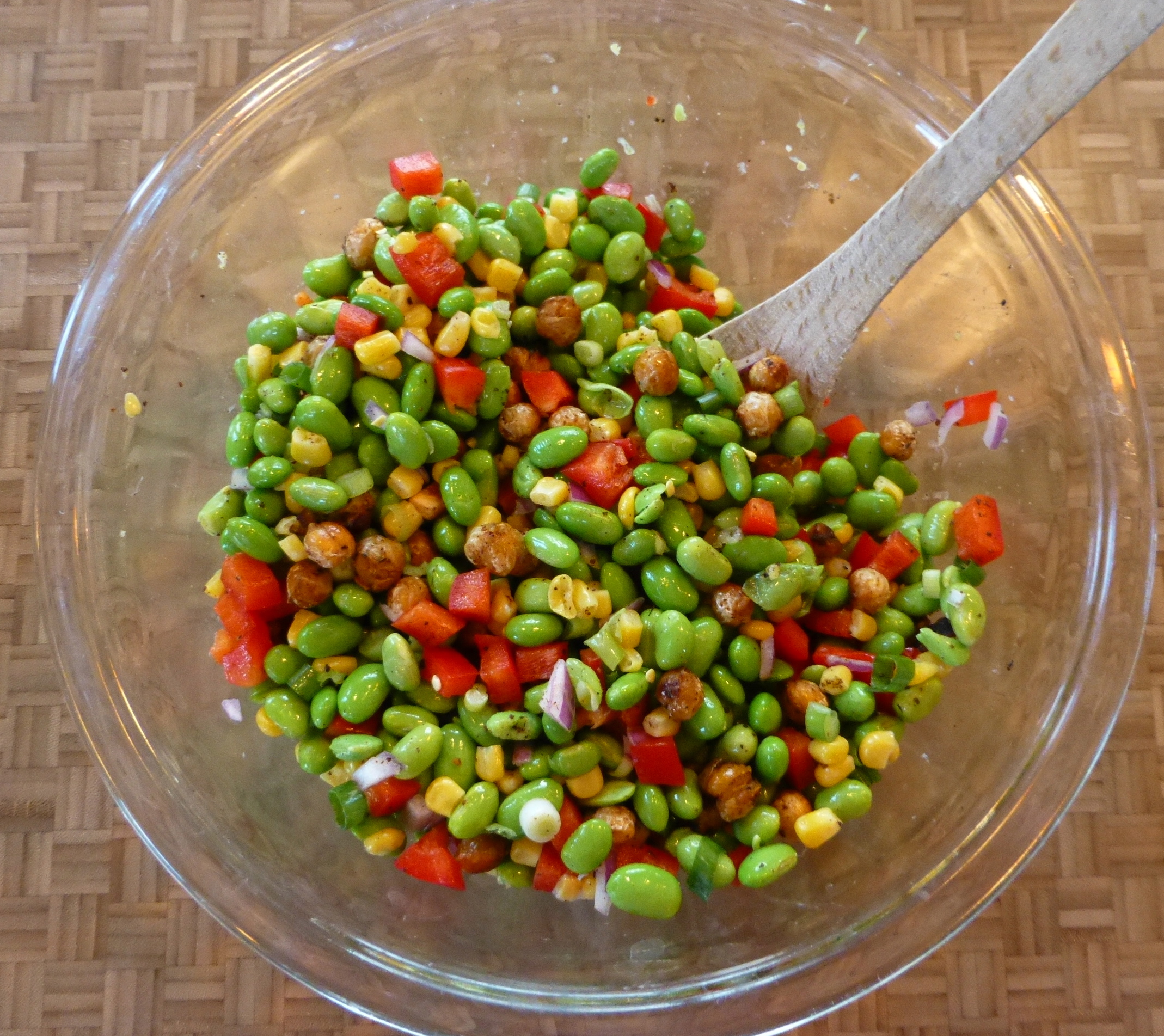 In a large bowl, combine the edamame, corn, quinoa, green onion, red pepper, cilantro, and garbanzo beans.