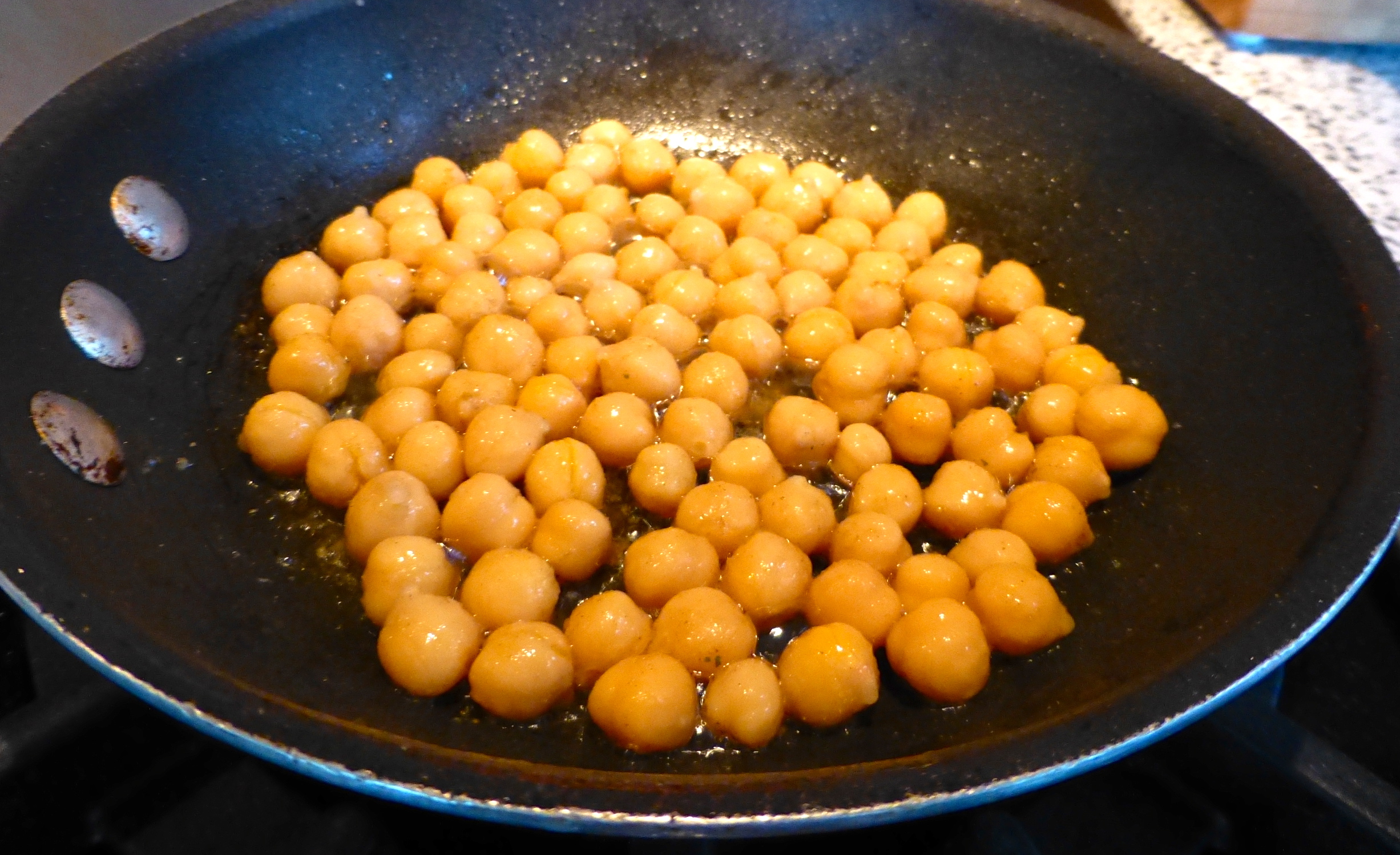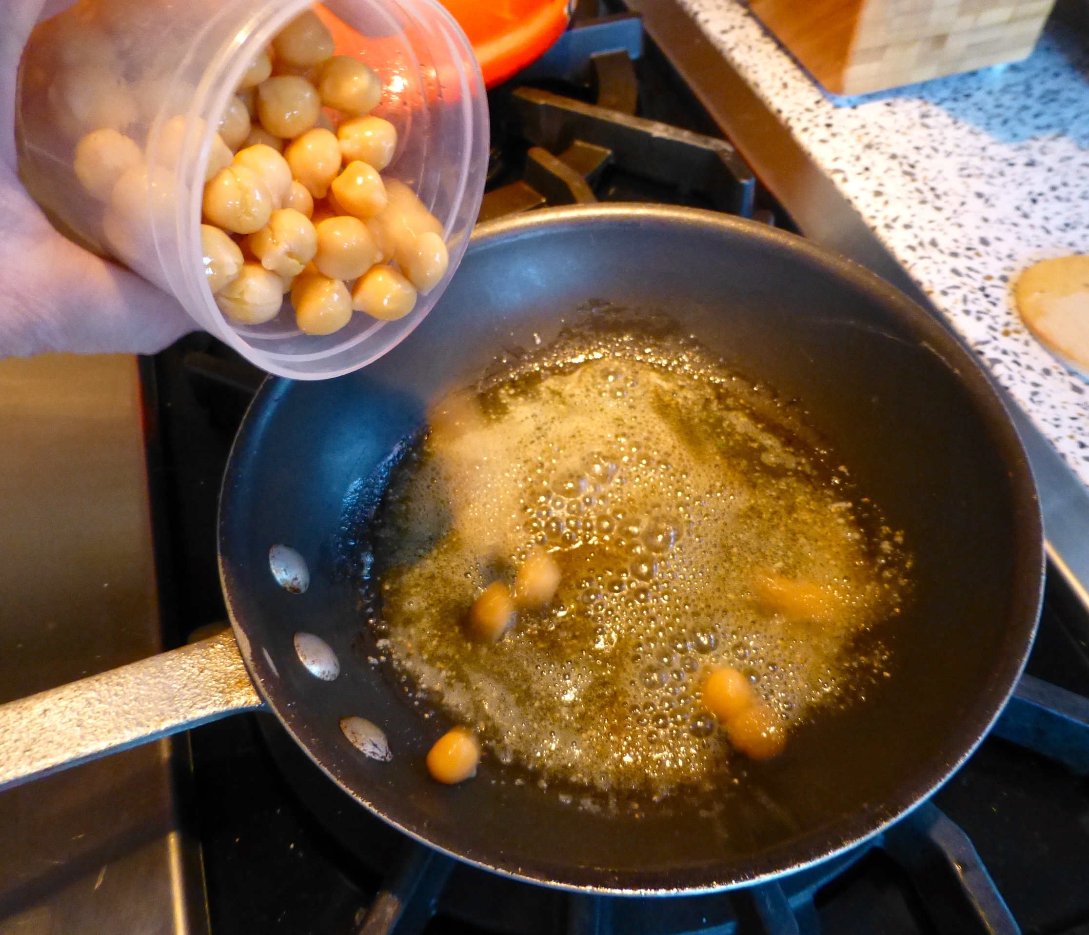 In a small fry pan, heat a little olive oil and a teaspoon of butter. Add half a can of drained garbanzo beans. Season well with garlic salt and cumin. Let them cook, stirring occasionally, until the beans get browned and crunchy. Set aside.