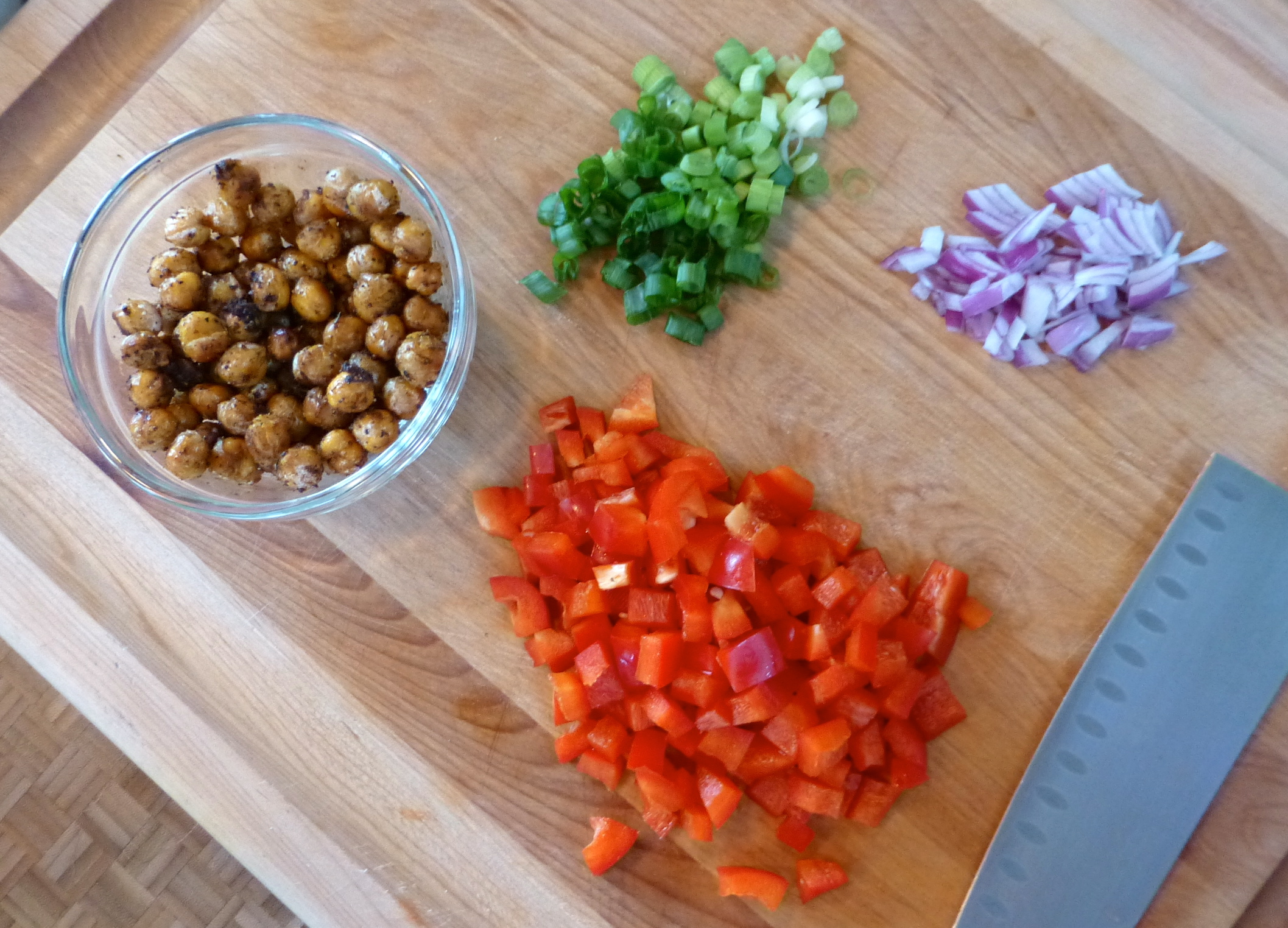I started by preparing the quinoa according to the package (again, using chicken broth instead of water). While that was doing its thing, I had a crazy idea to use up the leftover garbanzo beans. Instead of just stirring them into the salad, I decided to try to blister them with seasoning in a fry pan. It’s my new favorite thing. I was envisioning crunchy little alternatives to croutons. I heated up a little oil and butter in the pan, added the garbanzo beans, and sprinkled a generous amount of garlic salt and cumin on them. They came out browned, nutty, flavorful– delicious!