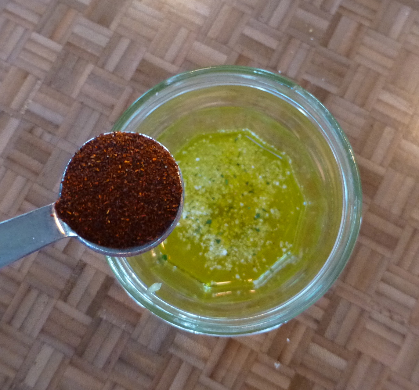 The quinoa wasn’t done yet, so I got started on the dressing. In a little jelly jar, I added olive oil, lemon and lime juice, garlic salt, chile powder, dried thyme, cracked black pepper, and some cayenne. I tightened the lid, gave it a good shake, and the dressing was DONE. So easy.
