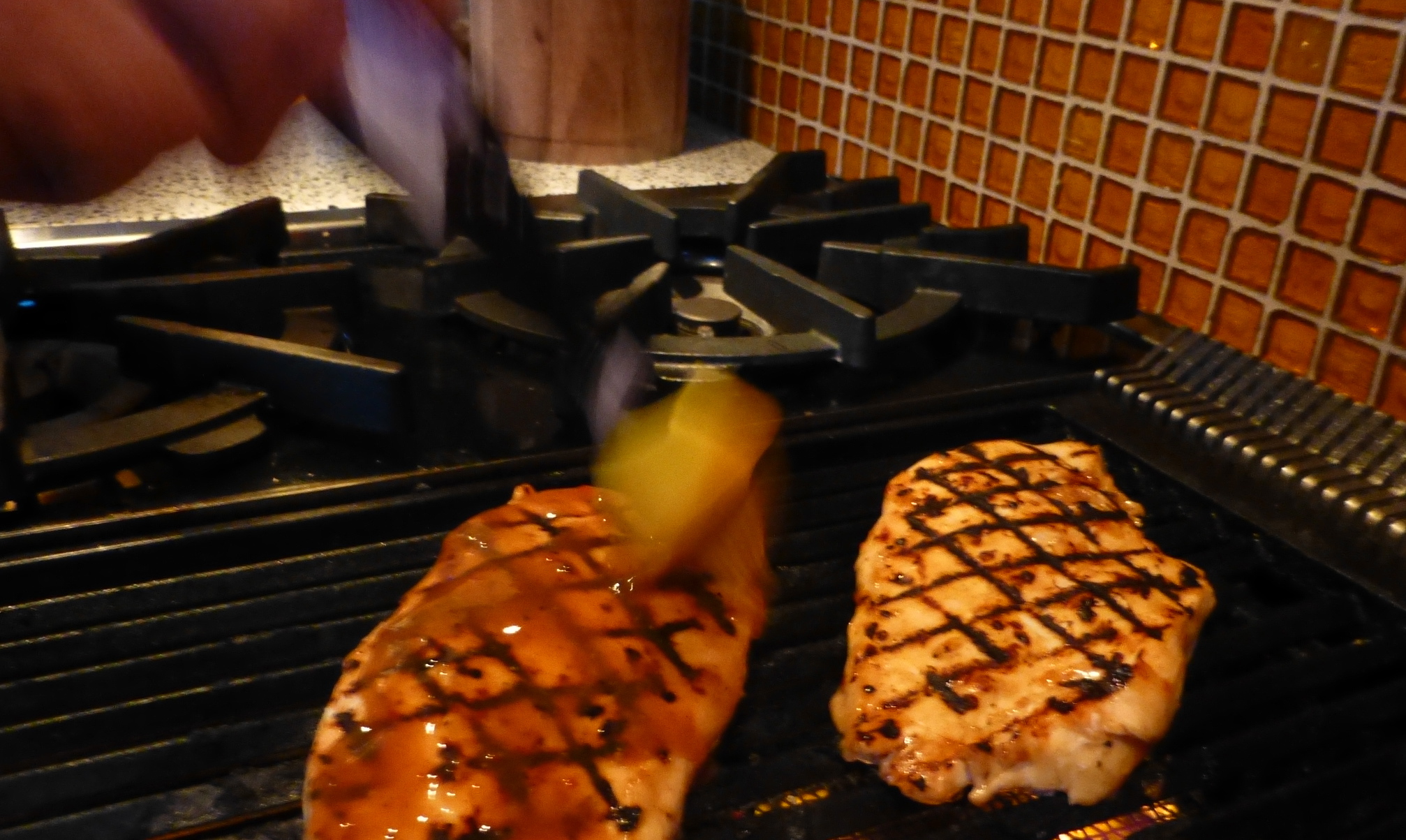 John grilled some chicken breasts, which I’d let sit in a store-bought spicy mango marinade for an hour or so. We sliced the chicken and served it right over the edamame quinoa salad. Scrumptious!
