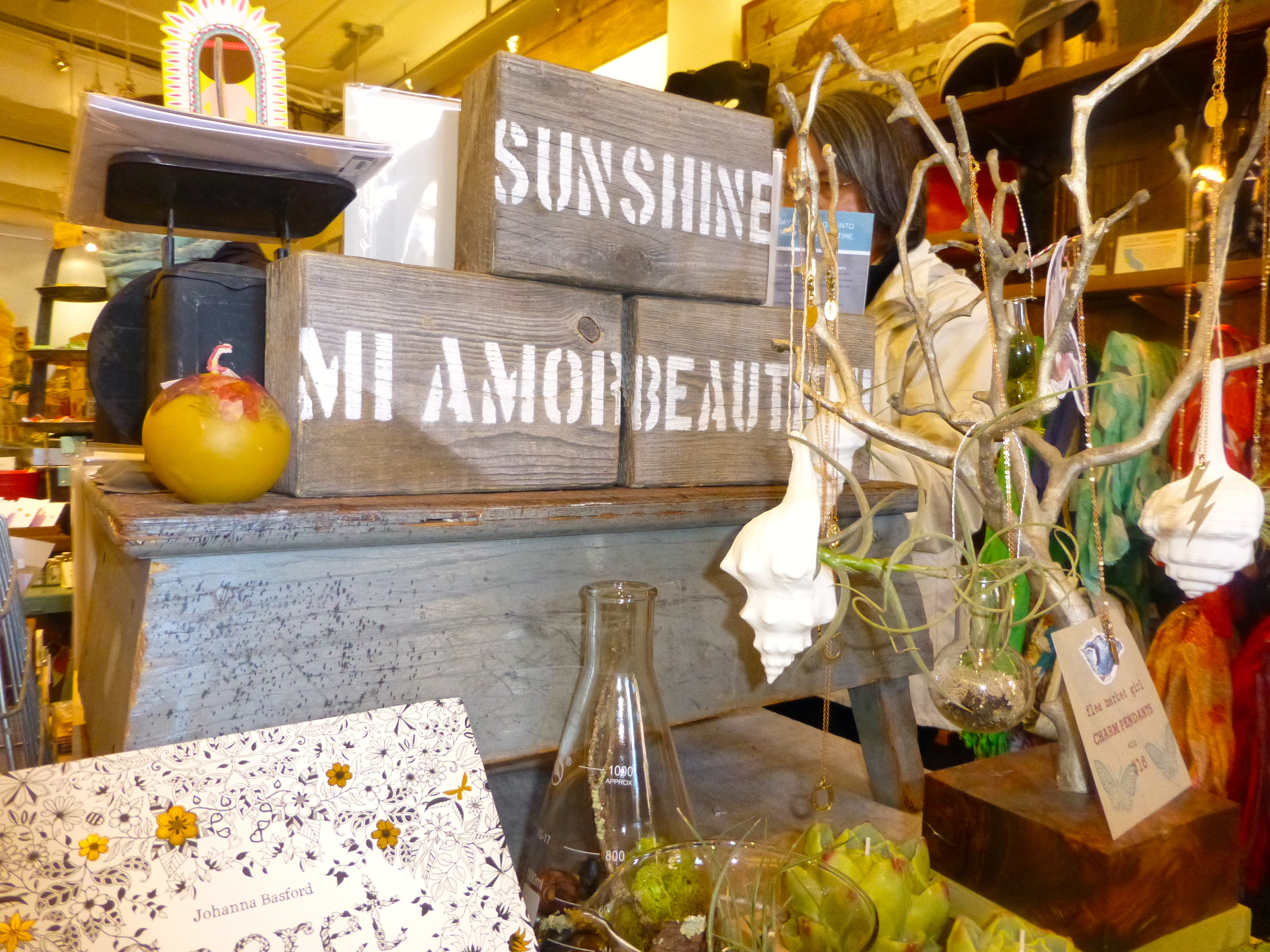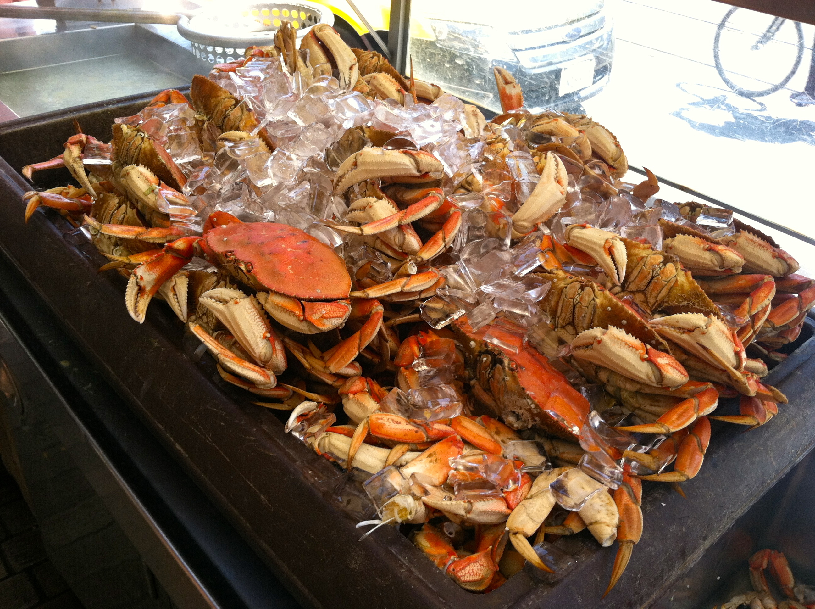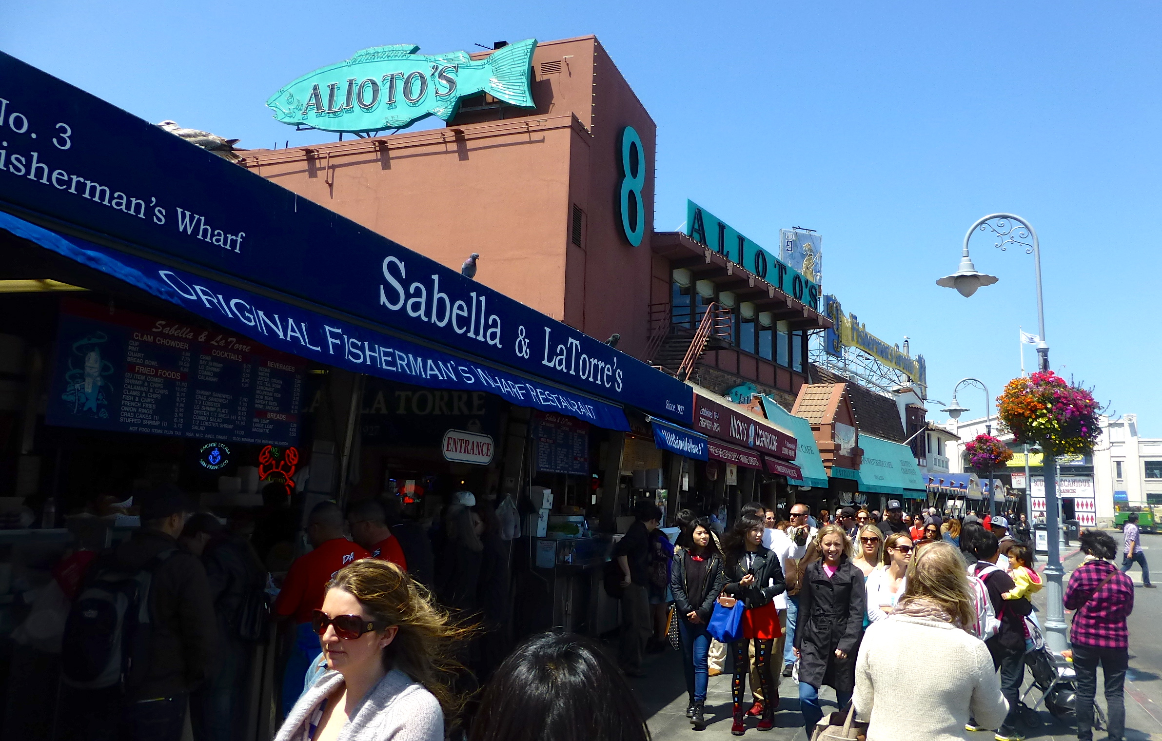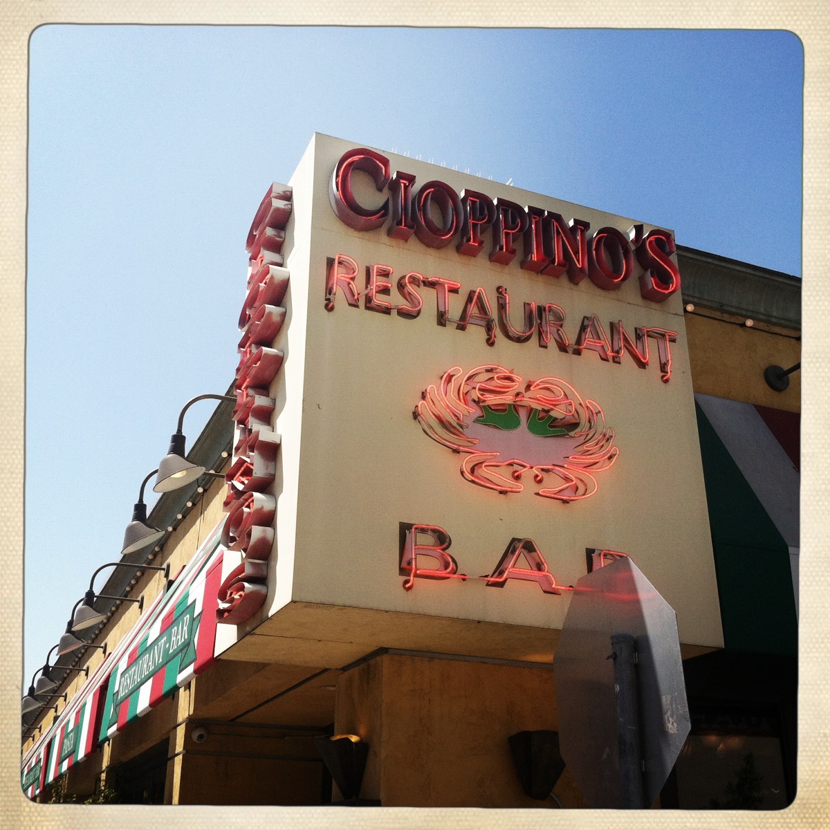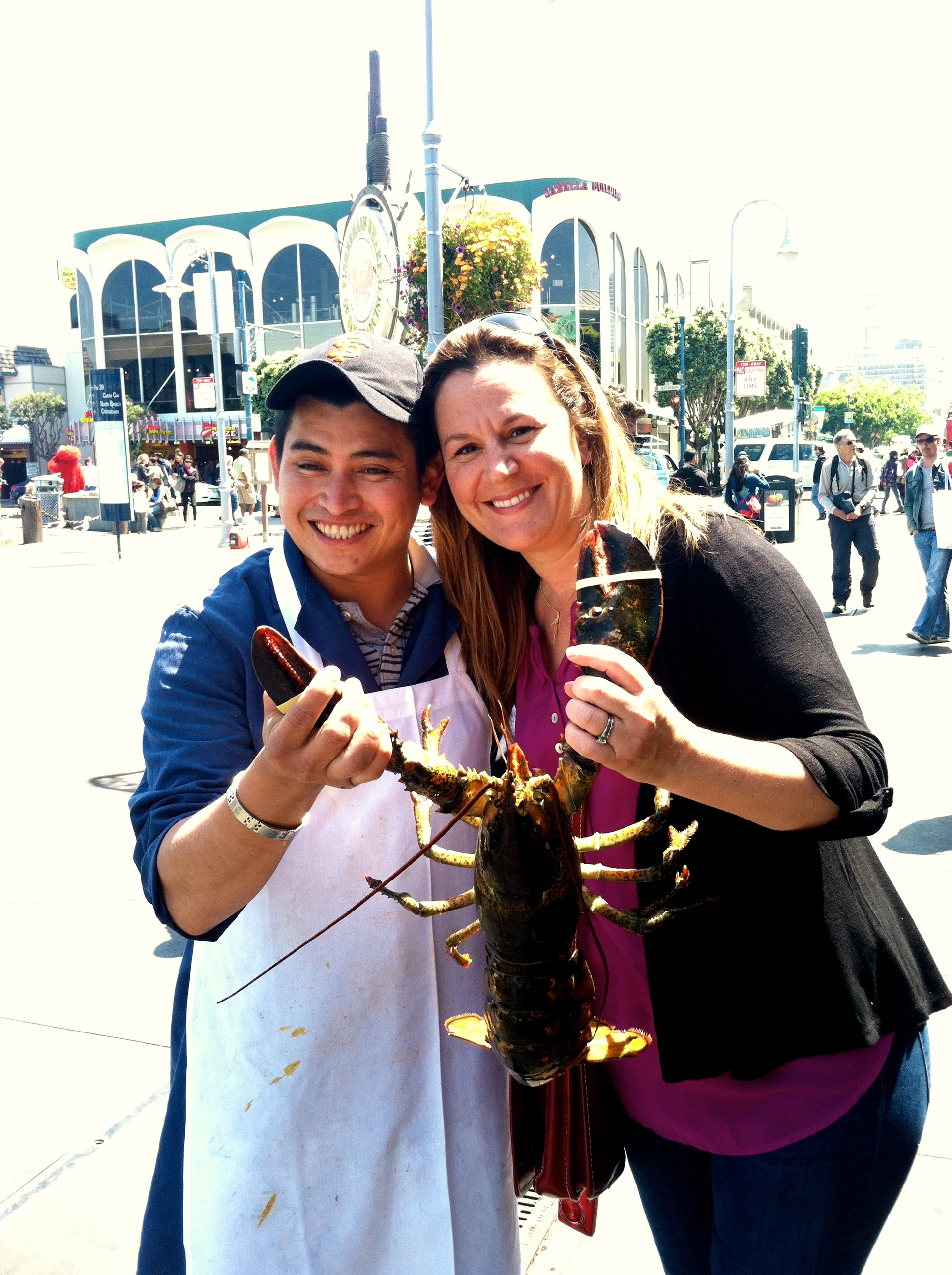 The Wharf was hopping.  Fishermen were bringing in the morning’s catch of salmon. Hungry seals poked their heads up between boats, hoping for a fishy bite. A couple of men played steel drums, and every now and then, a tour bus would honk its way by us. Everywhere we looked, someone was selling seafood- huge vats of live crabs, clam chowder in bread bowls, and the biggest lobster I’ve ever seen. After poking into a couple of shops, our grumbling tummies led us to a sunny table at Cioppino’s. Chowder, bay shrimp, crab, and a bowl of their signature dish fueled us for more shopping and touristy sightseeing.
