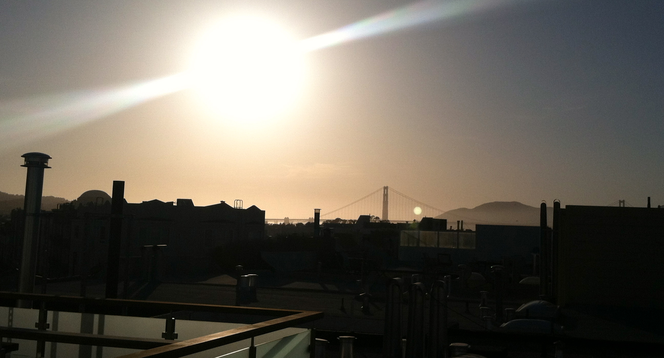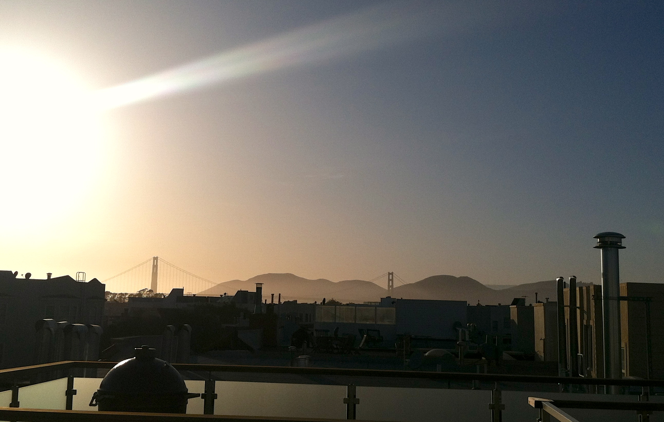 Holly talked me into doing her P90X workout video with her (ouch) before we got prettied up for our last night on the town. We browsed the guest book had there were a few mentions of the view of the Golden Gate Bridge from our apartment. After a confused lap around place, peering out all of the windows, we saw it: a (somewhat treacherous) ladder leading to the roof! The sun was setting and the light was warm and glowing. There she was, beyond the rooftops- the lovely Golden Gate. The view was such a surprise! I’m so glad we found it before we left.