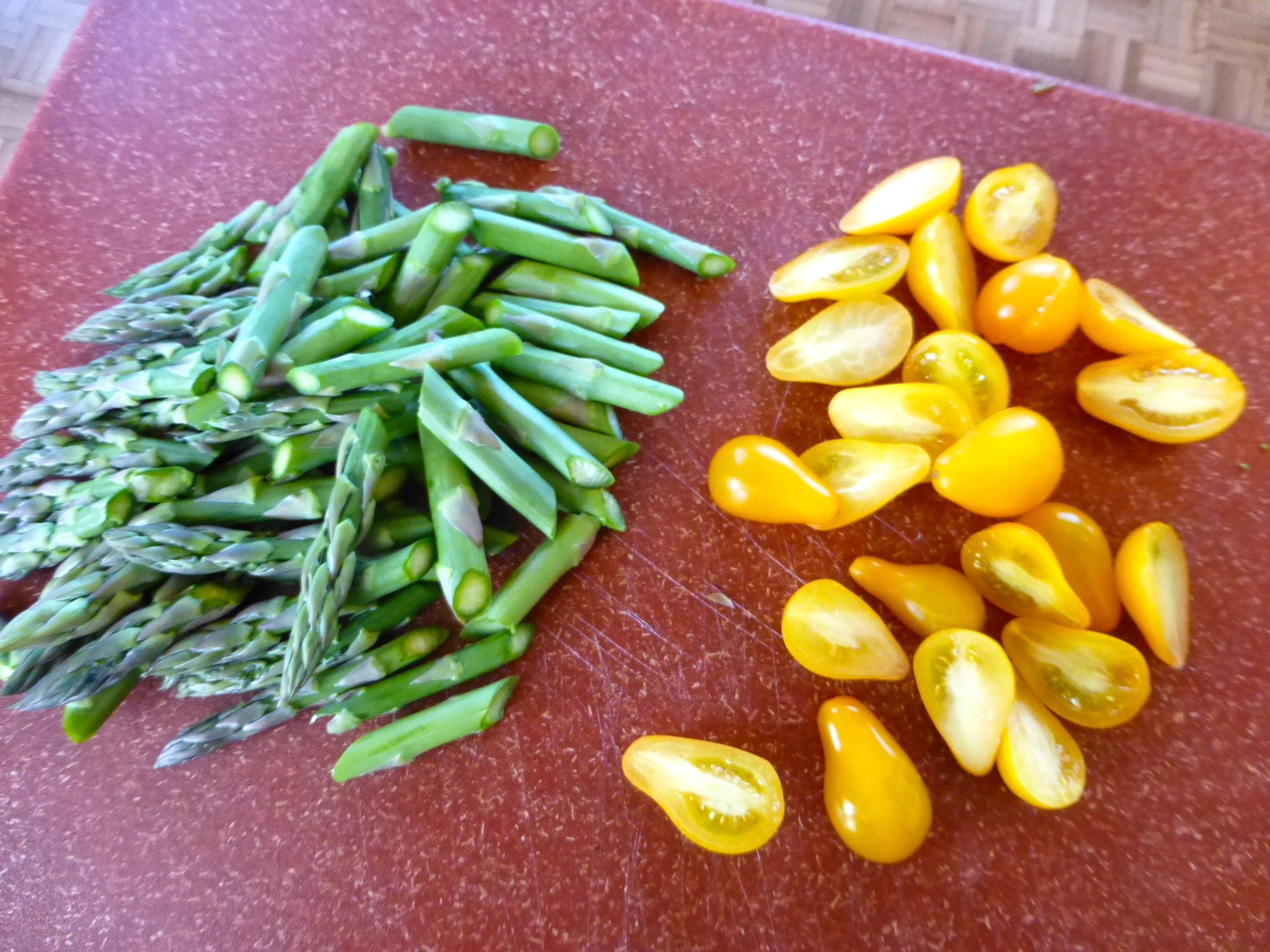 I also sliced some spring-y asparagus into one-inch pieces, halved some yellow cherry tomatoes, and zested a lemon. Cholula, realizing she doesn’t like asparagus after all, took to chewing on a tennis ball instead.