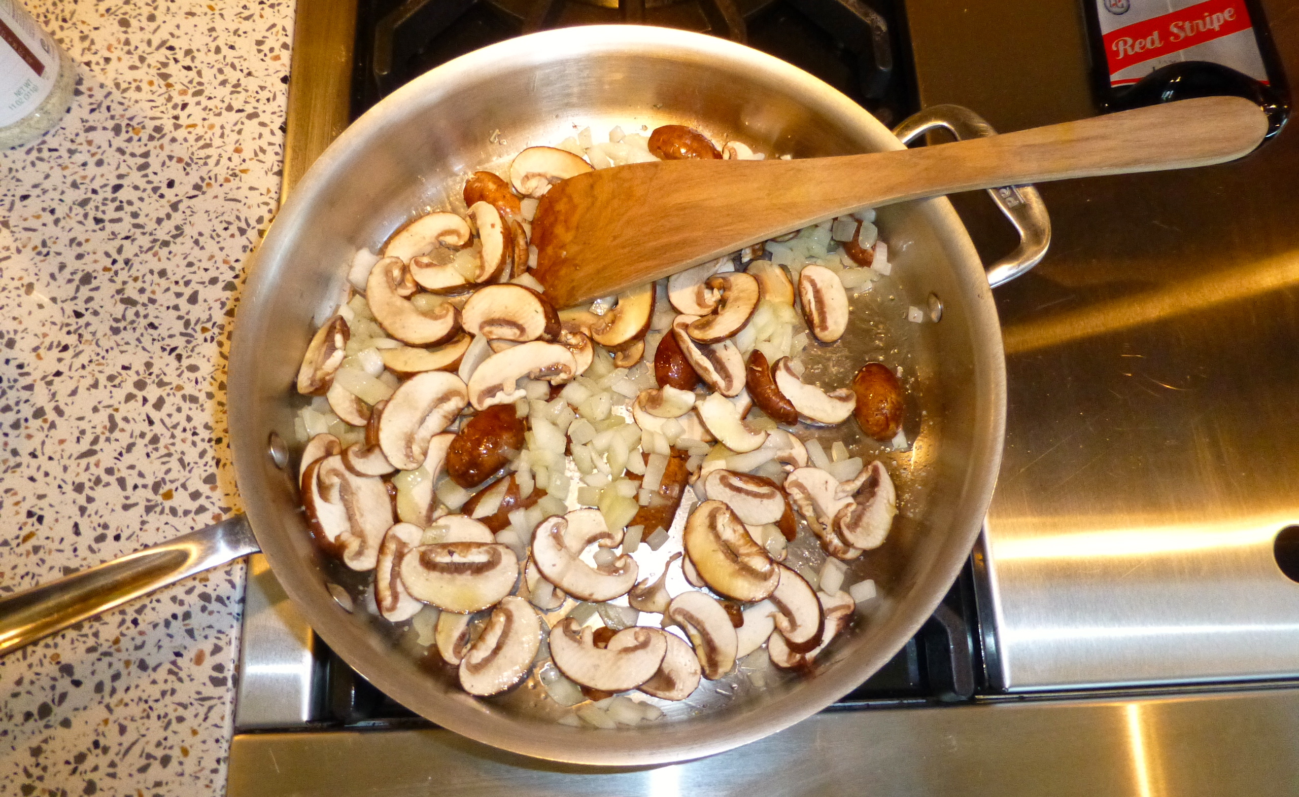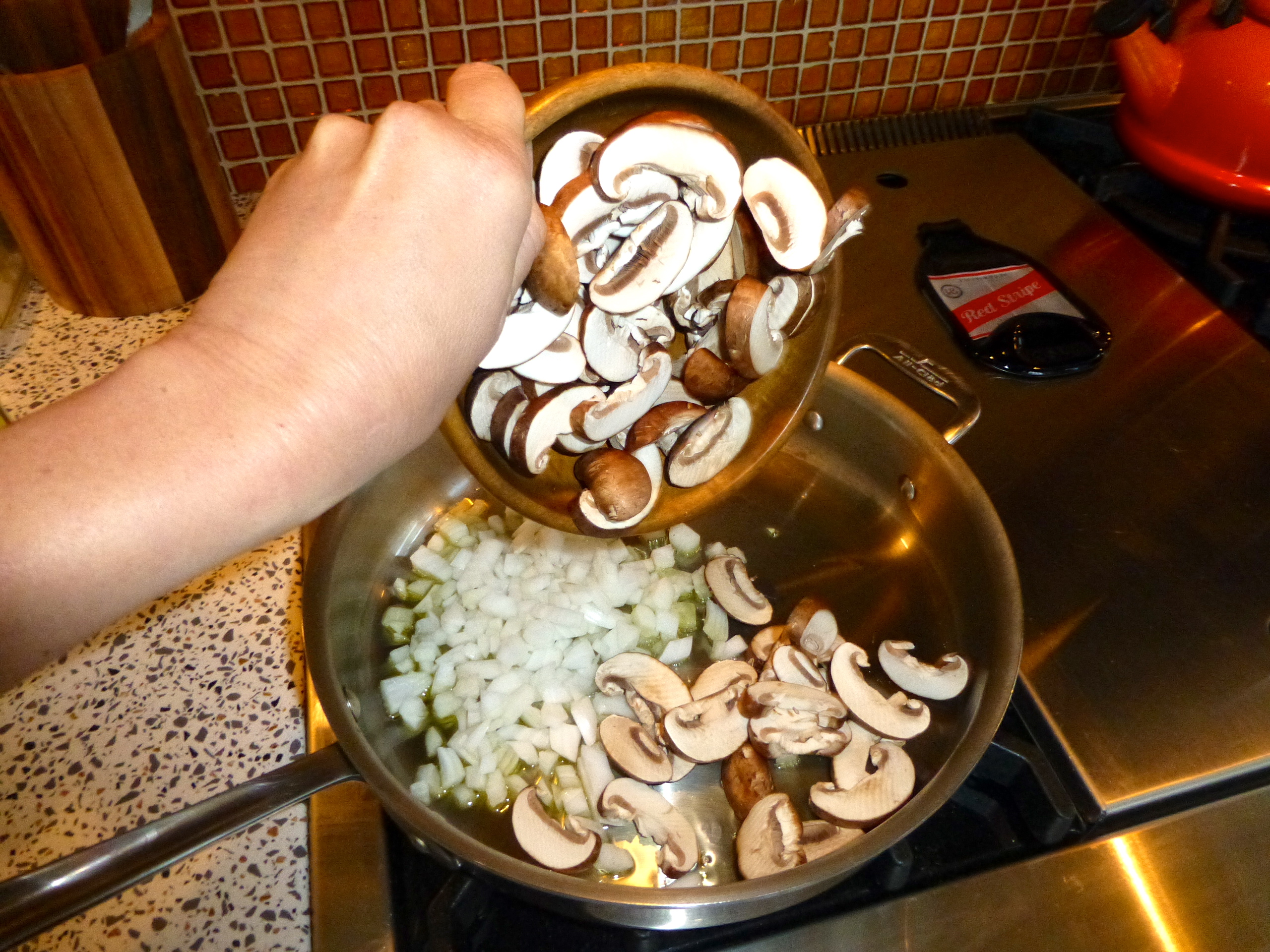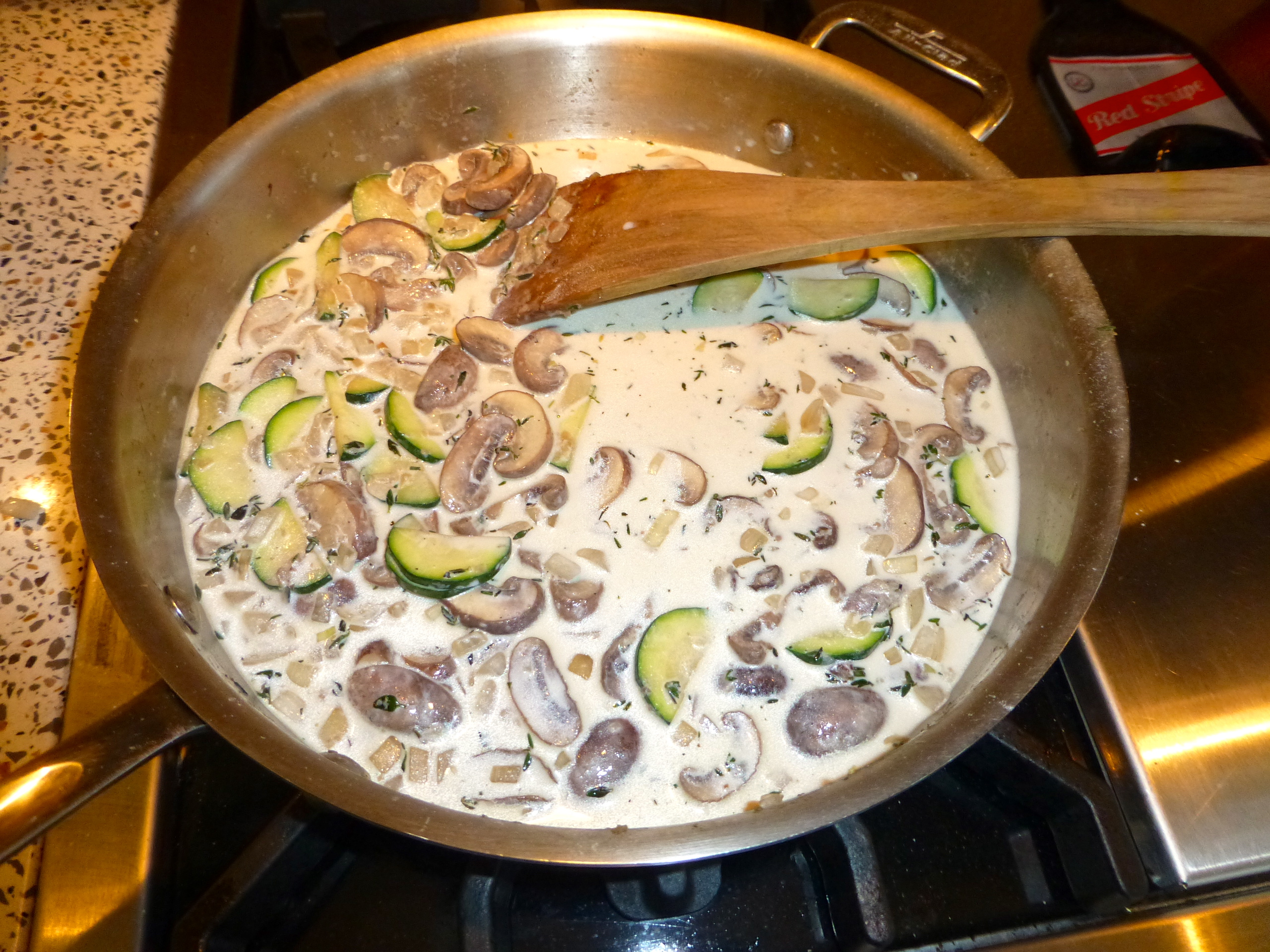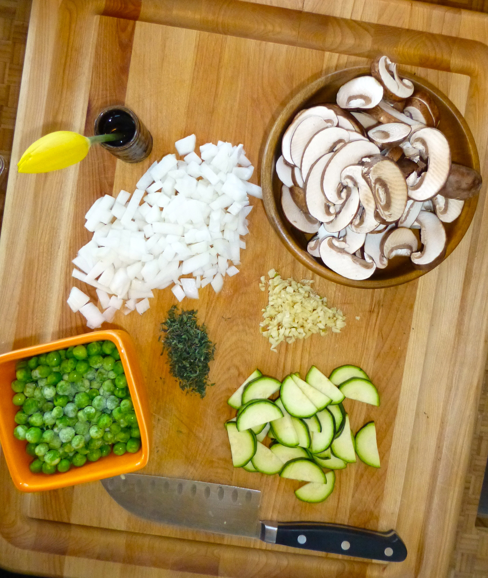 The recipe was in the magazine’s “Super Fast” section, which apparently also means “Super Easy.” The hardest part was the prep! I poured a glass of wine and got to choppin’– mushrooms, zucchini, garlic.