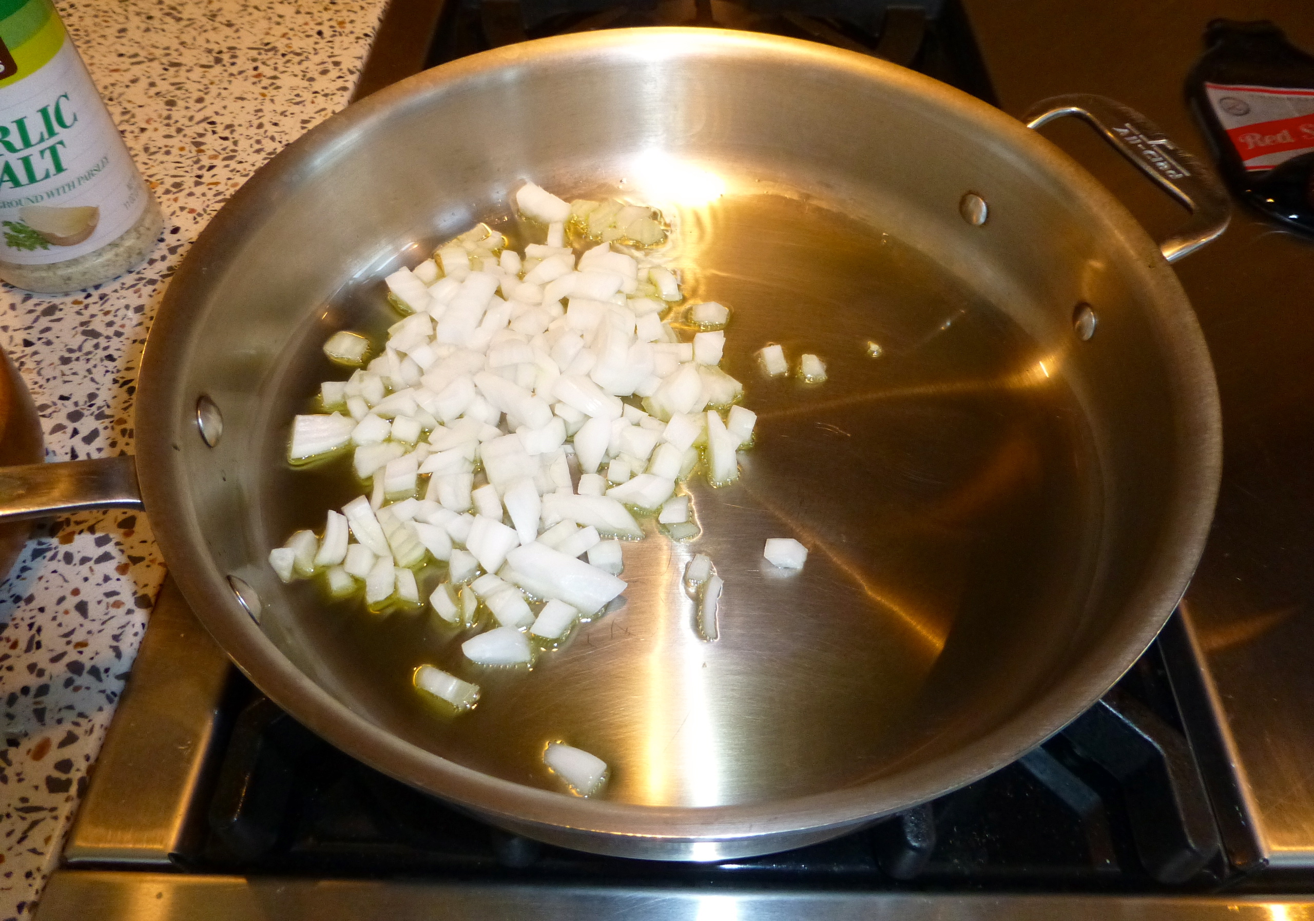 I was getting hungry, so I headed back inside. The pasta was boiling away, and I heated up some oil in a skillet. First, I sautéed the onion and mushrooms. I added the zucchini after a minute or two and made sure to season the veggies. I used my stand-by, garlic salt, along with black pepper and a few shakes of crushed red pepper.