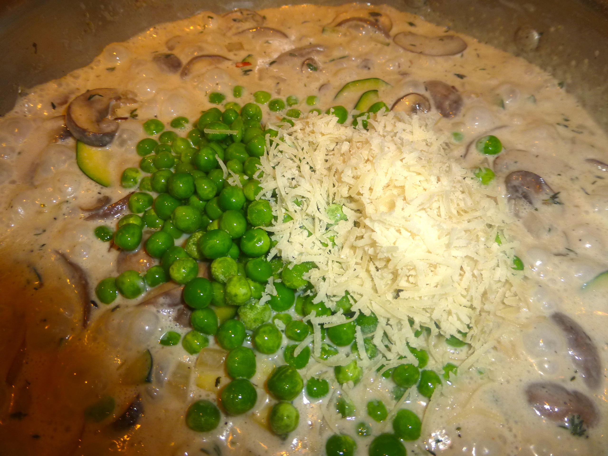 The sauce for the pasta is simply chicken broth and half-and-half, thickened with a little bit of flour and seasoned. While the pasta water came to a boil, I finished prepping the goods with some fresh chopped thyme, frozen peas, and a big pile of shredded Parmesan cheese.