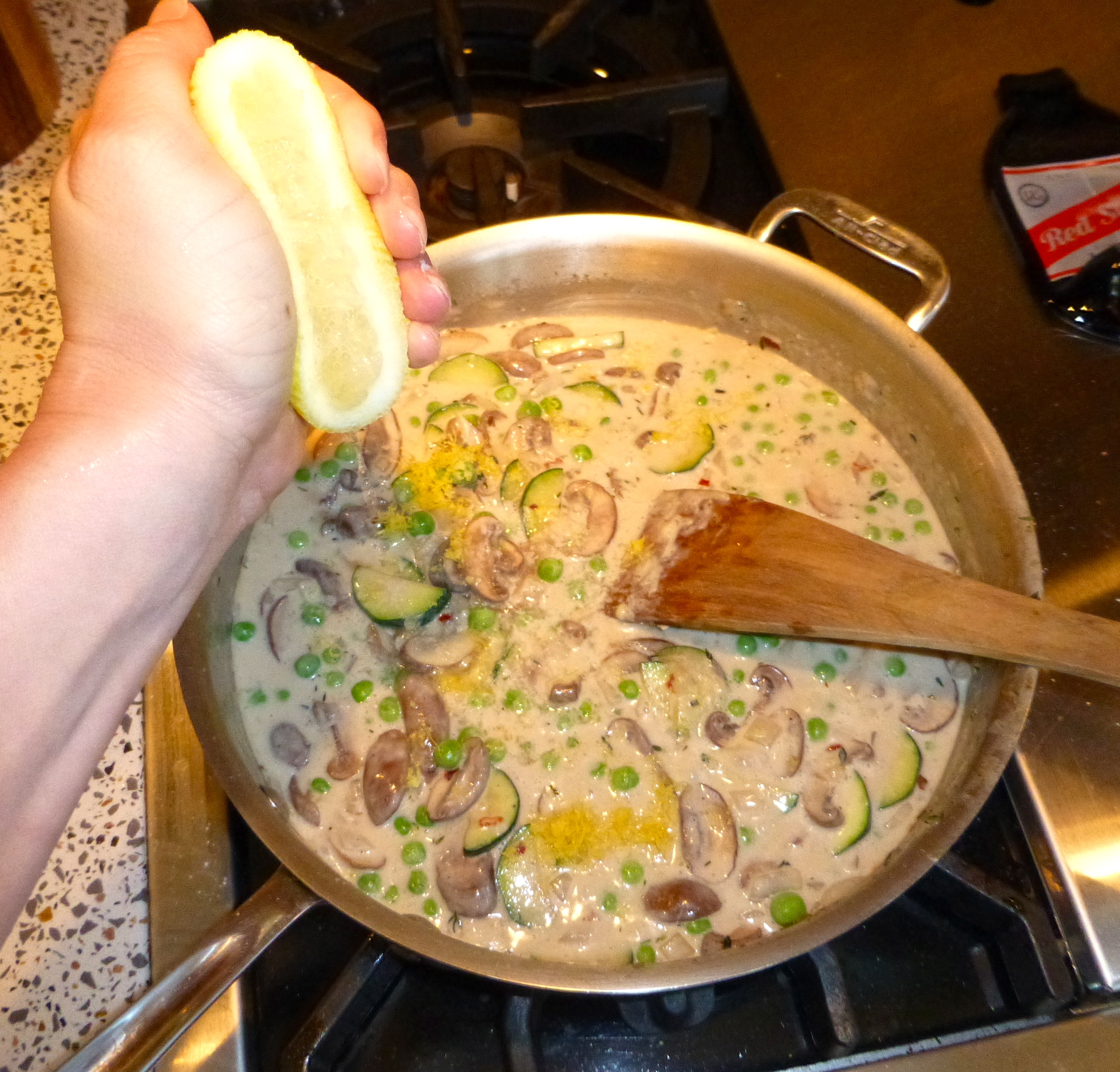 Once the sauce had thickened up a tad, in went the frozen peas and a handful of the parmesan cheese. Next came the lemon zest, and then I squeezed in the juice of half a lemon. With each addition, I let the sauce slightly simmer while I stirred.