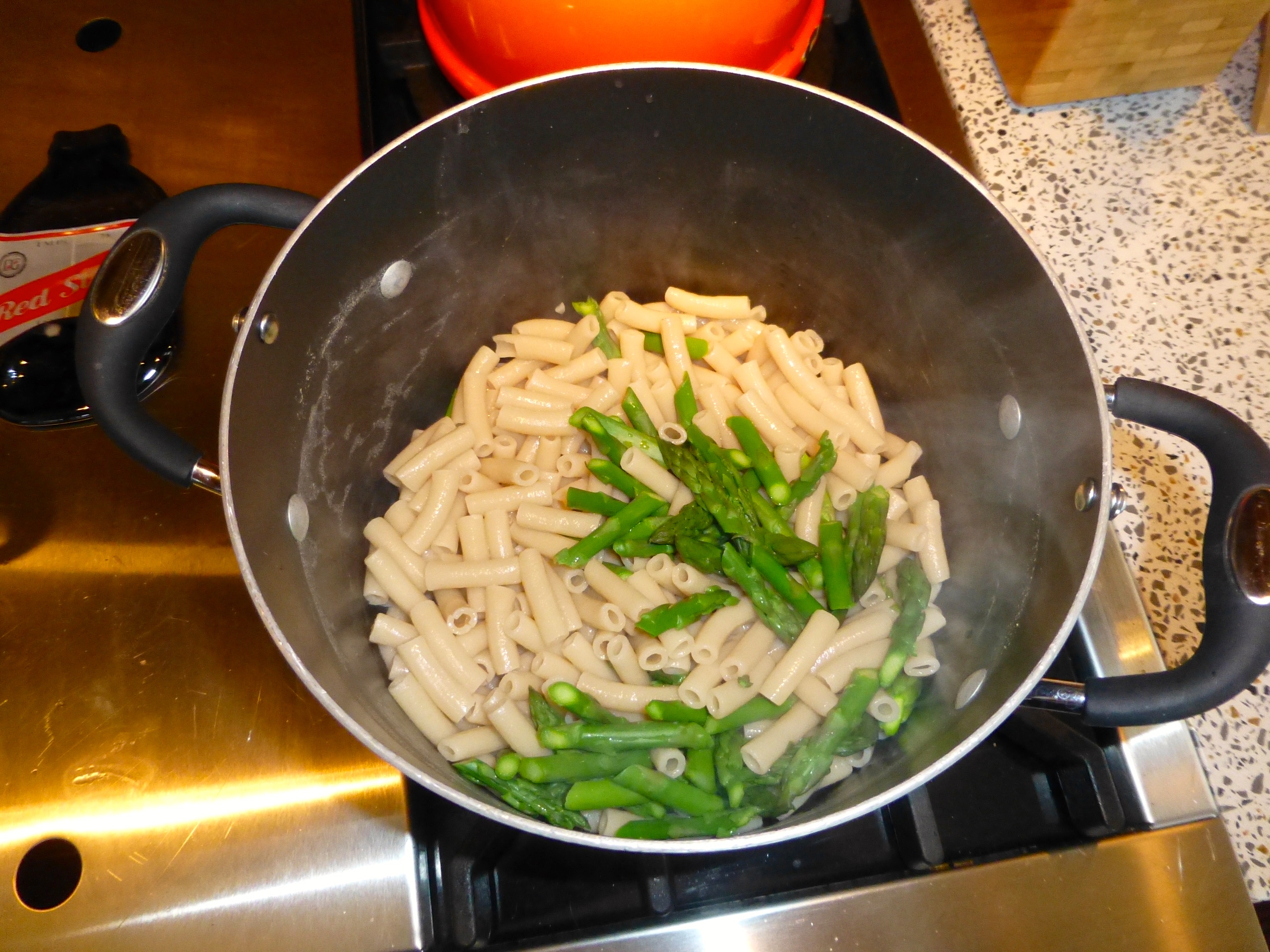 When the pasta was about 3 minutes from being done, I added the asparagus to the water to lightly cook it. I drained the pasta and asparagus and put it right back into the pot it came from.