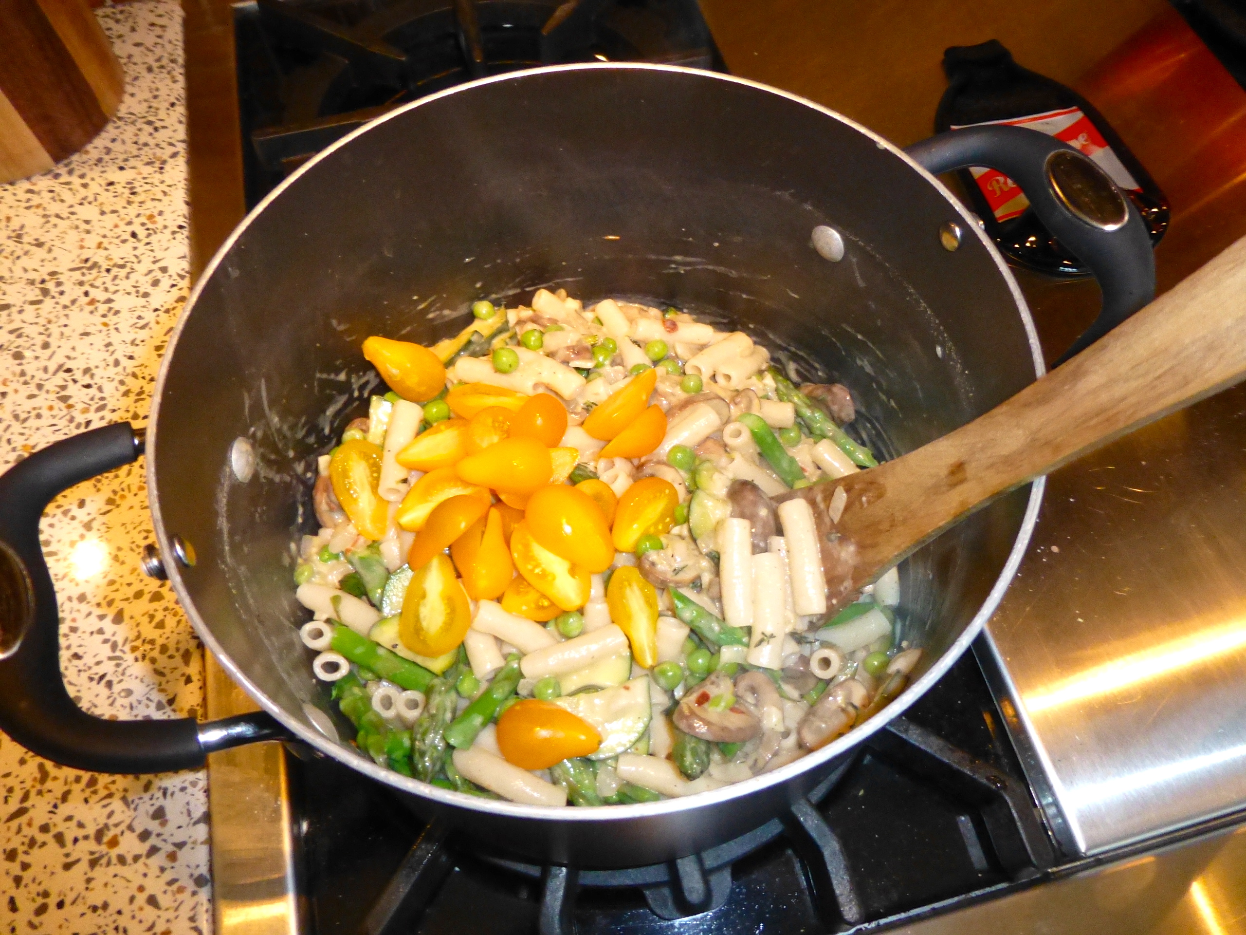 The sauce was ready, so I poured the whole thing into the pasta pot and stirred it all together into a creamy, veggie-filled mess. The last additions were the tomatoes and another handful of Parmesan cheese, and it was chow time!