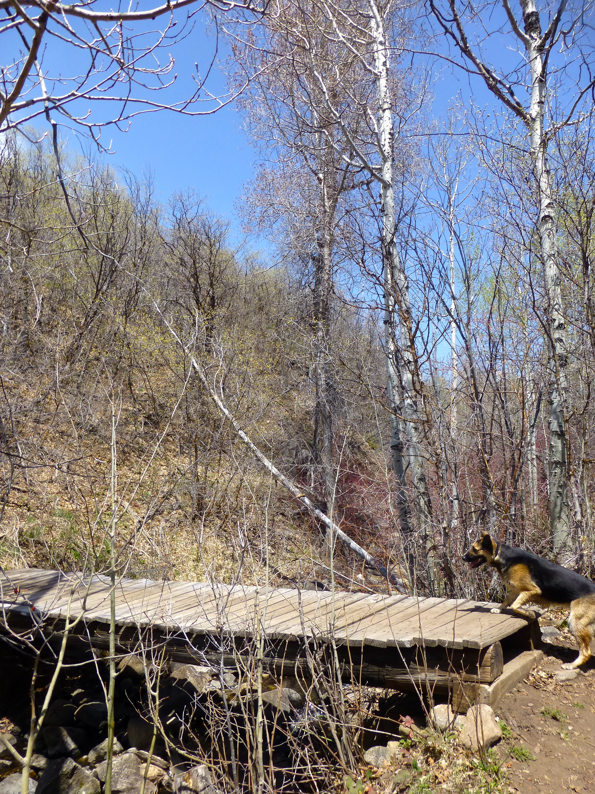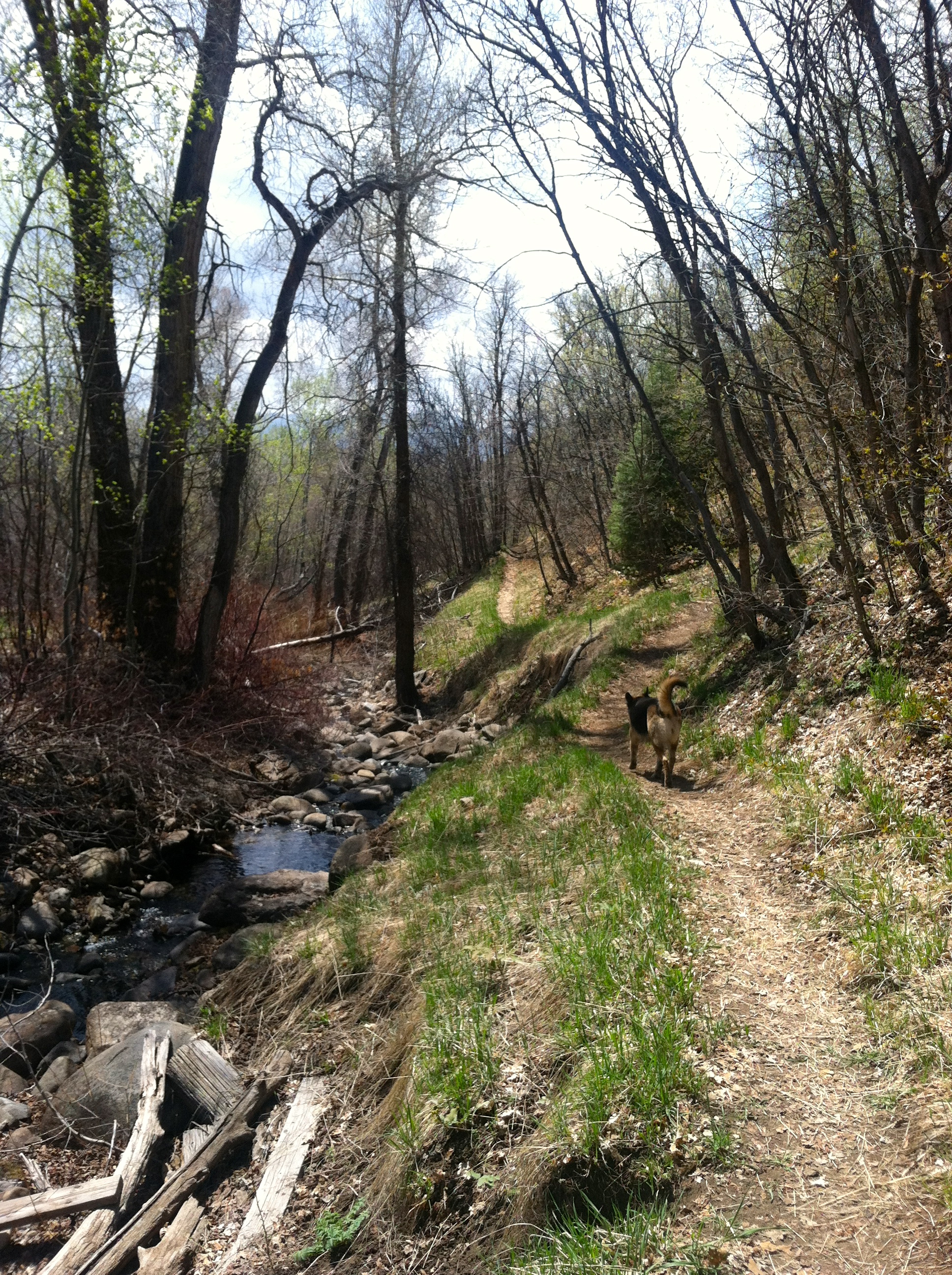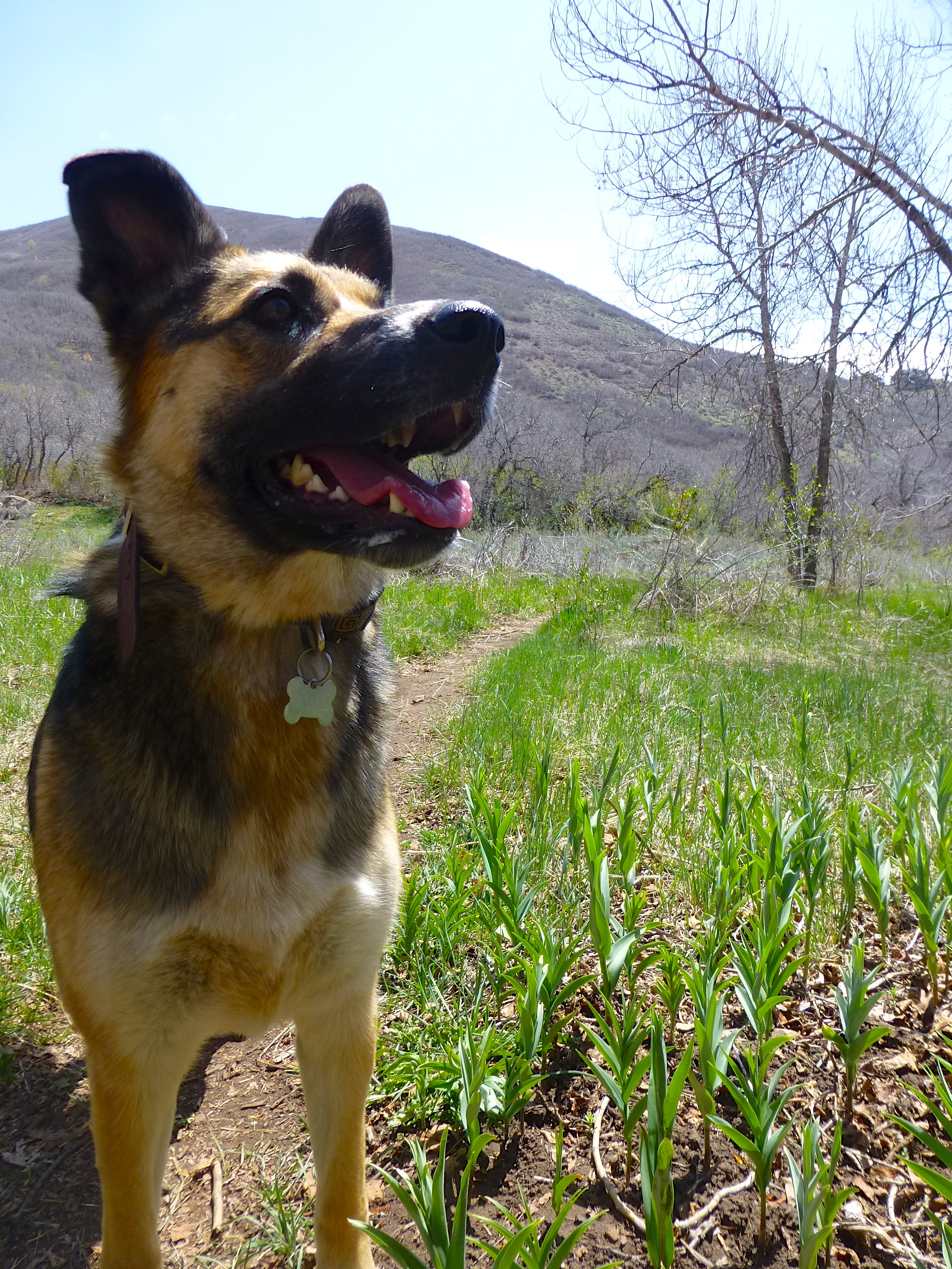 Green grass lined the trail, and new growth was sprouting all around us. Cholula’s nose went into overdrive. I stopped now and then to take photos of the springtime flowers or read one of the Wasatch Mountain State Park signs describing the native plants and trees. I had no idea where the trail would lead, but it was mostly shady and followed a trickling stream, so we kept going.