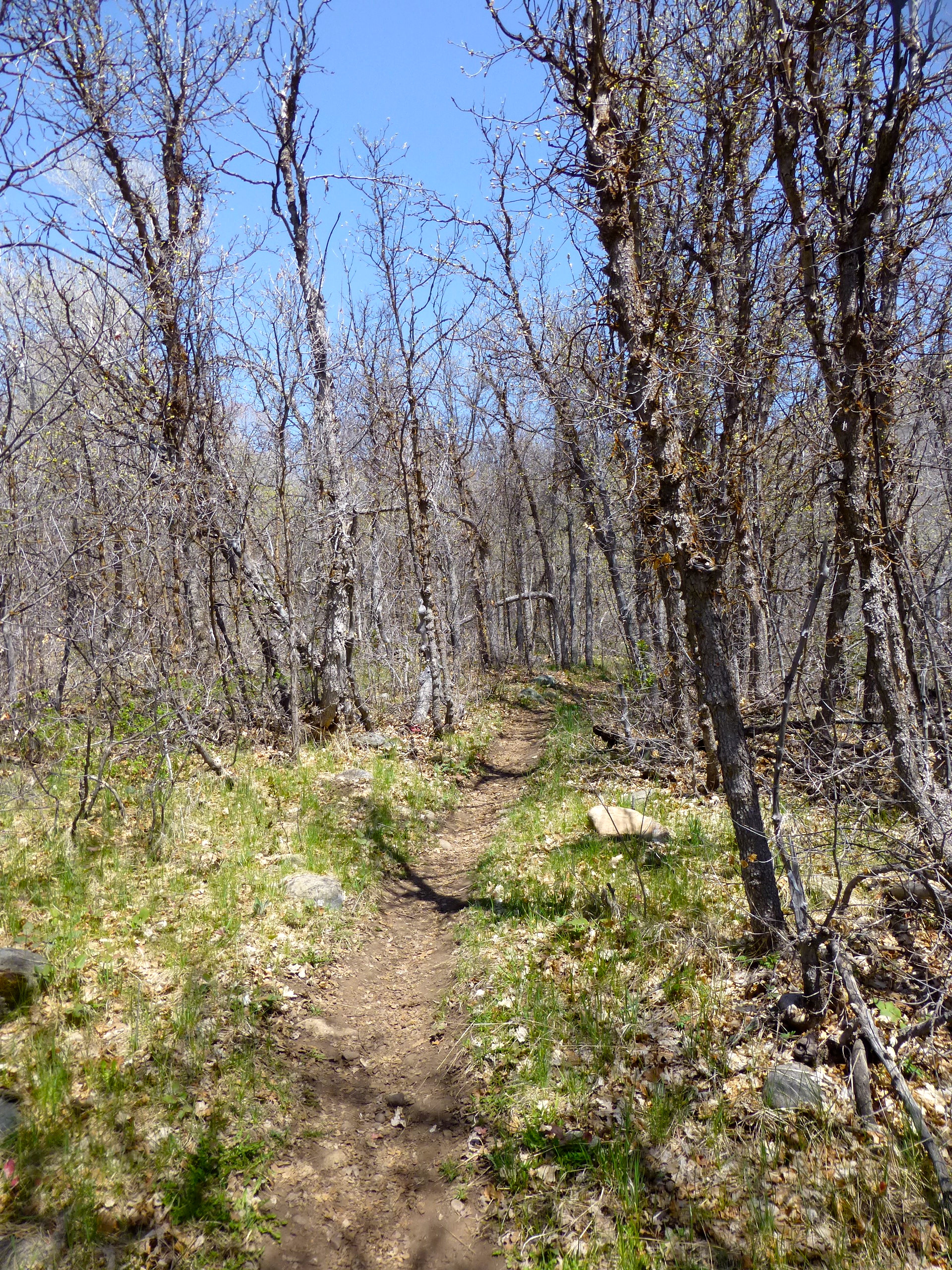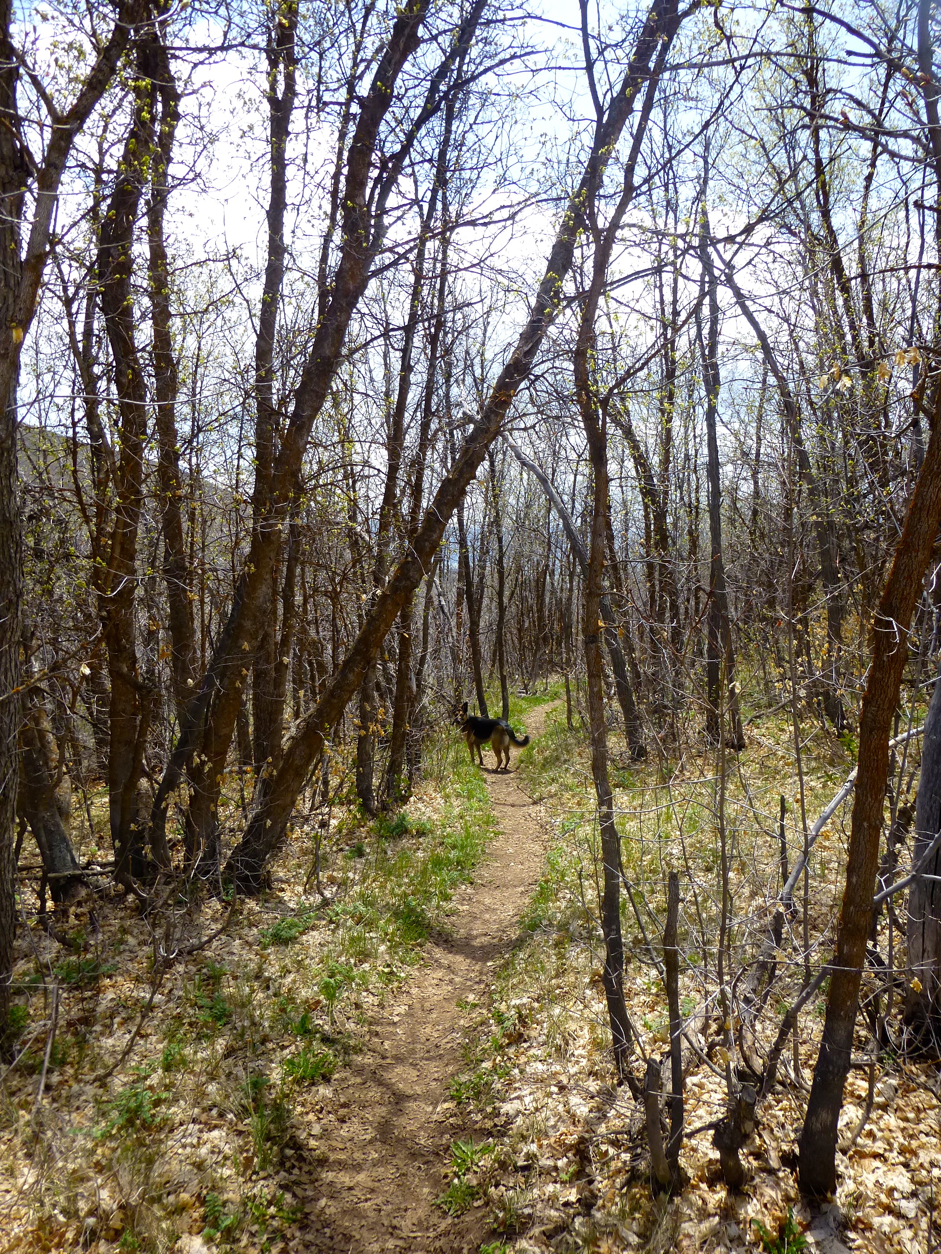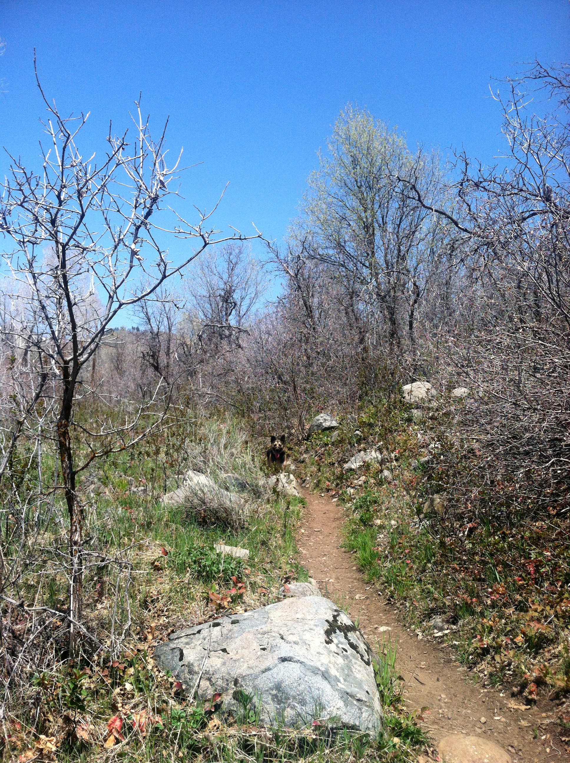 Green grass lined the trail, and new growth was sprouting all around us. Cholula’s nose went into overdrive. I stopped now and then to take photos of the springtime flowers or read one of the Wasatch Mountain State Park signs describing the native plants and trees. I had no idea where the trail would lead, but it was mostly shady and followed a trickling stream, so we kept going.