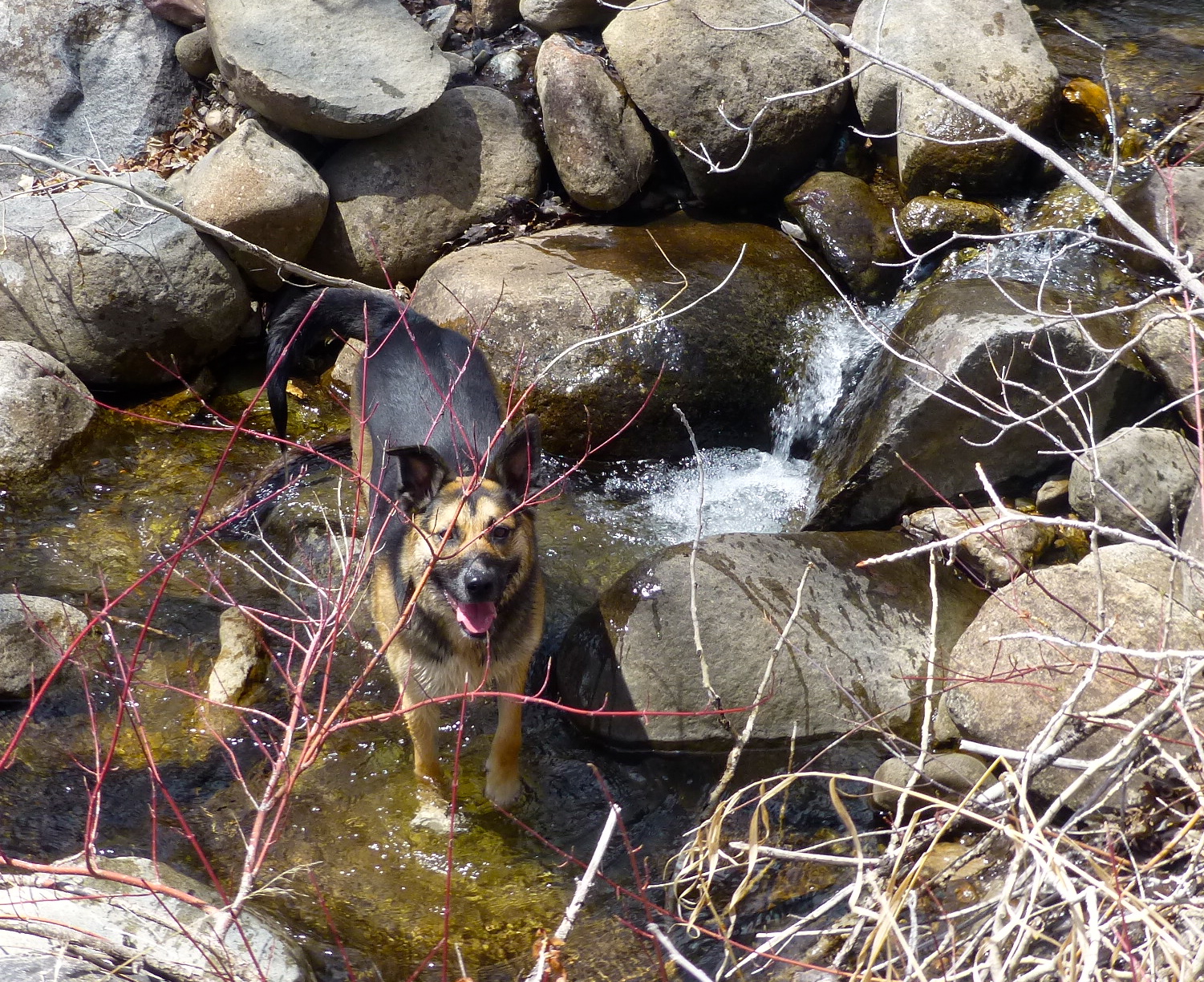 A kind woman named Chrissy passed by with an Australian Shepard fur-ball, stopping to chat while the dogs romped. She described her favorite loop to hike on this trail system before moving on. The sky was clear and blue, and Cholula waited patiently for her slow human to catch up. She led the way through grassy fields, over old wooden bridges, and through groves of trees just starting to display their green buds.