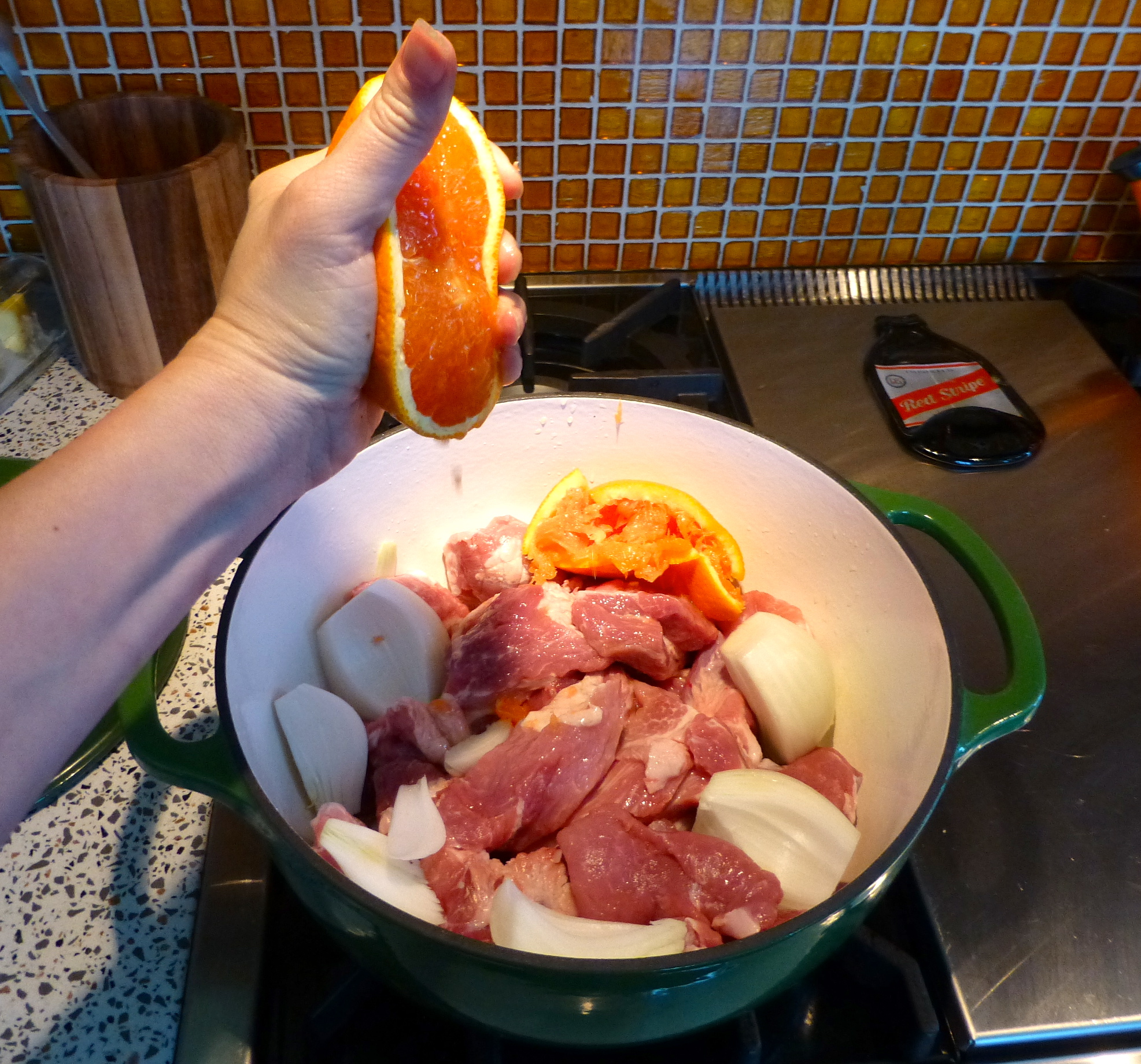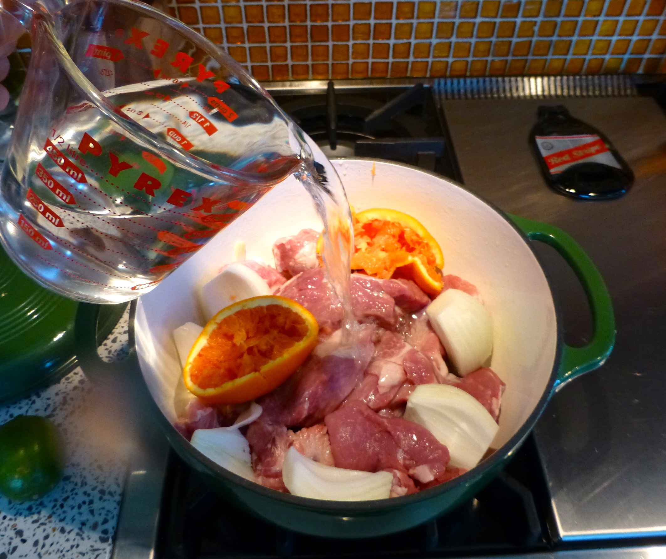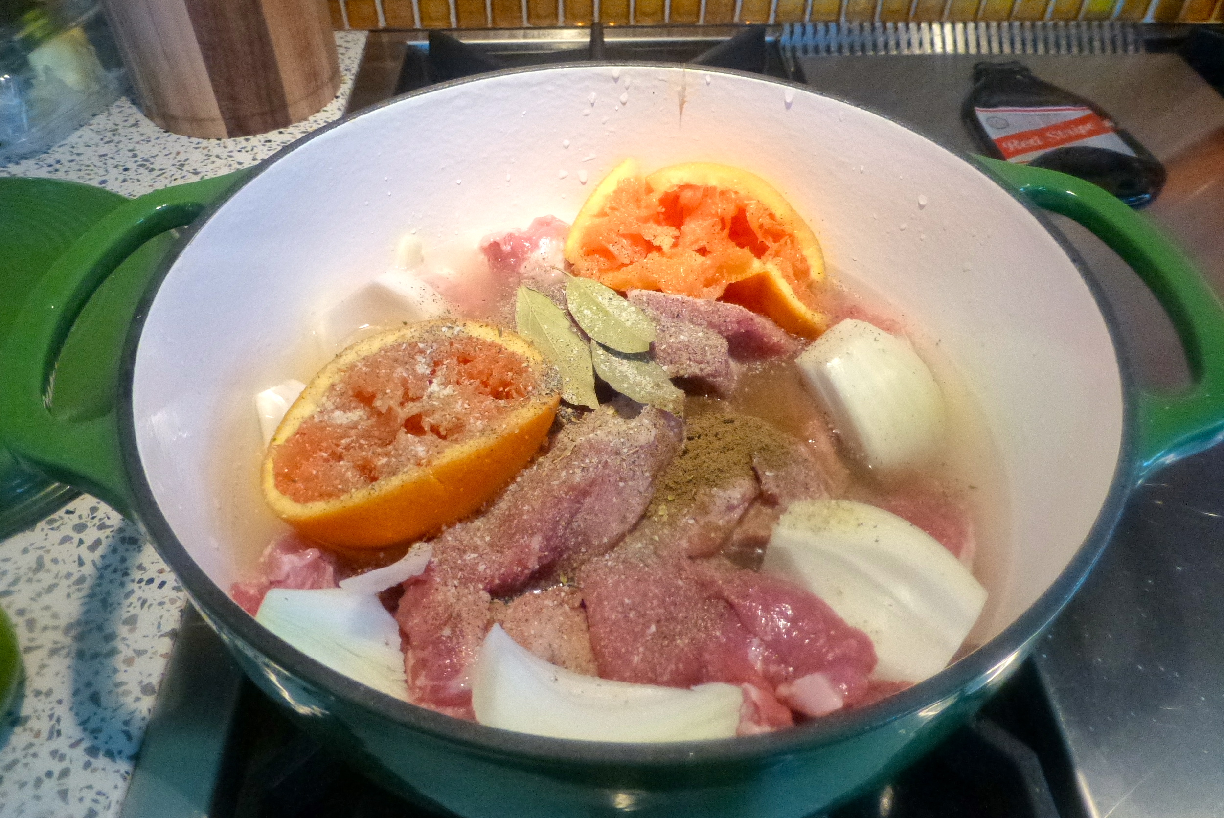 Next, I squeezed in the juice from an orange into the pot and tossed the peels right in, too. Some fresh lime juice followed, and then some water- enough to just about cover the meat. This was TOO EASY.